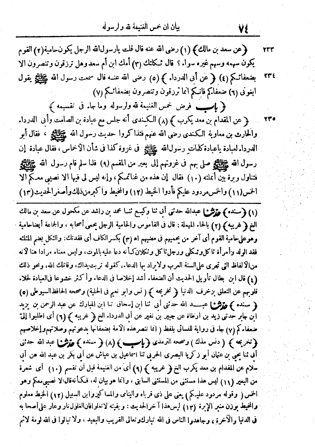 (سنده) حدثنا عبد الله حدثني أبي ثنا وكيع ثنا محمد بن راشد عن مكحول عن سعد بن مالك الخ (غريبة) بالحاء المهملة: قال في القاموس والحامية الرجل يحمي أصحابه، والجماعة أيضا حامية وهو على حامية القوم أي آخر من يحميهم في مضيهم اهـ بكسر الكاف أي فقدتك: والثكل بضم المثلثة فقد الولد وامرأة ثاكل وثكلى ورجل ثاكل وثكلان كأنه دعا عليه بالموت، وليس معناه مراد هنا لأنه من الألفاظ التي تجري على السنة العرب ولا يراد بها الدعاء، كقوله تربت يداك، وقاتلك الله، ونحو ذلك قال ابن بطال تأويل الحديث أن الضعفاء اشد إخلاصا في الدعاء وأكثر خشوعا في العبادة لخلاء قلوبهم عن التعليق بزخرف الدنيا (تخريجه) (نس وأبو نعيم في الحلية) وصححه الحافظ السيوطي (سنده) حدثنا عبد الله حدثني أبي ثنا ابن إسحاق ثنا ابن المبارك عن عبد الرحمن بن يزيد ابن جابر حدثني زيد بن أرطاة عن جبير بن نفير عن أي الدرداء الخ (غريبة) أي اطلبوا إلى ضعفائكم جاء في رواية للنسائي بلفظ (إنما تنصر هذه الأمة بضعفائها بدعوتهم وصلاتهم وإخلاصهم (تخريجه) (د نس مذ ك) وصححه الترمذي (باب) (سنده) حدثنا عبد الله حدثني أبي ثنا يحيى بن عثمان أبو زكريا البصري الحربي ثنا إسماعيل بن عياش عن أبي بكر بن عبد الله عن أبي سلام عن المقدام بن معد يكرب الخ (غريبة) أي من الغنيمة قبل أن تقسم أي شعرة من البعير ليس هذا مستثنى من المستثنى السابق، وإنما هو بيان له، فكأنه قال لا نصيبي معكم وهو الخمس (وقوله مردود عليكم) يعني على ذي قرباه واليتامى والمساكين وابن السبيل الخيط معلوم والخيط بوزن منبر الإبرة ليس هذا آخر الحديث: وبقيته لا تغلوا فإن الغلول نار وعار على أصحابه في الدنيا والآخرة، وجاهدوا الناس في الله تبارك وتعالى القريب والبعيد، ولا تبالوا في الله لومة لائم