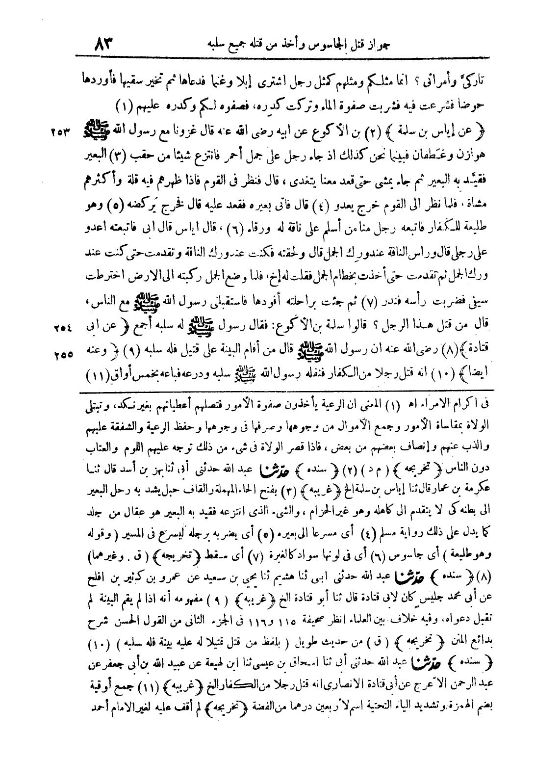 في إكرام الأمراء اهـ المعنى أن الرعية يأخذون صفوة الأمور فتصلهم أعطياتهم بغير نكد، وتبتلى الولاة بمقاسات الأمور وجمع الأموال من وجوهها وصرفها في وجوهها وحفظ الرعية والشفقة عليهم والذب عنهم وإنصاف بعضهم من بعض، فإذا قصر الولاة في شيء من ذلك توجه عليهم اللوم والعتاب دون الناس (تخريجه) (م د) (سنده) حدثنا عبد الله حدثني أبي ثنا بهز بن أسد قال ثنا عكرمة بن عماد قال ثنا إياس بن سلمة الخ (غريبة بفتح الحاء المهملة، والقاف حبل يشد به رحل البعير إلى بطنه كي لا يتقدم إلى كاهله وهو غير الحزام، والشيء الذي انتزعه فقيد به البعير هو عقال من جلد كما يدل على ذلك رواية مسلم أي مسرعا إلى بعيره أي يضربه برجله ليسرع في المسير (وقوله وهو طليعة) أي جاسوس أي في لونها سواد كالغبرة أي سقط (تخريجه) (ق. وغيرهما) (سنده) حدثنا عبد الله حدثني أبي ثنا هشيم ثنا يحيى بن سعيد عن عمرو بن كثير بن أفلح عن أبي محمد الجليس كان لأبي قتادة قال ثنا أبو قتادة الخ (غريبة) مفهومه أنه إذا لم يقم البينة لم تقبل دعواه، وفيه خلاف بين العلماء انظر صحيفة 115 116 في الجزء الثاني من القول الحسن شرح بدائع المنن (تخريجه) (ق) من حديث طويل (بلفظ من قتل قتيلا عليه بينة فله سلبه) (سنده) حدثنا عبد الله حدثني أبي ثنا إسحاق بن عيسى ثنا ابن لهيعة عن عبد الله بن أبي جعفر عن عبد الرحمن الأعرج عن أبي قتادة الأنصاري أنه قتل رجلا من الكفار الخ (غريبة) جمع أوقية بضم الهمزة وتشديد الياء التحتية اسم لأربعين درهما من الفضة (تخريجه) لم أقف عليه لغير الإمام أحمد