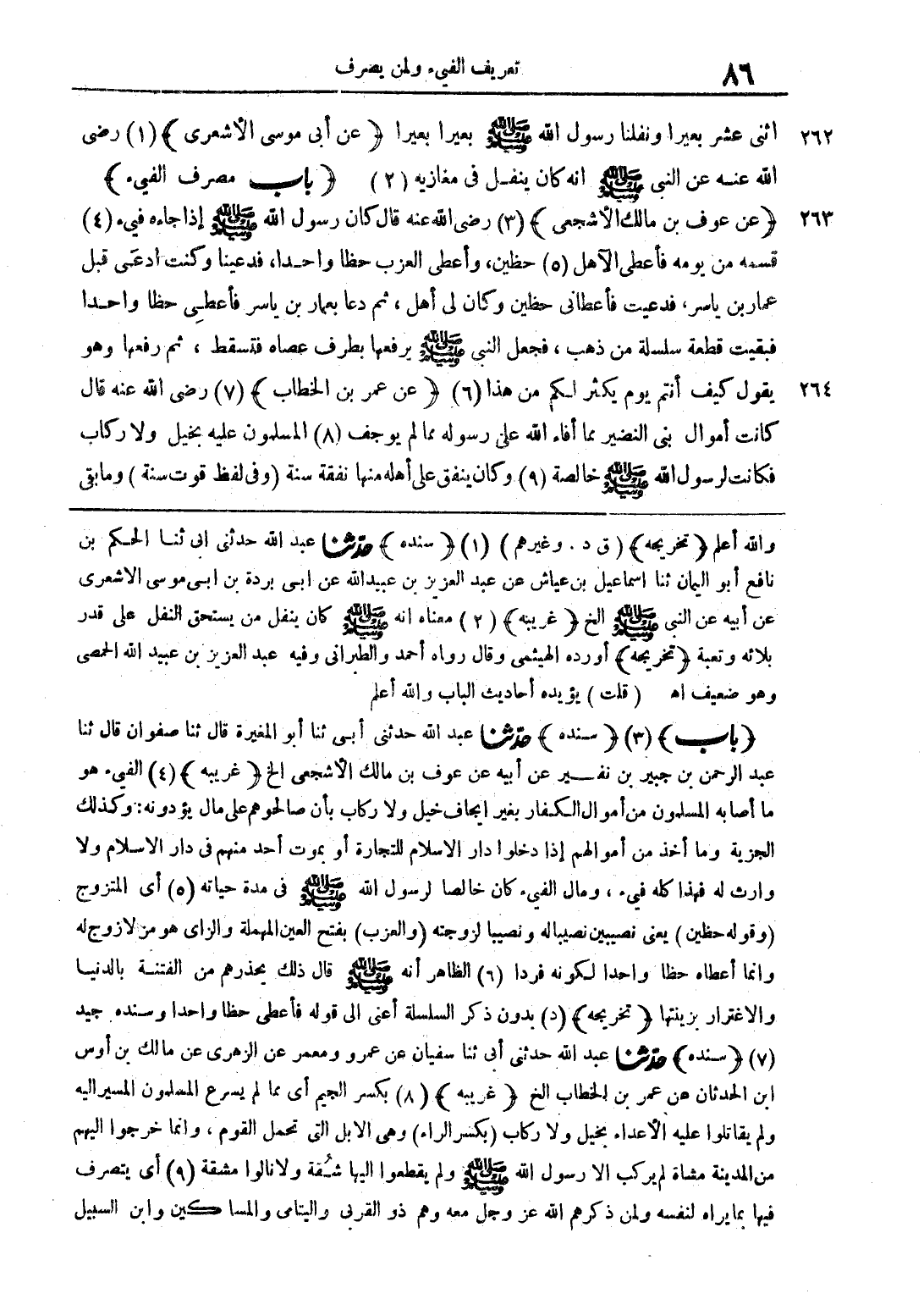 (باب) (سنده) حدثنا عبد الله حدثني أبي ثنا أبو المغيرة قال ثنا صفوان قال ثنا عبد الرحمن بن جبير بن نفير عن أبيه عن عوف بن مالك الأشجعي الخ (غريبة) الفيء هو ما أصابه المسلمون من أموال الكفار بغير ايجاف خيل ولا ركاب بأن صالحوهم على مال يؤدونه وكذلك الجزية وما أخذ من أموالهم إذا دخلوا دار الإسلام للتجارة أو يموت أحد منهم في دار الإسلام ولا وارث له فهذا كله فيء، ومال الفيء كان خالصا لرسول الله صلى الله عليه وسلم في مدة حياته أي المتزوج (وقوله حظين) يعني نصيبين نصيبا له لزوجته (والعزب) بفتح العين المهملة والزاي وهو من لا زوج له وإنما أعطاه حظا واحدا لكونه فردا الظاهر أنه صلى الله عليه وسلم قال ذلك يحذرهم من الفتنة بالدنيا والاغترار بزينتها (تخريجه) (د) بدون ذكر السلسلة أعني إلى قوله فأعطى حظا واحدا وسنده جيد (سنده) حدثنا عبد الله حدثني أبي سفيان عن عمرو ومعمر عن الزهري عن مالك بن أو ابن الحدثان عن عمر بن الخطاب الخ (غريبة) بكسر الجيم أي مما لم يسرع المسلمون المسير إله ولم يقاتلوا عليه الأعداء بخيل ولا ركاب (بكسر الراء) وهي الإبل التي تحمل القوم، وإنما خرجوا إليه من المدينة مشاة لم يركب إلا رسول الله صلى الله عليه وسلم ولم يقطعوا إليها شقة ولا نالوا مشقة أي يتصرف فيها بما يراه لنفسه ولمن ذكرهم الله عز وجل معه وهم ذو القربى واليتامى والمساكين وابن السبيل