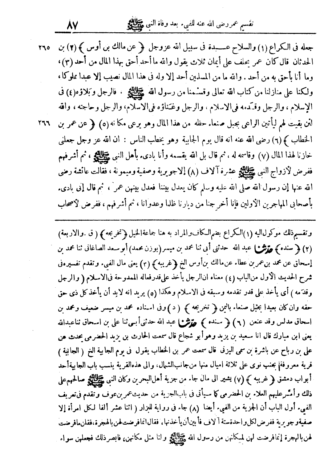وتقسيم ذلك موكول إليه الكراع بضم الكاف والمراد به هنا جماعة الخيل (تخريجه) (ق. والأربعة) (سنده) حدثنا عبد الله حدثني أبي ثنا محمد بن ميسر (بوزن محمد) أبو سعد الصاغاني ثنا محمد بن إسحاق عن محمد بن عمر بن عطاء عن مالك بن أوس الخ (غريبة) يعني مال الفيء وتقدم تفسيره في شرح الحديث الأول من الباب معناه أن الرجل يأخذه على قدر ما فعاله الممدوحة في الإسلام (والرجل وقدمه) أي يأخذ على قدر تقدمه وسبقه في الإسلام وهكذا يريد أنه لا بد أن يأخذ كل ذي حق حقه وان كان بعيدا بجبل صنعاء باليمين (تخريجه) (د) وفي إسناده محمد بن ميسر ضعيف ومحمد بن إسحاق مدلس وقد عنعن (سنده) حدثنا عبد الله حدثني أبي ثنا علي ابن إسحاق ثنا عبد الله يعني ابن مبارك قال أنا سعيد بن يزيد وهو أبو شجاع قال سمعت الحارث بن يزيد الحضرمي يحدث عن علي ابن رباح عن باشر بن سمرة اليزني قال سمعت عمر بن الخطاب يقول في يوم الجابية الخ (الجابية) قرية معروفة بجنب نوى على ثلاثة أميال منها من جانب الشمال، وإلى هذه القرية ينسب باب الجابية أحد أبواب دمشق (غريبة) يشير إلى مال جاء من جزية أهل البحرين وكان النبي صلى الله عليه وسلم صالحهم على ذلك وأمر عليهم العلاء بن الحضرمي كما سيأتي في باب الجزية من حديث عمر ابن عوف وتقدم في تعريف الفيء أول الباب أن الجزية من الفيء أيضا جاء في رواية للبزار (اثني عشر ألفا لكل امرأة إلا صفية وجويرية ففرض لكل واحدة ستة آلاف فا بين أن يأخذنها، فقال إنما فرضت لهن بالهجرة، فقلن ما فرضت لهن بالهجرة إنما فرضت لهن لمكانهن من رسول الله صلى الله عليه وسلم ولنا مثل مكانهن، فأبصر فجعلهن سواء