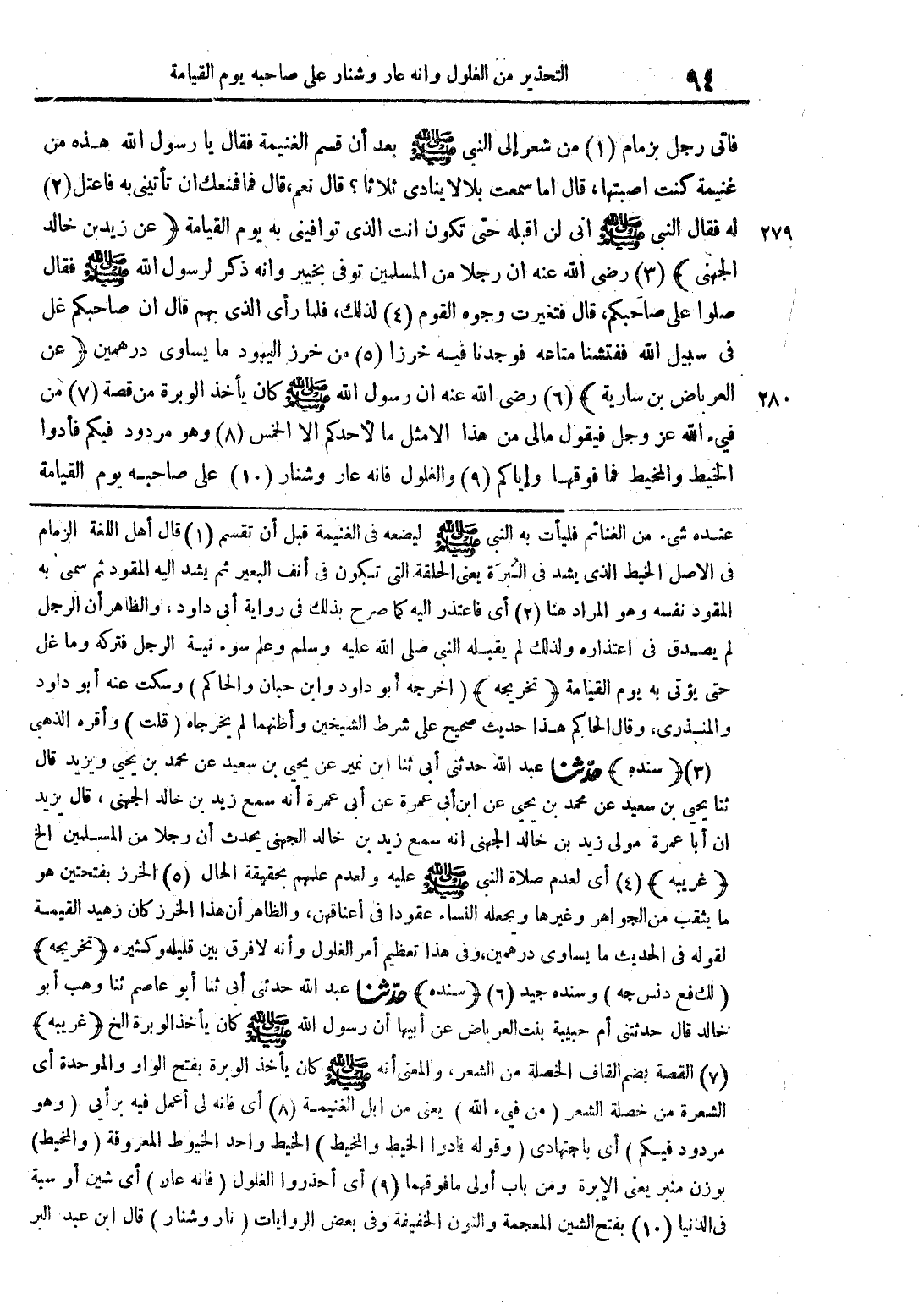 عنده شيء من الغنائم فليأت به النبي صلى الله عليه وسلم ليضعه في الغنيمة قبل أن تقسم قال أهل اللغة الزمام في الأصل الخيط الذي يشد في البرة يعني الحلقة التي تكون في أنف البعير ثم يشد إليه المقصود ثم سمى به المقصود نفسه وهو المراد هنا أي فاعتذر إليه كما صرح بذلك في رواية أبي داود، والظاهر أن الرجل لم يصدق في اعتذاره ولذلك لم يقبله النبي صلى الله عليه وسلم وعلم سوء نية الرجل فتركه وما غل حتى يؤتى به يوم القيامة (تخريجه) (أخرجه أبو داود وابن حبان والحاكم) وسكت عنه أبو داود والمنذري، وقال الحاكم هذا حديث صحيح على شرط الشيخين وأظنهما لم يخرجاه (قلت) وأقره الذهب (سنده) حدثنا عبد الله حدثني أبي ثنا ابن نمير عن يحيى بن سعيد عن محمد بن يحيى ويزيد قال ثنا يحيى بن سعيد بن محمد بن يحيى عن ابن أبي عمرة أنه سمع أنه سمع زيد بن خالد الجهني، قال يزيد أن أبا عمرة مولى زيد بن خالد الجهني أنه سمع زيد خالد الجهني يحدث أن رجلا من المسلمين الخ (غريب) أي لعدم صلاة النبي صلى الله عليه وسلم عليه لا ولعدم علمهم بحقيقية الحال الخرز بفتحتين هو ما يثقب من الجواهر وغيرها ويجعله النساء عقودا في أعناقهن، والظاهر أن هذا الخرز كان زهيد القيمة لقوله في الحديث ما يساوي درهمين، وفي هذا تعظيم أمر الغلول وأنه لا فرق بين قليله وكثيرة (تخريجه) (لك فع د نس جه) وسنده جيد (سنده) حدثنا عبد الله حدثني أبي ثنا أبو عاصم ثنا وهب أبو خالد قال حدثتني أمك حبيبة بنت العرباض عن أبيها أن رسول الله صلى الله عليه وسلم كان يأخذ الوبرة الخ (غريبة) القصة بضم القاف الخصلة من الشعر، والمعنى أنه صلى الله عليه وسلم كان يأخذ الوبرة بفتح الواو والموحدة أي الشعرة من خصلة الشعر (من فيء الله) يعني إبل الغنيمة أي فإنه لي أعمل فيه برأيي (وهو مردود فيكم) أي باجتهادي (وقوله فادوا الخيط والمخيط) الخيط واحد الخيوط المعروفة (والمخيط) بوزن منبر يعني الإبرة ومن باب إلى ما فوقهما أي احذروا الغلول (فإنه عار) أي شين أو سبة في الدنيا بفتح الشين المعجمة والنون الخفيفة وفي بعض الروايات (نار وشنار) قال ابن عبد البر