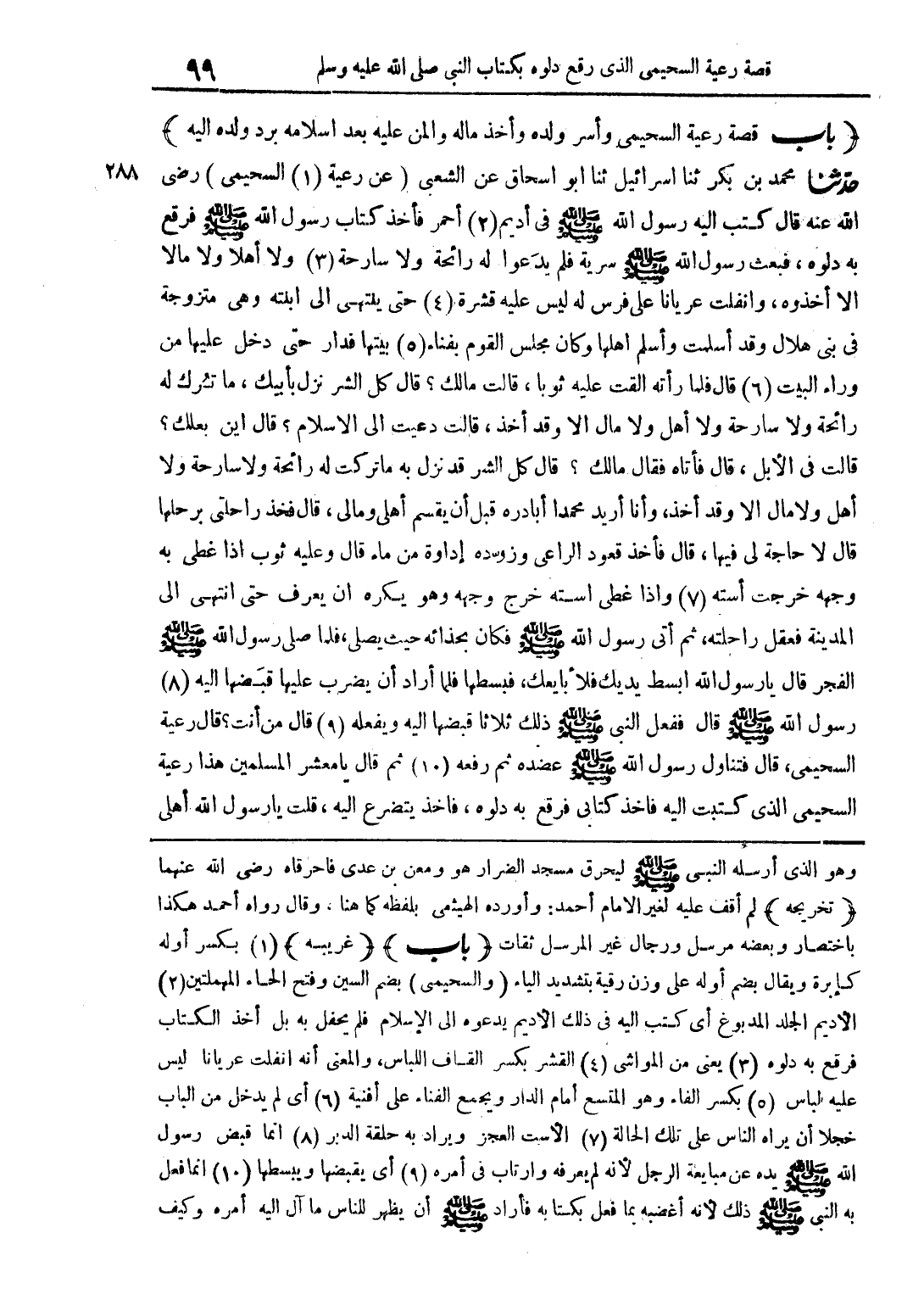 (باب قصة رعية السحيمي وأسر ولده وأخذ ماله والمن عليه بعد إسلامه برد ولده إليه) حدثنا محمد بن بكي ثنا إسرائيل ثنا إسحاق عن الشعبي (عن رعية السحيمي) رضي الله عنه قال كتب إليه رسول الله صلى الله عليه وسلم في أديم أحمر فأخذ كتاب رسول الله صلى الله عليه وسلم فرقع به دلوه، فبعث رسول الله صلى الله عليه وسلم سرية فلم يدعوا له رائحة ولا سارحة ولا أهلا ولا مالا إلا أخذوه، وانفلت عريانا على فرس له ليس عليه قشرة حتى ينتهي إلى ابنته وهي متزوجة في بني هلال وقد أسلمت وأسلم أهلها وكان مجلس القوم بفناء بيتها فدار حتى دخل عليها من وراء البيت قال فلما رأته ألقت عليه ثوبا، قالت مالك؟ قال كل الشر نزل بأبيك، ما ترك له رائحة ولا سارحة ولا أهل ولا مال إلا وقد أخذ، قالت دعيت إلى الإسلام؟ قال أين بعلك؟ قالت في الإبل، قال فأتاه فقال مالك؟ قال كل الشر نزل به ما تركت له رائحة ولا سارحة ولا أهل ولا مال إلا وقد أخذ، وأنا أريد محمدا أبا دره قبل أن يقسم أهلي ومالي، قال فخذ راحلتي برحلها قال لا حاجة لي فيها، قال فأخذ قعودا الراعي وزوده إداوة من ماء قال وعليه ثوب إذا غطى به وجهة خرجت أسته وإذا غطى أسته وإذا خرج وجهه وهو يكره أن يعرف حتى انتهى إلى المدينة فعقل راحلته، ثم أتى رسول الله صلى الله عليه وسلم فكان بحذائه حيث يصلي، فلما صلى رسول الله صلى الله عليه وسلم الفجر قال يا رسول الله أبسط يديك فلأبايعك، فبسطها فلما أراد أن يضرب عليها قبضها إليه رسول الله صلى الله عليه وسلم قال ففعل النبي صلى الله عليه وسلم ذلك ثلاثا قبضها إليه ويفعله قال من أنت؟ قال رعية السحيمي، قال فتناول رسول الله صلى الله عليه وسلم عضده ثم رفعه ثم قال يا معشر المسلمين هذا رعية السحيمي الذي كتبت إليه فأخذ كتابي فرقع به دلوه، فأخذ يتضرع إليه،، قلت يا رسول الله أهلي