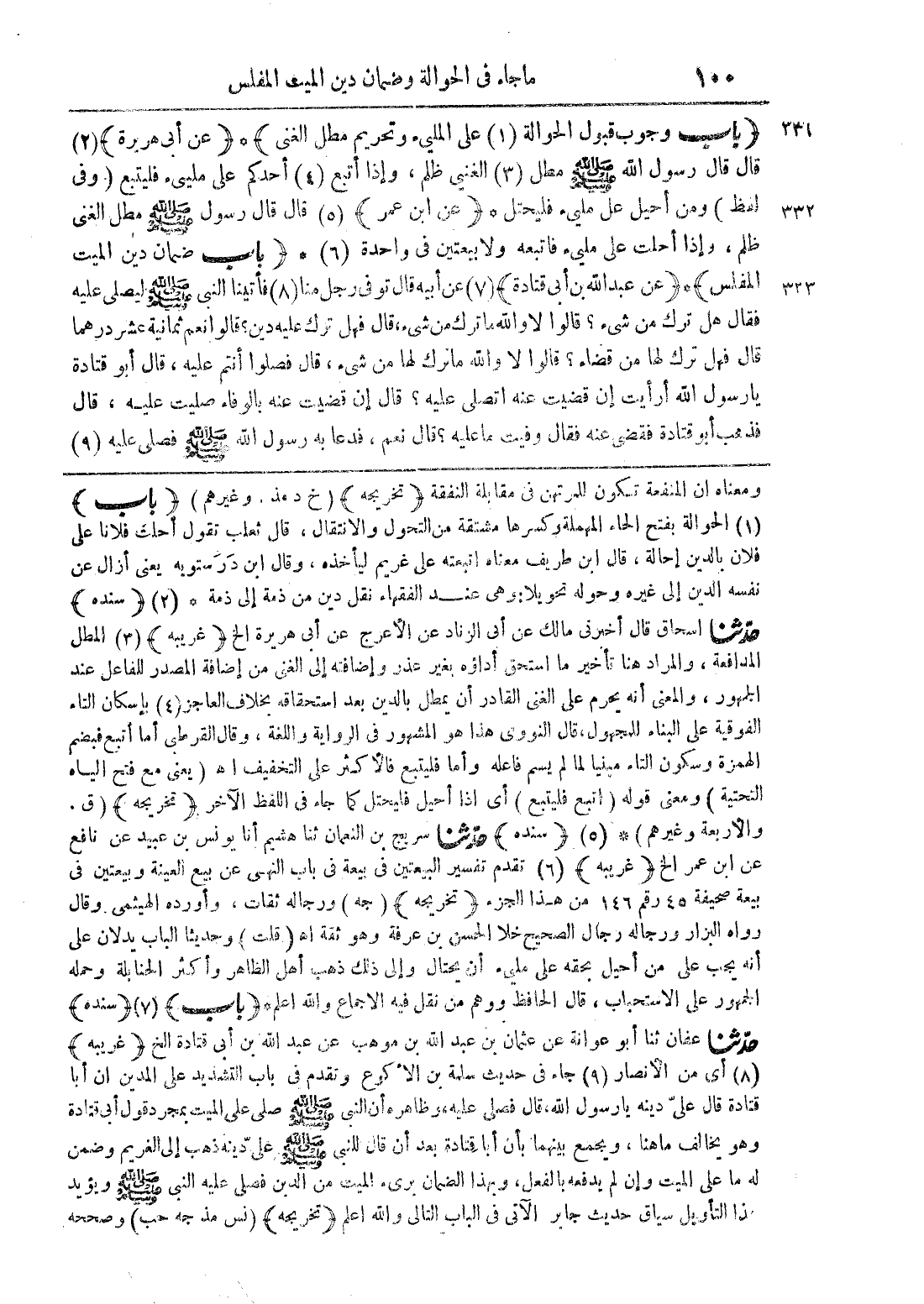 ومعناه أن المنفعة تكون للمرتهن في مقابلة النفقة (تخريجه) (خ د مذ. وغيرهم) (باب) (1) الحوالة بفتح الحاء المهملة وكسرها مشتقة من التحول والانتقال، قال ثعلب تقول أحلت فلانا على فلان بالدين إحالة، قال ابن طريف معناه اتبعته على غريم ليأخذه، وقال ابن در ستويه يعني أزال عن نفسه الدين إلى غيره وحوله تحويلا: وهي عند الفقهاء نقل دين من ذمة إلى ذمة * (2) (سنده) حدثنا إسحاق قال أخبرني مالك عن أبي الزناد عن الأعرج عن أبي هريرة الخ (غريبه) (3) المطل المدافعة، والمراد هنا تأخير ما استحق أداؤه بغير عذر وإضافة إلى الغنى من إضافة المصدر للفاعل عند الجمهور، والمعنى أنه يحرم على الغنى القادر أن يمطل بالدين بعد استحقاقه بخلاف العاجز (4) بإسكان التاء الفوقية على البناء للمجهول، قال النووي هذا هو المشهور في الرواية واللغة، وقال القرطبي أما أتبع فبضم الهمزة وسكون التاء مبنيا لما لم يسم فاعله وأما فليتبع فالأكثر على التخفيف أهـ (يعني مع فتح الياه التحتية) ومعنى قوله (اتبع فليتبع) أي إذا أحيل فليحتل كما جاء في اللفظ الآخر (تخريجه) (ق. والأربعة وغيرهم) * (5) (سنده) حدثنا سريج بن النعمان ثنا هشيم أنا يونس بن عبيد عن نافع عن ابن عمر الخ (غريبه) (6) تقدم تفسير البيعتين في بيعة في باب النهي عن بيع العينة وبيعتين في بيعة صحيفة 45 رقم 146 من هذا الجزء (تخريجه) (جه) ورجاله ثقات، وأورده الهيثمي وقال رواه البزار ورجاله رجال الصحيح خلا الحسن بن عرفة وهو ثقة أهـ (قلت) وحديثا الباب يدلان على أنه يجب على من أحيل بحقه على مليئ أن يحتال وإلى ذلك ذهب أهل الظاهر وأكثر الحنابلة وحمله الجمهور على الاستحباب، قال الحافظ ووهم من نقل فيه الإجماع والله أعلم * (باب) (7) (سنده) حدثنا عفان ثنا أبو عوانة عن عثمان بن عبد الله بن موهب عن عبد الله بن أبي قتادة الخ (غريبه) (8) أي من الأنصار (9) جاء في حديث سلمة بن الأكوع وتقدم في باب التشديد على المدين أن أبا قتادة قال علي دينه يا رسول الله، قال فصلى عليه، وظاهره أن النبي صلى الله عليه وسلم صلى على الميت بمجرد قول أبي قتادة وهو يخالف ماهنا، ويجمع بينهما بأن أبا قتادة بعد أن قال للنبي صلى الله عليه وسلم على دينه ذهب إلى الغريم وضمن له ما على الميت وإن لم يدفعه بالفعل، وبهذا الضمان برئ الميت من الدين فصلى عليه النبي صلى الله عليه وسلم ويؤيد هذا التأويل سياق حديث جابر الآتي في الباب التالي والله أعلم (تخريجه) (نس مذ جه حب) وصححه
