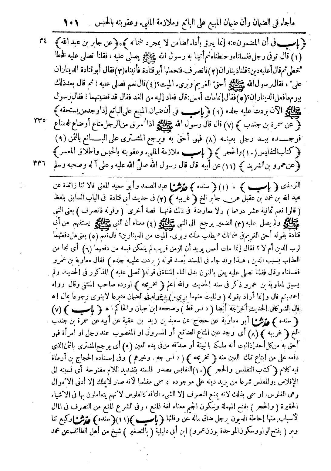 الترمذي} باب {* (1)} سنده {حدثنا عبد الصمد وأبو سعيد المعني قالا ثنا زائدة عن عبد الله بن محمد بن عقيل عن جابر الخ} غريبه {(2) في حديث أبي قتادة في الباب السابق بلفظ (قالوا نعم ثمانية عشر درهما) ولا معارضة في ذلك فإنها قصة أخرى (وقوله فانصرف) يعني النبي صلى الله عليه وسلم ولم يصل عليه (3) الضمير يرجع إلى النبي صلى الله عليه وسلم (4) معناه أن النبي صلى الله عليه وسلم يستفهم من أبي قتادة بقوله أحق الغريم في ضمانك ويطلب منك وبرئ الميت من الدينارين؟ قال نعم (5) يعني هل دفعتهما لرب الدين أم لا؟ فقال إنما مات أمس يريد أن الزمن قريب لم يتمكن فيه من دفعهما (6) أي نجا من العذاب بسبب الدين , هذا وقد جاء في المسند بعد قوله (بردت عليه جلده) فقال معاوية بن عمرو فغسلناه وقال فقلنا نصلي عليه يعني بالنون بدل التاء المثناة في قوله (تصلي عليه) المذكور في الحديث ولم يسبق لمعاوية بن عمرو ذكر في سند الحديث والله أعلم} تخريجه {أورده صاحب المنتقى وقال رواه أحمد: ثم قال وإنما أراد بقوله (والميت منهما برئ) دخوله في الضمان متبرعا لا ينوي رجوعا بمال أهـ قال الشوكاني الحديث أخرجه أيضا (د نس قط) وصححه ابن حبان والحاكم أهـ} باب {(7)} سنده {حدثنا أبو معاوية عن حجاج عن سعيد بن زيد بن عقبة عن أبيه عن سمرة بن جندب الخ} غريبه {(8) أي وجد عين المتاع الضائع أو المسروق أو المغصوب عند رجل أو امرأة فهو أحق به من كل أحد إذا ثبت أنه ملكه بالبينة أو صدَّقه من في يده العين (9) أي يرجع المشتري بالثمن الذي دفعه من ابتاع تلك العين منه} تخريجه {(د نس جه. وغيرهم) وفي إسناده الحجاج بن أرطاة فيه كلام} كتاب التفليس والحجر {(10) التفليس مصدر فلسته بتشديد اللام مفتوحة أي نسبته إلى الإفلاس , والمفلس شرعا من يزيد دينه على موجوده , سمي مفلسا لأنه صار لا يملك إلا أدنى الأموال وهي الفلوس , أو سمي بذلك لأنه يمنع التصرف إلا الشيء التافه كالفلوس لأنهم يتعاملون بها في الأشياء الحقيرة} والحجر {بفتح المهملة وسكون الجيم لغة المنع , وفي الشرع المنع من التصرف في المال لأسباب منها: إحاطة الديون برجل ضاق ماله عن وفائها} باب {(11)} سنده {حدثنا وكيع ثنا وبر (بفتح الواو وسكون الموحدة بوزن عمرو) بن دليلة (بالتصغير) شيخ من أهل الطائف عن محمد