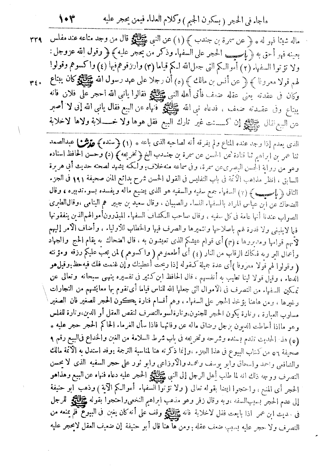 الذي يعدم إذا وجد عنده المتاع ولم يفرقه لصاحبه الذي باعه * (1)} سنده {حدثنا عبد الصمد ثنا عمر بن إبراهيم ثنا قتادة عن الحسن عن سمرة بن جندب الخ} تخريجه {(د) وحسن الحافظ إسناده وهو من رواية الحسن البصري عن سمرة , وفي سماعه منه خلاف: ولكنه يشهد لصحته حديث أبي هريرة السابق , انظر مذاهب الأئمة في باب التفليس في القول الحسن شرح بدائع المنن صحيفة 191 في الجزء الثاني} باب {(2) السفهاء جمع سفيه والسفيه هو الذي يضيع ماله ويفسده بسوء تدبيره , وقال الضحاك عن ابن عباس المراد بالسفهاء النساء والصبيان , وقال سعيد بن جبير هم اليتامى , وقال الطبري الصواب عندنا أنها عامة في كل سفيه , وقال صاحب الكشاف السفهاء المبذرون أموالهم الذين ينفقونها فيما لا ينبغي ولا قدرة لهم بإصلاحها وتثميرها والصرف فيها والخطاب للأولياء , وأضاف الأمر إليهم لأنهم قوامها ومدبروها , (3) أي قوام عيشكم الذي تعيشون به , قال الضحاك به يقام الحج والجهاد وأعمال البر وبه فكاك الرقاب من النار (4) أي أطعموهم (واكسوهم) لمن يجب عليكم رزقه ومؤنته (وقولوا لهم قولا معروفا) أي عدة جميلة كقوله إذا ربحت أعطيتك وإن غنمت فلك فيه حظ: وقيل هو الدعاء , وقيل قولا لينا تطيب به أنفسهم , قال الحافظ ابن كثير في تفسيره ينهي سبحانه وتعالى عن تمكين السفهاء من التصرف في الأموال التي جعلها الله للناس قياما أي تقوم بها معايشهم من التجارات وغيرها , ومن هاهنا يؤخذ الحجر على السفهاء , وهم أقسام فتارة يكون الحجر للصغير فإن الصغير مسلوب العبارة , وتارة يكون الحجر للجنون , وتارة لسوء التصرف لنقص العقل أو الدين وتارة للفلس وهو ما إذا أحاطت الديون برجل وضاق ماله عن وفائها فإذا سأل الغرماء الحاكم الحجر عليه حجر عليه * (5) هذا الحديث تقدم بسنده وشرحه وتخريجه في باب شرط السلامة من الغبن والخداع في البيع رقم 9 صحيفة 56 من كتاب البيوع في هذا الجزء , وإنما ذكرته هنا لمناسبة الترجمة: وقد استدل به الأئمة مالك والشافعي وأحمد وأبو يوسف ومحمد والأوزاعي وأبو ثور على حجر السفيه الذي لا يحسن التصرف ووجه ذلك أنه لما طلب أهل الرجل إلى النبي صلي الله عليه وسلم الحجر عليه دعاه فنهاه عن البيع وهذا هو الحجر أي المنع , واحتجوا أيضا بقوله تعالى (ولا تؤتوا السفهاء أموالكم الآية) وذهب أبو حنيفة إلى عدم الحجر بسبب السفه , وبه وقال زفر وهو مذهب إبراهيم النخعي واحتجوا بقوله صلى الله عليه وسلم للرجل في حديث ابن عمر رضي الله عنهما إذا بايعت فقل لا خلابة فإنه صلى الله عليه وسلم وقف على أنه كان يغبن في البيوع فلم يمنعه من التصرف ولا حجر عليه بسبب ضعف عقله: ومن ها هنا قال أبو حنيفة إن ضعيف العقل لا يحجر عليه
