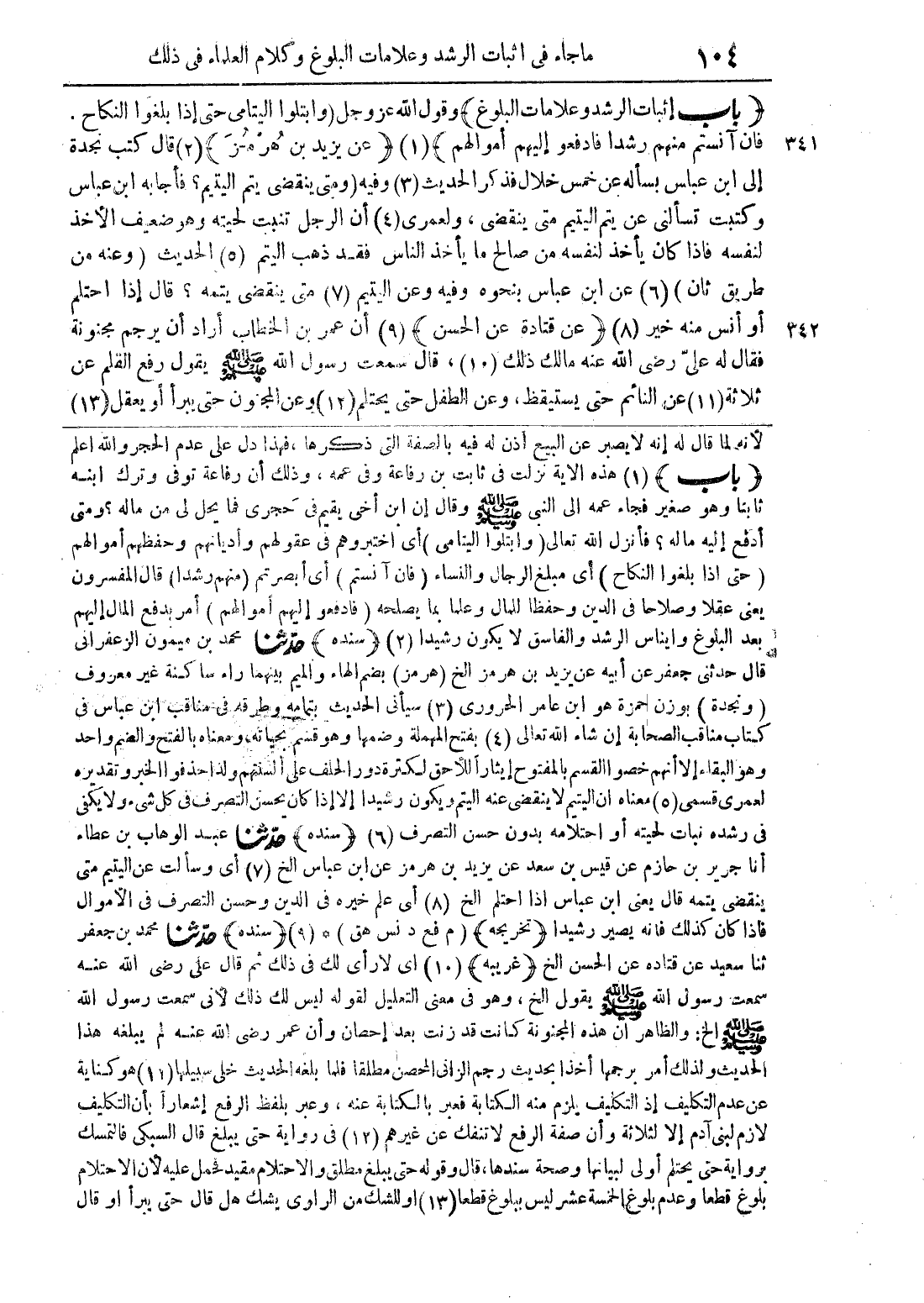 (باب إثبات الرشد وعلامات البلوغ) وقول الله عز وجل} وابتلوا اليتامى حتى إذا بلغوا النكاح فإن آنستم منهم رشدا فادفعوا إليهم أموالهم {(1) (عن يزيد بن هرمز) (2) قال كتب نجدة إلى ابن عباس بسأله عن خمس خلال فذكر الحديث (3) وفيه (ومتى ينقض يتم اليتيم؟ فأجابه ابن عباس وكتبت تسألنى عن يتم اليتيم متى ينقض، ولعمرى (4) أن الرجل تنبت لحيته وهو ضعيف الأخذ لنفسه فإذا كان يأخذ لنفسه من صالح ما يأخذ الناس فقد ذهب اليتم (5) الحديث (وعنه من طريق ثان) (6) عن ابن عباس بنحوه وفيه وعن اليتيم (7) متى ينقض يتمه؟ قال إذا احتلم أو أنس منه خير (8) (عن قتادة عن الحسن) (9) أن عمر بن الخطاب أراد أن يرجم مجنونة فقال له علىّ رضى الله عنه مالك ذلك (10)، قال سمعت رسول الله صلى الله عليه وسلم يقول رفع القلم عن ثلاثة (11) عن النائم حتى يستيقظ، وعن الطفل حتى يحتلم (12) وعن المجنون حتى يبرأ أو يعقل (13)