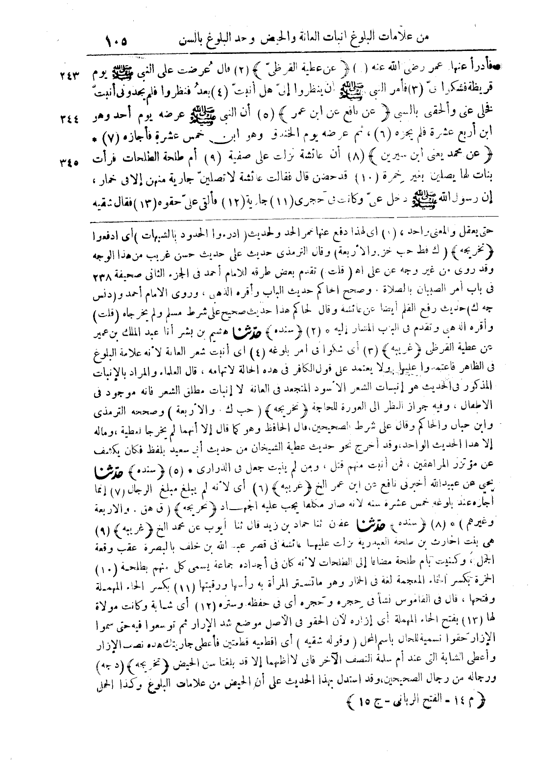 حتى يعقل والمعنى واحد , (1) أي لهذا دفع عنها عمر الحد ولحديث (ادرءوا الحدود بالشبهات) أي ادفعوا} تخريجه {(ك قط حب خز بر. والأربعة) وقال الترمذي حديث على حديث حسن غريب من هذا الوجه وقد روى من غير وجه عن علي أهـ (قلت) تقدم بعض طرقه للإمام أحمد في الجزء الثاني صحيفة 238 في باب أمر الصبيان بالصلاة , وصحح الحاكم حديث الباب وأقره الذهبي , وروى الإمام أحمد و (د نس جه ك) حديث رفع القلم أيضا عن عائشة وقال الحاكم هذا حديث صحيح على شرط مسلم ولم يخرجاه (قلت) وأقره الذهبي وتقدم الباب المشار إليه * (2)} سنده {حدثنا هشيم بن بشر أنا عبد الملك بن عمير عن عطية القرظي} غريبه {(3) أي شكوا في أمر بلوغه (4) أي أنبت شعر العانة لأنه علامة البلوغ في الظاهر فاعتمدوا عليها ولا يعتمد على قول الكافر في هذه الحالة لاتهامه , قال العلماء والمراد بالإنبات المذكور في الحديث هو إنبات الشعر الأسود المتجعد في العانة لا إنبات مطلق الشعر فإنه موجود في الأطفال , وفيه جواز النظر إلى العورة للحاجة} تخريجه {(حب ك. والأربعة) وصححه الترمذي وابن حبان والحاكم وقال على شرط الصحيحين , قال الحافظ وهو كما قال إلا أنهما لم يخرجا لعطية , وماله إلا هذا الحديث الواحد وقد أخرج نحو حديث عطية الشيخان من حديث أبي سعيد بلفظ فكان يكشف عن مؤتزر المراهقين , فمن أنبت منهم قتل , ومن لم ينبت جعل في الذراري * (5)} سنده {حدثنا يحيى عن عبيد الله أخبرني نافع عن ابن عمر الخ} غريبه {(6) أي لأنه لم يبلغ مبلغ الرجال (7) إنما أجازه عند بلوغه خمس عشرة سنة لأنه صار مكلفا يجب عليه الجهاد} تخريجه {(ق هق. والأربعة وغيرهم) * (8)} سنده {حدثنا عفان ثنا حماد بن زيد قال ثنا أيوب عن محمد الخ} غريبه {(9) هي بنت الحارث بن سلحة العبدرية نزلت عليها عائشة في قصر عبد الله بن خلف بالبصرة عقب وقعة الجمل , وكُنيت بأم طلحة مضافا إلى الطلحات لأنه كان في أجداده جماعة يسمى كل منهم بطلحة (10) الخمرة بكسر الخاء المعجمة لغة في الخمار وهو ما تستر المرأة به رأسها ورقبتها (11) بكسر الحاء المهملة وفتحها , قال في القاموس نشأ في حِجره وحَجره أي في حفظه وستره (12) أي شابة وكانت مولاة لها (13) بفتح الحاء المهملة أي إزاره لأن الحقو في الأصل موضع شد الإزار ثم توسعوا فيه حتى سموا الإزار حَقوا تسمية للحال باسم المحل (وقوله شقيه) أي اقطعيه قطعتين فأعطي جاريتك هذه نصف الإزار وأعطي الشابة التي عند أم سلمة النصف الآخر فإني لا أظنهما إلا قد بلغتا سن الحيض} تخريجه {(د جه) ورجاله من رجال الصحيحين , وقد استدل بهذا الحديث على أن الحيض من علامات البلوغ وكذا الحمل