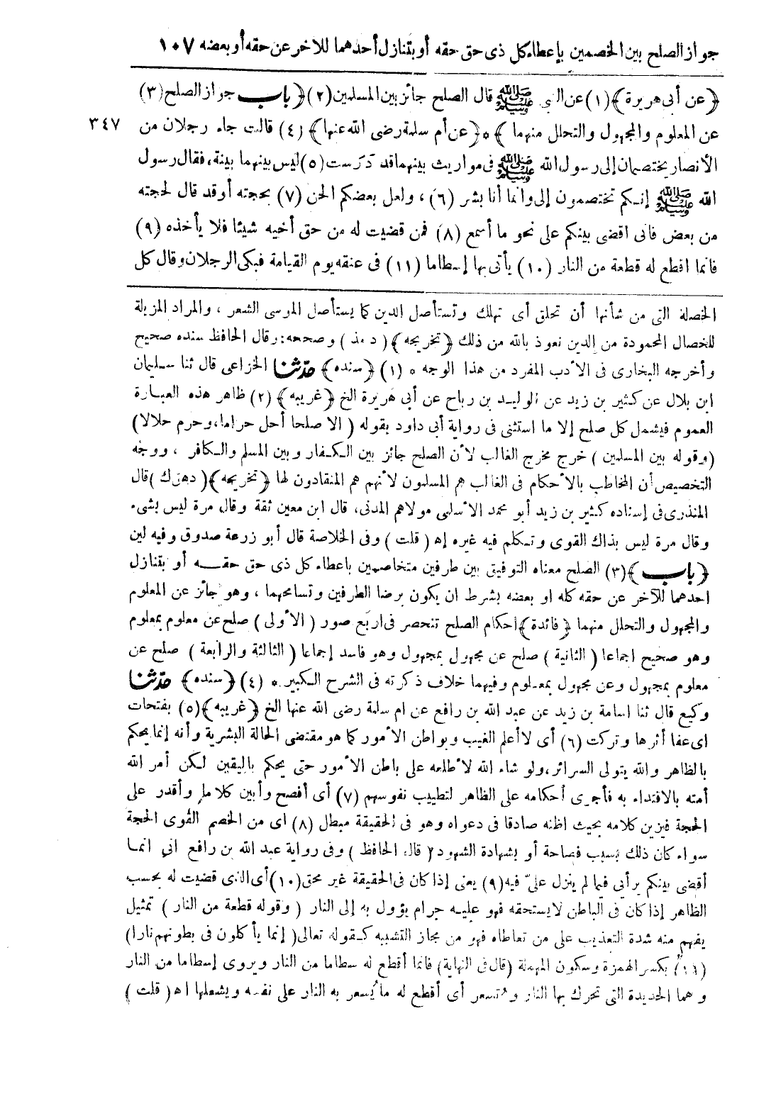 (عن أبي هريرة) (1) عن النبى صلى الله عليه وسلم صال الصلح جائز بين المسلمين (2) (باب جواز الصلح (3) عن المعلوم والمجهول والتحلل منهما) * (عن أم سلمة رضى الله عنها) (4) قالت جاء رجلان من الأنصار يختصمان إلى رسول الله صلى الله عليه وسلم في مواريث بينهما قد درست (5) ليس بينهما بينة، فقال رسول الله صلى الله عليه وسلم إنكم تختصمون إلى وإنما أنا بشر (6)، ولعل بعضكم الحن (7) بحجته أو قد قال لحجته من بعض فإنى أقضى بينكم على نحو ما أسمع (8) فمن قضيت له من حق أخيه شيئاً فلا يأخذه (9) فإنما أقطع له قطعة من النار (10) يأتى بها إسطاما (11) في عنقه يوم القيامة فبكى الرجلان وقال كل