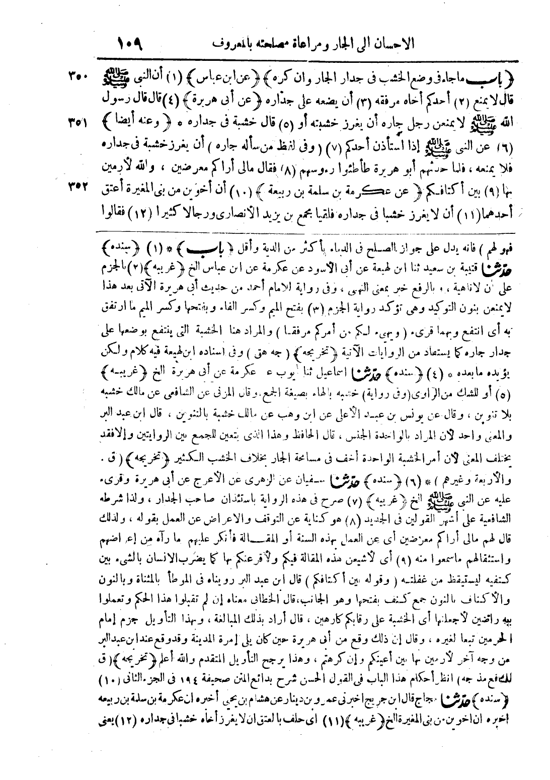 (باب ما جاء في وضع الخشب في جدار الجار وأن كره) (عن ابن عباس) (1) أن النبى صلى الله عليه وسلم قال لا يمنع (2) أحدكم أخاه مرفقه (3) أن يضعه على جدّاره (عن أبى هريرة) (4) قال قال رسول الله صلى الله عليه وسلم لا يمنعن رجل جاره أن يغرز خشبته أو (5) قال خشبة في جداره * (وعنه أيضاً) (6) عن النبى صلى الله عليه وسلم إذا استأذن أحدكم (7) (وفى لفظ من سأله جاره) أن يغرز خشبة في جداره فلا يمنعه، فلما حدثهم أبو هريرة طأطئوا رءوسهم (8) فقال ما لى أراكم معرضين، والله لأرمين بها (9) بين أكتافكم (عن عكرمة بن سلمة بن ربيعة) (10) أن أخوين من بنى المغيرة أعتق أحدهما (11) أن لا يغرز خشباً في جداره فليقا مجمع بن يزيد الأنصارى ورجالاً كثيراً (12) فقالوا