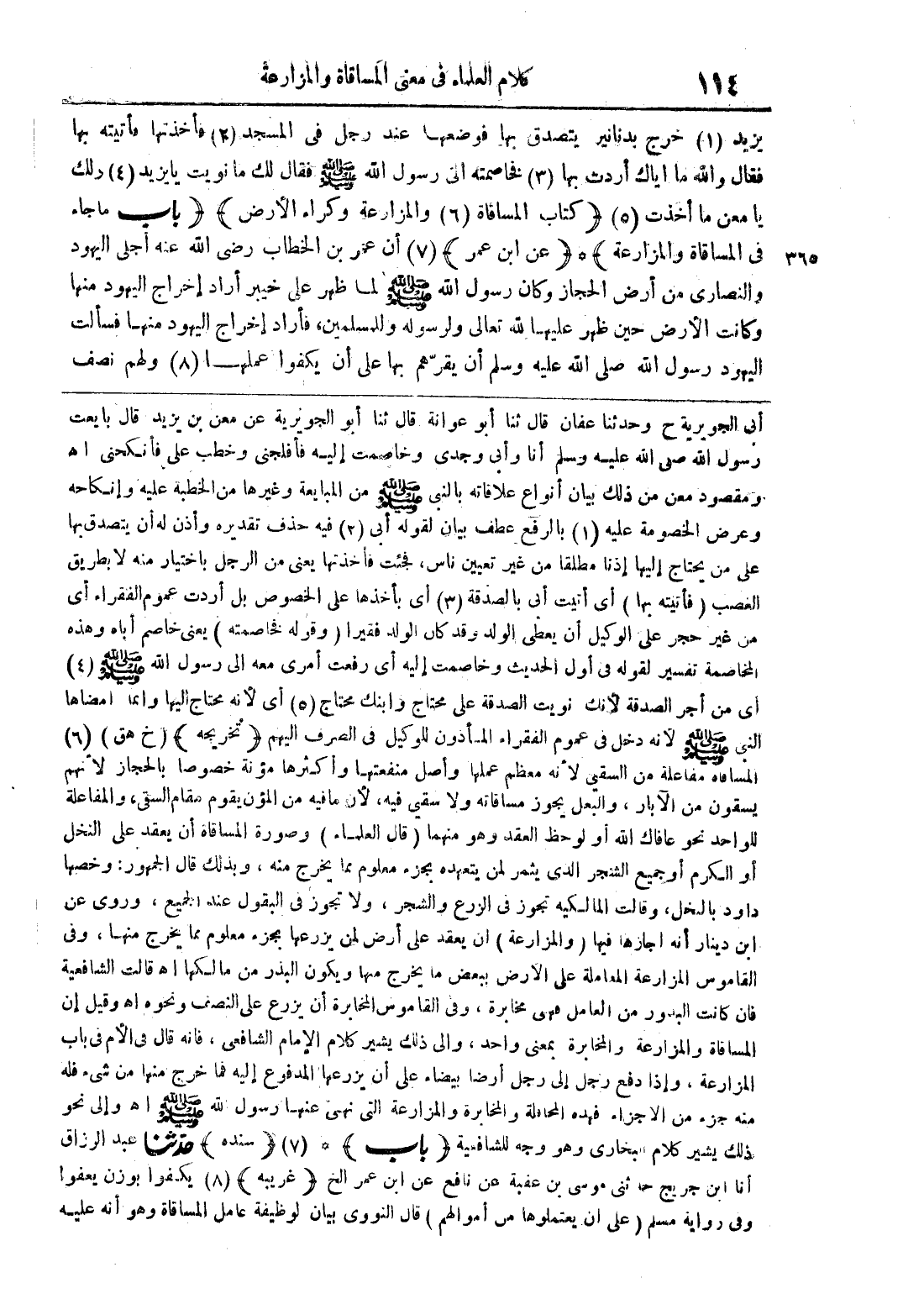 يزيد (1) خرج بدنانير يتصدق بها فوضعها عند رجل في المسجد (2) فأخذتها فأتيته بها فقال والله ما إياك أردت بها (3) فخاصمته إلى رسول الله صلى الله عليه وسلم فقال لك ما نويت يا يزد (4) ولك يا معن ما أخذت (5) (كتاب المساقاة (6) والمزارعة وكراء الأرض) (باب ما جاء في المساقاة والمزارعة) * (عن ابن عمر) (7) أن عمر بن الخطاب رضى الله عنه أجلى اليهود والنصارى من أرض الحجاز وكان رسول الله صلى الله عليه وسلم لما ظهر على خيبر أراد إخراج اليهود منها وكانت الأرض حين ظهر عليها لله تعالى ولرسوله وللمسلمين، فأراد إخراج اليهود منها فسألت اليهود رسول الله صلى الله عليه وسلم أن يقرّهم بها على أن يكفوا عملها (8) ولهم نصف