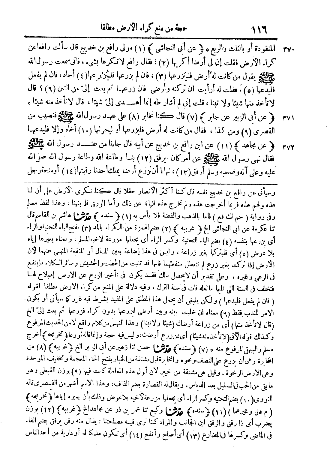 وسيأتي عن رافع بن خديج نفسه قال كنا أكثر الأنصار حقلا قال كنا نكري الأرض على أن لنا هذه ولهم هذه فربما أخرجت هذه ولم تخرج هذه فنهانا عن ذلك وأما الورف فلم ينهنا , وهذا للفظ مسلك وفي رواية (حم لك فع) فأما بالذهب والفضة فلا بأس به (1)} سنده {حدثنا هاشم بن القاسم قال ثنا عكرمة عن أبي النجاشي الخ} غريبه {(2) بضم الهمزة من الكراء بالمد (3) بفتح الياء التحتية والراء أي يزرعها بنفسه (4) بضم الياء التحتية وكسر الراء أي يجعلها مزرعة لأخيه المسلم , ومعناه يعيرها إياه بلا عوض (5) أي فليتركها بغير زراعة , وليس في إضاعة بعين المال أو المنفعة المنهي عنهما لأن الأرض إذا تركت بغير زرع لم تتعطل منفعتهما فإنها قد تنبت من الحطب والحشيش وسائر الكلاء ما ينفع في الرعي وغيره , وعلى تقدير أن لا يحصل ذلك فقد يكون في تأخير الزرع عن الأرض إصلاح لها فتخلفا في السنة التي تليها ما لعله فات في سنة الترك , وفيه دلالة على المنع من كراء الأرض مطلقا لقوله (فإن لم يفعل فليدعها) ولكن ينبغي أن يحمل هذا المطلق على المقيد بشرط فيه غرر كما سيأتي أو يكون الأمر للندب فقط (6) معناه إن خليت الأرض بينه وبين أرضي ليزرعها بدون كراء فزرعها ثم بعث إلىَّ الخ (قال لا تأخذ منها) أي ممن زرع أرضك , وليس فيه حجة وإنما قاله تورعا} تخريجه {أخرج مسلم البيهقي المرفوع منه * (7)} سنده {حدثنا حسن ثنا زهير عن أبي الزبير الخ} غريبه {(8) من المخابرة وهي أن يزرع على النصف ونحوه والمخابرة قيل مشتقة من الخبار بفتح الخاء المعجمة وتخفيف الموحدة وهي الأرض الرخوة, وقيل هي مشتقة من خيبر لأن أول هذه المعاملة كانت فيها (9) بوزن القبطي وهو ما بقي من الحب في السنبل بعد الدياس , ويقال له القصارة بضم القاف , وهذا الاسم أشهر من القصري قاله النووي (1) بضم التحتية وكسر الراء أي يجعلها مزرعة لأخيره بلا عوض وذلك بأن يعيره إياها} تخريجه {(م هق وغيرهما) (11)} سنده {حدثنا وكيع ثنا عمر بن ذر عن مجاهد الخ} غريبه {(12) بوزن يضرب أي ذا رفق والرفق لين الجانب والمراد كنا نرى فيه مصلحتنا: يقال منه يفق بضم الفاء في الماضي وسكرها في المضارع (1) أي أصلح وأنفع (14) أي تكون ملكا له أو عارية من أحد الناس
