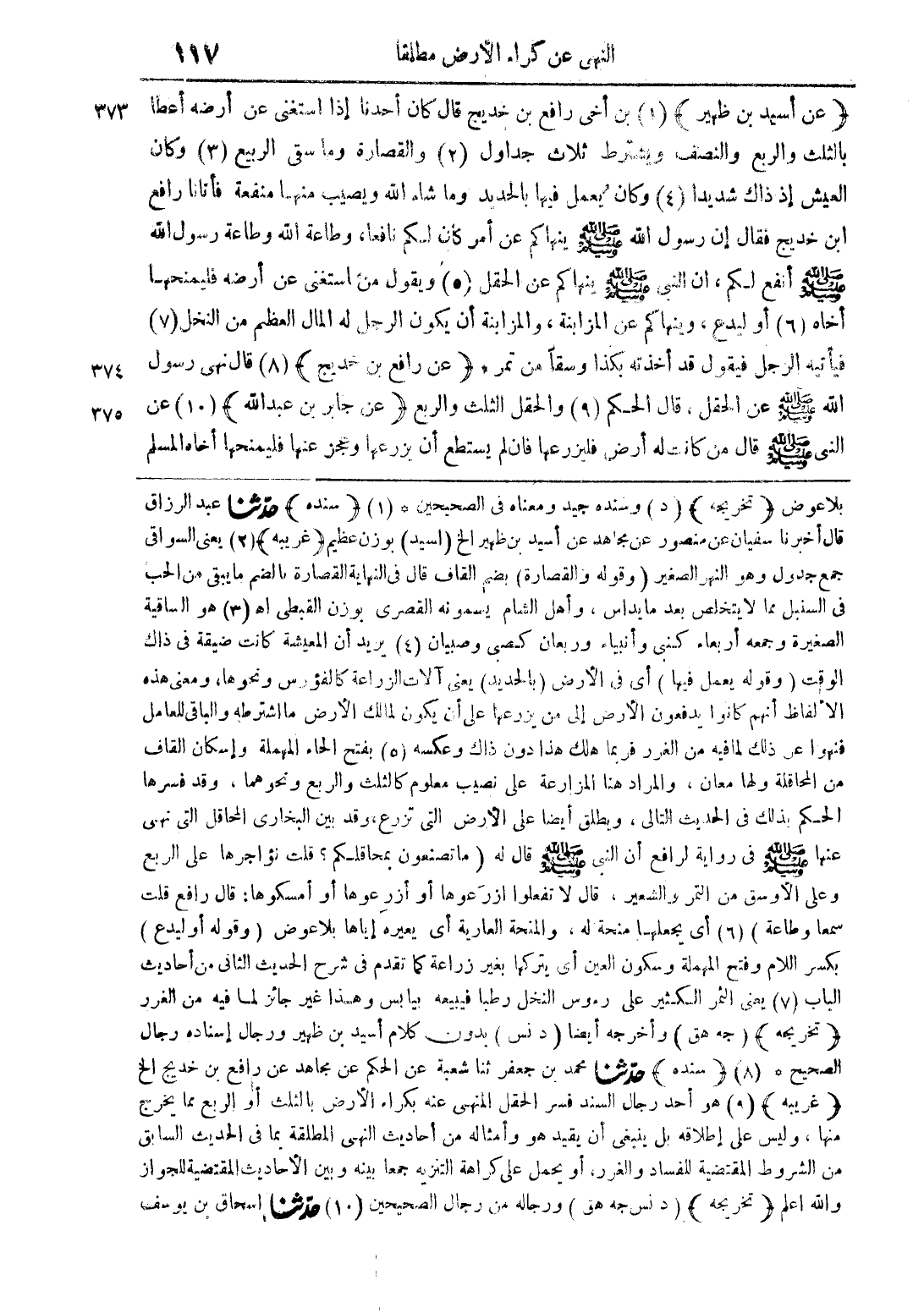 (عن أسيد بن ظهير) (1) بن أخى رافع بن خديج قال كان أحدنا إذا استغنى عن أرضه أعطا بالثلث والربع والنصف ويشترط ثلاث جداول (2) والقصارة وما سقى الربيع (3) وكان العيش إذ ذاك شديداً (4) وكان يُعمل فيها بالحديد وما شاء الله ويصيب منها منفعة فأتانا رافع ابن خديج فقال إن رسول الله صلى الله عليه وسلم ينهاكم عن أمر كان لكم نافعاً، وطاعة الله وطاعة رسول الله صلى الله عليه وسلم أنفع لكم، أن النبى صلى الله عليه وسلم ينهاكم عن الحقل (5) ويقول من استغنى عن أرضه فليمنحها أخاه (6) أو ليدع، وينهاكم عن المزابنة، والمزابنة أن يكون الرجل له المال العظم من النخل (7) فيأتيه الرجل فيقول قد أخذته بكذا وسقاً من تمر (عن رافع بن خديج) (8) قال نهى رسول الله صلى الله عليه وسلم عن الحقل، قال الحكم (9) والحقل الثلث والربع (عن جابر بن عبد الله) (10) عن النبى صلى الله عليه وسلم قال من كانت له أرض فليزرعها فإن لم يستطع أن يزرعها وعجز عنها فليمنحها أخاه المسلم