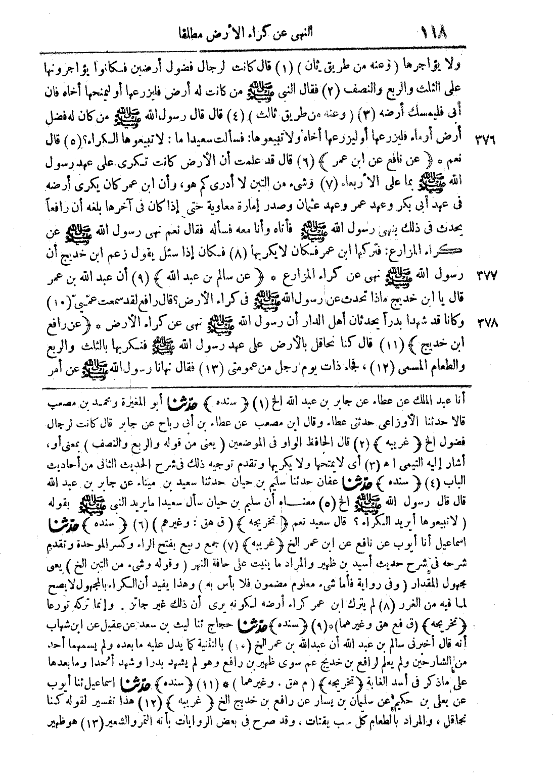 أن عبد الملك عن عطاء عن جابر بن عبد الله الخ (1)} سنده {حدثنا أبو المغيرة ومحمد بن مصعب قالا حدثنا الأوزاعي حدثني عطاء وقال مصعب بن أبي رباح عن جابر قال كانت لرجال فضول الخ} غريب {(2) قال الحافظ الواو في الموضعين (يعني من قوله النصف والربع) بمعنى أو , أشار إليه التيمي أهـ (3) أي لا يمتحها ولا يكريها وتقدم توجيه ذلك في شرح الحديث الثاني من أحاديث الباب (4)} سنده {حدثنا عفان حدثنا سعيد بن ميناء عن جابر بن عبد الله قال قال رسول الله صلى الله عليه وسلم الخ (5) معناه أن سليم بن حيان سأل سعيدا ما يريد النبي صلى الله عليه وسلم بقوله (لا تبيعوها أيريد الكراء؟ قال سعيد نعم)} تخريجه {(ق هق: وغيرهم) (6)} سنده {حدثنا إسماعيل أنا أيوب عن نافع عن ابن عمر الخ} غريبه {(7) جمع ربيع بفتح الراء وكسر الموحدة وتقدم شرحه في حديث أسيد بن ظهير والمراد ما ينبت على حافة النهر (وقوله وشيء من التبن الخ) يعني مجهول المقدار (وفي رواية فأما شيء معلوم مضمون لا بأس به) وهذا يفيد أن الكراء بالمجهول لا يصخ لما فيه من الغرر (8) لم يترك ابن عمر كراء أرضه لكونه يرى أن ذلك غير جائز , وإنما تركه تورعا} تخريجه {(ق فع هق وغيرهما) * (11)} سنده {حدثنا إسماعيل ثنا أيوب عن يعلي بن حكيم عن سليمان بن يسار عن رافع بن خديج الخ} غريبه {(12) هذا تفسير لقوله كنا نحاقل , والمراد بالطعام كل حب يقتات , وقد صرح في بعض الروايات بأنه التمر والشعير (13) هو ظهير