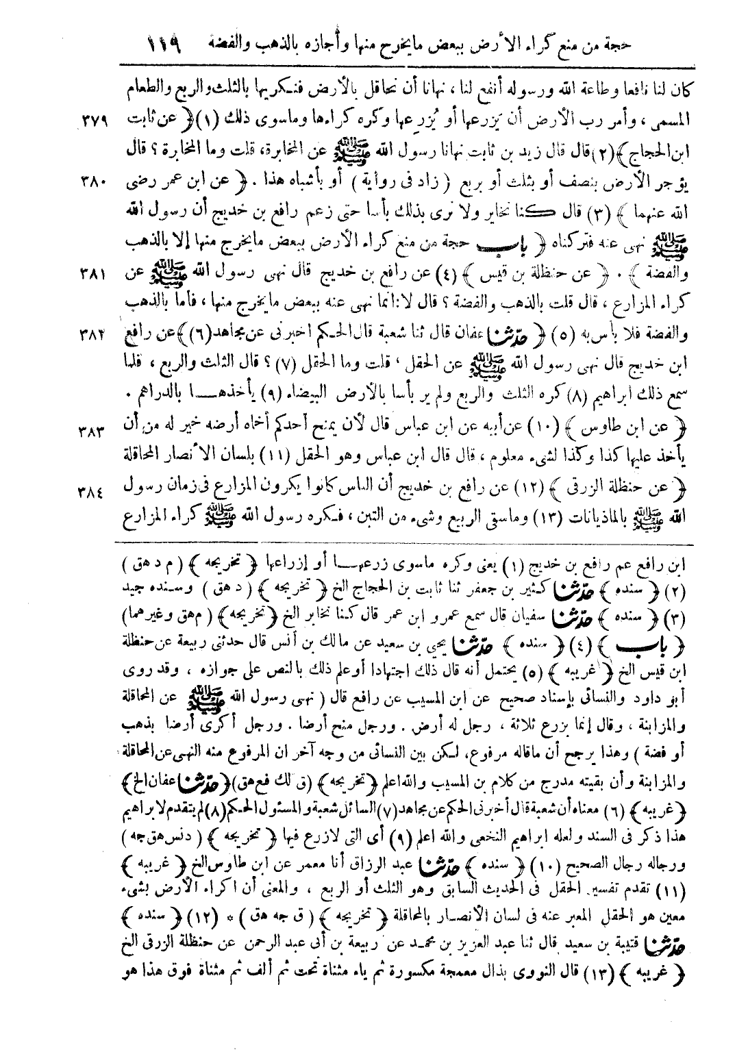 ابن رافع عم رافع بن خديج (1) يعن وكره ما سوى زرعها أو إزراعها} تخريجه {(م د هق) (2)} سنده {حدثنا كثير بن جعفر ثنا ثابت بن الحجاج الخ} تخريجه {(د هق) وسنده جيد (3)} سنده {حدثنا سفيان قال سمع عمرو ابن عمر قال كنا نخابر الخ} تخريجه {(م هق. وغيرهما)} باب {(4)} سنده {حدثنا يحيى بن سعيد عن مالك بن أنس قال حدثني ربيعة عن حنظلة ابن قيس الخ} غريبه {(5) يحتمل أنه قال ذلك اجتهادا أو علم ذلك بالنص على جوازه , وقد روى أبو داود والنسائي بإسناد صحيح عن ابن المسيب عن رافع قال (نهى رسول الله صلى الله عليه وسلم) عن المحاقلة والمزابنة , وقال إنما يزرع ثلاثة , رجل له أرض , ورجل منح أرضا , ورجل أكرى أرضا بذهب أو فضة) وهذا يرجح ما قاله مرفوع , لكن بين النسائي من وجه آخر أن المرفوع منه منهي عن المحاقلة والمزابنة وأن بقيته مدرج من كلام بن المسيب والله أعلم} تخريجه {(ق لك فع هق)} حدثنا عفان الخ {} غريبه {(6) معناه أن شعبة قال أخبرني الحكم عن مجاهد (7) السائل شعبة والمسئول الحكم (8) لم يتقدم لإبراهيم هذا ذكر في السند ولعله إبراهيم النخعي والله أعلم (9) أي التي لا زرع فيها} تخريجه {(د نس هق جه) ورجاله رجال الصحيح (10)} سنده {حدثنا عبد الرزاق أنا معمر عن ابن طاوس الخ} غريبه {(11* تقدم تفسير الحقل في الحديث السابق وهو الثلث أو الربع , والمعنى أن إكراء الأرض بشيء معين هو الحقل المعبر عنه في لسان الأنصار بالمحاقلة} تخريجه {(ق جه هق) * (12)} سنده {حدثنا قتيبة بن سعيد قال ثنا عبد العزيز بن محمد عن ربيعة بن أبي عبد الرحمن عن حنظلة الزرقي الخ} غريبه {(13) قال النووي بذال معجمة مكسورة ثم ياء مثناة تحت ثم ألف ثم مثناة فوق هذا هو