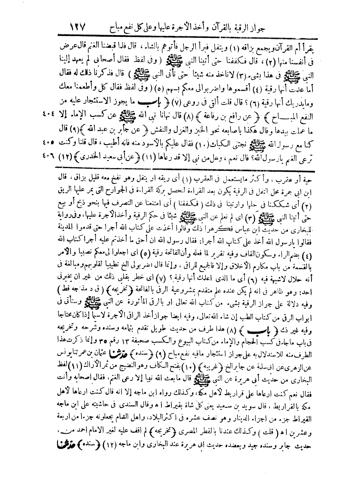 حية أو عقرب , وأكثر ما يستعمل في العقرب (1) أي ريقه أو يتفل وهو نفخ معه قليل بزاق , قال ابن أبي جمرة مجحل التفل في الرقبة يكون بعد القراءة لنحصل على بركة القراءة في الجوارح الذي يمر عليها الريق (2) أي شككنا في حلها وارتبنا في ذلك (فكففنا) أي امتنعنا عن التصرف فيها بنحو ذبح أو بيع حتى أتينا النبي صلى الله عليه وسلم (3) أي لم نعلم عن النبي صلى الله عليه وسلم شيئا في حكم الريقة وأخذ الأجرة عليها , وفي رواية للبخاري من حديث ابن عباس فكرهوا ذلك وقالوا أخذت على كاب الله أجرا حتى قدموا المدينة فقالوا يا رسول الله أخذ على كتاب الله أجرا: فقال رسول الله إن أحق ما أخذتم عليه أجرا كتاب الله (4) بضم الراء وسكون القاف وفيه تقرير لما فعله وأن الفاتحة رقية (5) أي اجعلوا لي معكم نصيبا والأمر بالقسمة من باب مكارم الأخلاق وإلا فالجميع للراقي , وإنما قال اضربولي الخ تطييبا لقلوبهم ومبالغة في أنه حلال لا شبهة فيه (6) أي ما الذي أعلمك أنها رقية؟ (7) أي خطر بقلبي ذلك من غير أن يخبرني أحد: وهو ظاهر في أنه لم يكن عنده علم متقدم بمشروعية الرقي الفاتحة {تخريجه} (ق د مذ جه قط) وفيه دلالة على جواز الرقية بشيء من كتاب الله تعالى , وفيه أيضا جواز أخذا الراقي الأجرة لا سيما إذا كان محتاجا وفيه غير ذلك {باب} (8) هذا طرف من حديث طويل تقدم بتمامه وسنده وشرحه وتخريجه في باب ما جاء منه للاستدلال به على جواز استئجار ما فيه نفع مباح (9) {سنده} حدثنا عثمان بن عمر ثنا يونس عن الزهري عن أبي سلمة عن جابر الخ {غريبه} (10) بفتح الكاف وهو النضيج من ثمر الأراك (11) لفظ البخاري من حديث أبي هريرة عن النبي صلى الله عليه وسلم قال ما بعث الله نبيا إلا رعى الغنم , فقال أصحابه وأنت فقال نعم كنت أرعاها على قراريط لأهل مكة , وكذلك رواه ابن ماجه إلا أنه قال كنت أرعاها لأهل مكة بالقراريط ,قال سويد بن سعيد يعني كل شاة بقيراط أهـ وقال السندي في حاشيته على ابن ماجه القيراط جزء من أجزاء الدينار وهو نصف عشره في أكثر البلاد , وأهل الشم يجعلونه جزءا من أربعة وعشرين أهـ (قلت) وكذلك عندنا بالقطر المصري {تخريجه} لم أقف عليه لغير الإمام أحمد من حديث جابر وسنده جيد ويعضده حديث أبي هريرة عند البخاري وابن ماجه (12) {سنده} حدثنا