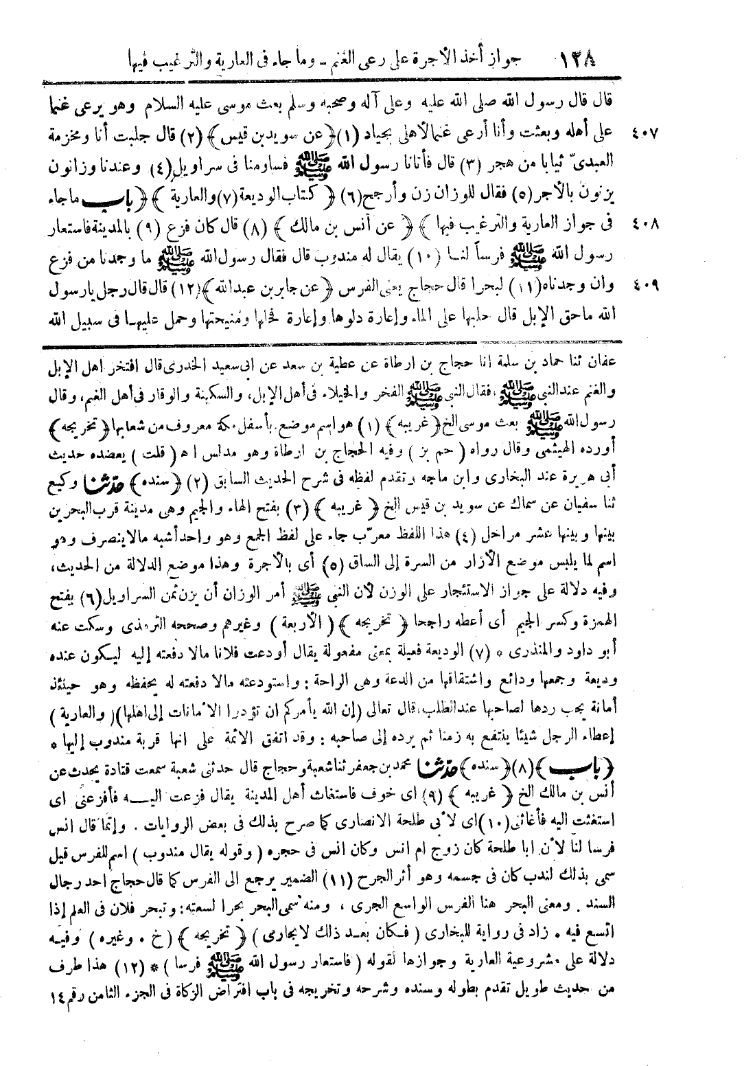 عفان ثنا حماد بن سلمة أنا حجاج بن أرطاة عن عطية بن سعد عن أبي سعيد الخدري قال افتخر أهل الإبل والغنم عند النبي صلى الله عليه وسلم , فقال النبي صلى الله عليه وسلم الفخر والخيلاء في أهل الإبل , والسكينة والوقار في أهل الغنم , وقال رسول الله صلى الله عليه وسلم بعث موسى الخ {غريبه} (1) هو اسم موضع بأسفل مكة معروف من شعابها {تخريجه} أورده الهيثمي وقال رواه (حم بز) وفيه الحجاج بن أرطاة وهو مدلس أهـ (قلت) يعضده حديث أبي هريرة عند البخاري وابن ماجه وتقدم لفظه في شرح الحديث السابق (2) {سنده} حدثنا وكيع ثنا سفيان عن سماك عن سويد بن قيس الخ {غريبه} (3) بفتح الهاء والجيم وهي مدينة قرب البحرين بينها وبينها عشر مواحل (4) هذا اللفظ معرّب جاء على لفظ الجمع وهو واحد أشبه بما لا ينصرف وهو اسم لما يلبس موضع الإزار من السرة إلى الساق (5) أي بالأجرة وهذا موضع الدلالة من الحديث , وفيه دلالة على جواز الاستئجار على الوزن لأن النبي صلى الله عليه وسلم أمر الوزان أن يزن ثمن السراويل (6) بفتح الهمزة وكسر الجيم أي أعطه راجحا {تخريجه} (الأربعة. وغيرهم) وصححه الترمذي وسكت عنه أبو داود والمنذري * (7* الوديعة فعيلة بمعنى مفعولة يقال أودعت فلانا ما لا دفعته إليه ليكون عنده وديعة وجمعها ودائع لصاحبها عند الطلب , قال تعالى (إن الله يأمركم أن تؤدوا الأمانات إلى أهلها) (والعارية) إعطاء الرجل شيئا ينتفع به زمنا ثم يرده إلى صاحبه: وقد اتفق الأئمة على أنها قربة مندوب إليها * {باب} (8) {سنده} حدثنا محمد بن جعفر ثنا شعبة وحجاج قال حدثني شعبة سمعت قتادة يحدث عن أنس بن مالك الخ {غريبه} (9) أي خوف فاستغاث أهل المدينة يقال فزعت إليه فأفزعني أي استغثت إليه فأغاثني (10) أي لأبي طلحة الأنصاري كما صرح بذلك في بعض الروايات , وإنما قال أنس فرسا لنا لأن أبا طلحة كان زوج أم أنس وكان أنس في حجره (11) الضمير يرجع إلى الفرس كما قال الحجاج أحد رجال السند , ومعنى البحر هنا الفرس الواسع الجري , ومنه سمي البحر بحرا لسعته: وتبحر فل ان في العلم إذا اتسع فيه , زاد في رواية للبخاري (فكان بعد ذلك لا يجارى) {تخريجه} (خ. وغيره) وفيه دلالة على مشروعية العارية وجوازها لقوله (فاستعر رسول الله صلى الله عليه وسلم فرسا) * (12) هذا طرف من حديث طويل تقدم بطوله وسنده وشرحه وتخريجه في باب افتراض الزكاة في الجزء الثامن رقم 14