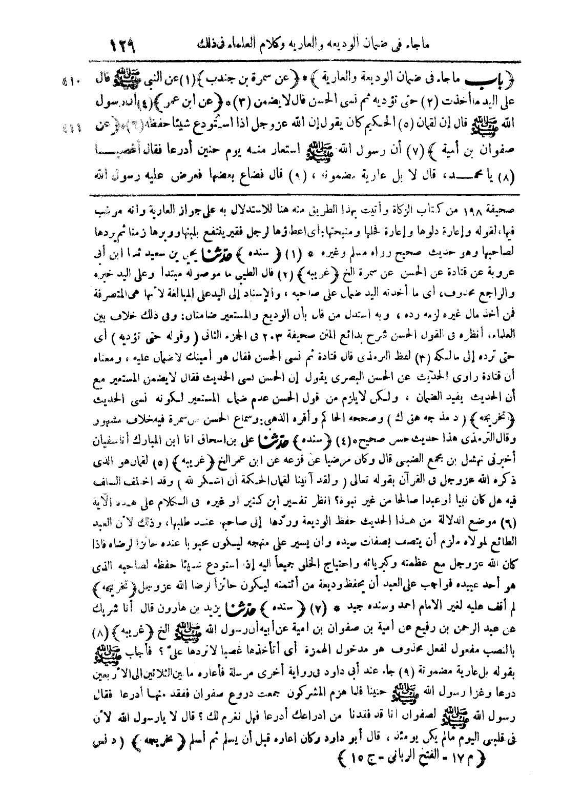 صحيفة 198 من كتاب الزكاة وأتيا بهذا الطريق منه هنا للاستدلال به على جواز العارية وأنه مرغب فيها , لقوله وإعارة دلوها وإعارة فحلها ومنيحتها: أي إعطاؤها لرجل فقير ينتفع بلبنها ووبرها زمنا ثم يردها لصاحبها وهو حديث صحيح رواه مسلم وغيره * (1) {سنده} حدثنا يحيى بن سعيد ثنا ابن أبي عروبة عن قتادة عن الحسن عن سمرة الخ {غريبه} (2) قال الطيبي ما موصولة مبتدأ وعلى اليد خبره والراجح محذوف , أي ما أخذته اليد ضمان على صاحبه , والإسناد إلى اليد على المبالغة لأنها هي المتصرفة فمن أخذ مال غيره لزمه رده , وبه استدل من قال بأن الوديع والمستعير ضامنان: وفي ذلك خلاف بين العلماء , أنظره في القول الحسن شرح بدائع المنن صحيفة رقم 203 في الجزء الثاني (وقوله حتى تؤديه) أي حتى ترده إلى مالكه (3) لفظ الترمذي قال قتادة ثم نسى الحسن فقال هو أمينك لا ضمان عليه , ومعناه أن قتادة راوي الحديث عن الحسن البصري يقول إن الحسن البصري نسى الحديث فقال لا يضمن المستعير مع أن الحديث يفيد الضمان , ولكن لا يلزم من قول الحسن عدم ضمان المستعير لكونه نسي الحديث {تخريجه} (د مذ جه هق ك) وصححه الحاكم وأقره الذهبي: وسماع الحسن من سمرة فيه خلاف مشهور وقال الترمذي هذا حديث حسن صحيح * (4) {سنده} حدثنا علي بن إسحاق أنا ابن المبارك أنا سفيان أخبرني نهشل بن مجمع الضبي قال وكان مريضا عن فزعه عن ابن عمر الخ {غريبه} (5) لقمان هو الذي ذكره الله عز وجل في القرآن بقوله تعالى (ولقد آتينا لقمان الحكمة أن أشكر لله) وقد اختلف السلف فيه هل كان نبيا أو عبدا صالحا من غير نبوة؟ انظر تفسير ابن كثير أو غيره في الكلام على هذه الآية موضع الدلالة من هذا الحديث حفظ الوديعة وردّها إلى صاحبها عند طلبها , وذلك لأن العبد الطائع لمولاه ملزم أن يتصف بصفات سيده وأن يسير على منهجه ليكون محبوبا عنده حائزا لرضاه فإذا كان الله عز وجل مع عظمته وكبريائه واحتياج الخلق جميعا إليه إذا استودع شيئا حفظه لصاحبه الذي هو أحد عبيده فواجب على العبد أن يحفظ وديعة من أئتمنه ليكون حائزا لرضا الله عز وجل {تخريجه} لم أقف عليه لغير الإمام أحمد وسنده جيد * (7) {سنده} حدثنا يزيد بن هارون قال أنا شريك عن عبد الرحمن بن رفيع عن أمية عن أبيه أن رسول الله صلى الله عليه وسلم الخ {غريبه} (8) بالنصب مفعول لفعل محذوف هو مدخول الهمزة أي أتأخذها غصبا ولا تردّها علىّ؟ فأجاب صلى الله عليه وسلم بقوله بل عرية مضمونة (9) جاء عند أبي داود في رواية أخرى مرسلة فأعاره ما بين الثلاثين على الأربعين درعا وغزا رسول الله صلى الله عليه وسلم حنينا فلما هزم المشركون جمعت دروع صفوان ففقد منها أدرعا فقل رسول الله صلى الله عليه وسلم لصفوان أنا قد فقدنا من أدراعك أدرعا فها نغرم لك؟ قال لا يا رسول الله لأن في قلبي اليوم ما لم يكن يومئذ , قال أبو داود وكان أعاره قبل أن يسلم ثم أسلم {تخريجه} (د نس