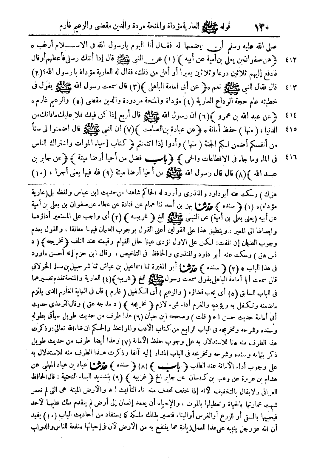هق ك) وسكت عنه أبو داود والمنذري وأورد له الحاكم شاهدا من حديث ابن عباس ولفظه (بل عارية مؤداه) * (1) {سنده} حدثنا بهز بن أسد ثنا همام عن قتادة عن عطاء عن صفوان بن يعلي بن أمية عن أبيه (يعني يعلي بن أمية) عن النبي صلى الله عليه وسلم الخ {غريبه} (2) أي واجب على المستعير أداؤها وإيصالها إلى المعير , وينطبق هذا على القولين أعني القول بوجوب الضمان فيهما مطلقا , والقول بعدم وجوب الضمان إن تلفت / لكن على الأول تؤدى عينا حال القيام وقيمته عند التلف {تخريجه} (د نس هق) وسكت عنه أبو داود والمنذري والحافظ في التلخيص , وقال ابن حزم إنه أحسن ما ورد في هذا الباب * (3) {سنده} حدثنا أبو المغيرة ثنا إسماعيل بن عياش ثنا شرحبيل بن مسلم الخولاني قال سمعت أبا أمامة الباهلي يقول سمعت رسول الله صلى الله عليه وسلم الخ {غريبه} (4) العارية والمنحة تقدم تفسيرهما في الباب السابق (5) أي يجب قضاؤه (والزعيم) أي الكفيل (غارم) قال في النهاية الغارم الذي يلتزم ما ضمنه وتكفل به ويؤديه والغرم أداء شيء لازم {تخريجه} (د مذ جه هق) وقال الترمذي حديث أبي أمامة حديث حسن أهـ (قلت) وصححه ابن حبان (6) هذا طرف من حديث طويل سيأتي بطوله وسنده وشرحه وتخريجه في الباب الرابع من كتاب الأدب والمواعظ والحكم إن شاء الله تعالى: وذكرت هذا الطرف منه للاستدلال له على وجوب حفظ الأمانة (7) هذا طرف من حديث طويل ذكر بتمامه وسنده وشرحه وتخريجه في الباب المشار إليه آنفا وذكرت هذا الطرف منه للاستدلال به على وجوب أداء الأمانة عند الطلب {باب} (8) {سنده} حدثنا عباد بن عباد المهلبي عن هشام بن عروة عن وهب بن كيسان عن جابر الخ {غريبه} (9) بتشديد الياء التحتية: قال الحافظ العراقي ولا يقال بالتخفيف لأنه إذا خفف تحذف منه تاء التأنيث أهـ والأرض الميتة هي التي لم تعمر شبهت عمارتها بالحياة وتعطيلها بالموت , والإحياء أن يعمد إنسان إلى أرض لم يتقدم ملك عليها لأحد فيحييها بالسقي أو الزرع أو الغرس أو البناء فتصير بذلك ملكه كما يستفاد من أحاديث الباب (10) يفيد أن الله عز وجل يثيبه على هذا العمل زيادة عما ينتفع به من الأرض لأن في إحيائها منفعة للناس والدواب