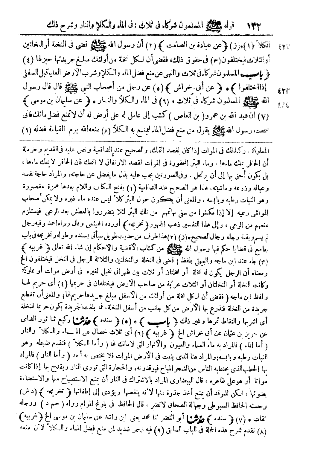 المملوكة وكذلك في الموات إذا كان لقصد التملك , والصحيح عند الشافعية ونص عليه في القديم وحرملة أن الحافر يملك ماءها , وماء البئر المحفورة في الموات لقصد الارتفاق لا التملك فإن الحافر لا يملك ماءها , بل يكون أحق بها إلى أن يرتحل , وفي الصورتين يجب عليه بذل ما يفضل عن حاجته , والمراد حاجة نفسه وعياله وزرعه وماشيته , هذا هو الصحيح عند الشافعية (1) بفتح الكاف واللام بعدها همزة مقصورة وهو النبات رطبه ويابسه , والمعنى أن يكون حول البئر كلأ ليس عنده ماء غيره ولا يمكن أصحاب المواشي رعيه إلا إذا مكنوا من سقي بهائمهم من تلك البئر لئلا يتضرروا بالعطش بعد الرعي فيستلزم منعهم من الرعي , وإلى هذا التفسير ذهب الجمهور {تخريجه} أورده الهيثمي وقال رواه أحمد وفيه رجل لم يسم وبقية رجاله رجال الصحيح * (ز) (2) هذا طرف من حديث طويل سيأتي بسنده وطوله وتخريجه في باب جامع قضايا حكم فيها رسول الله صلى الله عليه وسلم من كتاب الأقضية والأحكام إن شاء الله تعالى {غريبه} (3) جاء عند ابن ماجه البيهقي بلفظ (قضى في النخلة والنخلتين والثلاثة للرجل في النخل فيختلفون الخ) ومعناه أن الرجل يكون له نخلة أو نخلتين أو ثلاث بين ظهراني نخيل لغيره في أرض موات أو مملوكة وكانت النخلة أو النخلتان أو الثلاث عرّية من صاحب الأرض فيختلفان في حريمها (4) أي حريم لها ولفظ ابن ماجه (فقضى أنل كل نخلة من أولئك من الأسفل مبلغ جريدها حريم لها) والمعنى أن تقطع جريدة من النخلة فتذرع بها الأرض من كل جانب من أسفل النخلة , فما بلغت الجريدة يكون حريما النخلة أي لشربها والتقاط ثمرها وغير ذلك {باب} * (5) {سنده} حدثنا وكيع ثنا ثور الشامي عن حريز بن عثمان عن أبي خراش الخ {غريبه} (6) أي ثلاث خصال هي الماء والكلأ والنار (أما الماء) فالمراد به ماء السماء والعيون والأنهار التي لا مالك لها (وأما الكلأ) فتقدم ضبطه وهو النبات رطبه ويابسه: والمراد هنا الذي ينبت في الأرض الموات فلا يختص به أحد (وأما النار) فالمراد بها الحطب الذي يحتطبه الناس من الشجر المباح فيوقدونه , والحجارة التي توري النار ويقدح بها إذا كانت مواتا أو هو على ظاهره , قال البيضاوي المراد بالاشتراك في النار أن يمنع الاستصباح منها والاستضاءة بضوئها , لكن للموقد أن يمنع أخذ جذوة منها لأنه ينقصها ويؤدي إلى إطفائها {تخريجه} (د ش) وحسنه الحافظ السيوطي وجهالة الصحابي لا تضر , قال الحافظ في بلوغ المرام رواه (حم د) ورجاله ثقات * (7) {سنده} حدثنا أبو النضر ثنا محمد يعني ابن راشد عن سليمان بن موسى الخ {غريبه} (8) تقدم شرح هذه الجملة في الباب السابق (9) فيه زجر شديد لمن منع فضل الماء والكلأ لأن منعه