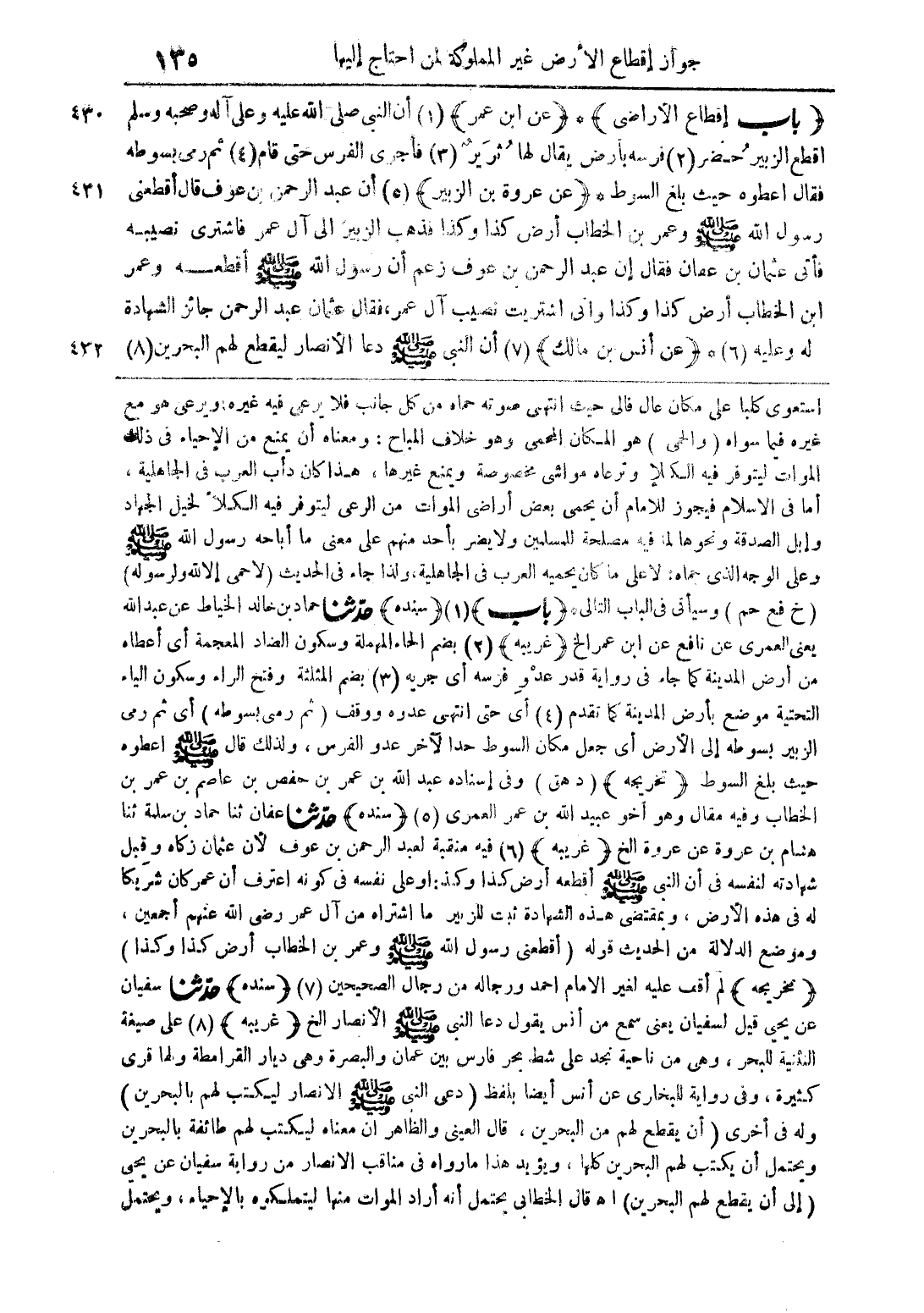 (باب إقطاع الأراضي) * (عن ابن عمر) (1) أن النبى صلى الله عليه وعلى آله وصحبه وسلم اقطع الزبير حضر (2) فرسه بأرض يقال لها ثريرٌ (3) فأجرى الفرس حتى قام (4) ثم رمى بسوطه فقال أعطوه حيث بلغ السوط * (عن عروة بن الزبير) (5) أن عبد الرحمن بن عوف قال أقطعنى رسول الله صلى الله عليه وسلم وعمر بن الخطاب أرض كذا وكذا فذهب الزبير إلى آل عمر فاشترى نصيبه فأتى عثمان بن عفان فقال إن عبد الرحمن بن عوف زعم أن رسول الله صلى الله عليه وسلم أقطعه وعمر ابن الخطاب أرض كذا وكذا وأنى اشتريت نصيب آل عمر، فقال عثمان عبد الرحمن جائز الشهادة له وعليه (6) * (عن أنس بن مالك) (7) أن النبى صلى الله عليه وسلم دعا الأنصار ليقطع لهم البحرين (8)