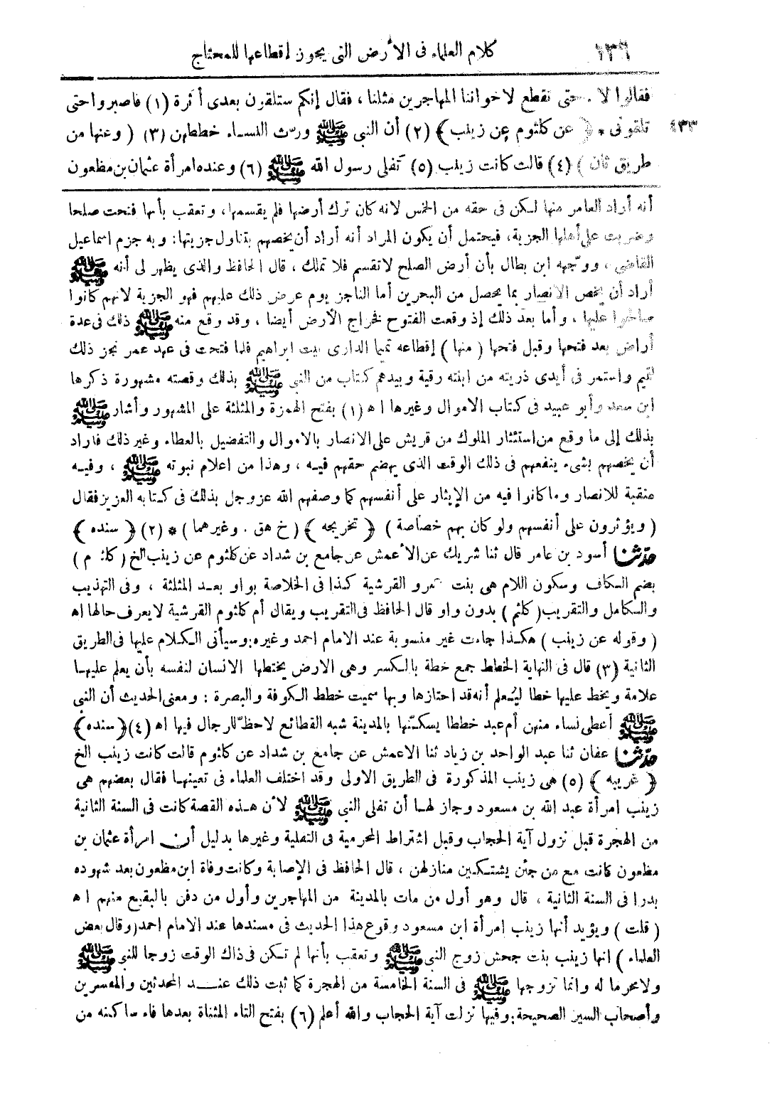 أنه أراد العامر منها لكن في حقه من الخمس لأنه كان ترك أرضها فلم يقسمها , وتعقب بأنها فتحت صلحا وضربت على أهلها الجزية , فيحتمل أن يكون المراد أنه أراد أن يخصهم بتناول جزيتها , وبه جزم إسماعيل القاضي , ووجهه ابن بطال بأن أرض الصلح لا تقسم فلا تملك , قال الحافظ والذي يظهر لي أنه صلى الله عليه وسلم أراد أن يخص الأنصار بما يحصل من البحرين أما الناجز يوم عرض ذلك عليهم فهو الجزية لأنهم كانوا سخوا عليها , وأما بعد ذلك إذا وقعت الفتوح فخرج الأرض أيضا , وقد وقع منه صلى الله عليه وسلم ذلك في عدة أراض بعد فتحها وقبل فتحها (منها) إقطاعه تميما الداري بيت إبراهيم فلما فتحت في عهد عمر نجز ذلك لتميم واستمر في أيدي ذريته من ابنته رقية وبيدهم كتاب من النبي صلى الله عليه وسلم بذلك وقصته مشهورة ذكرها ابن سعيد وأبو عبيد في كتاب الأموال وغيرها أهـ (1) بفتح الهمزة والمثلثة على المشهور وأشار صلى الله عليه وسلم بذالك إلى ما وقع من استئثار الملوك من قريش على الأنصار بالأموال والتفضيل بالعطاء وغير ذلك فأراد أن يخصهم بشيء ينفعهم في ذلك الوقت الذي يهضم حقهم فيه , وهذا من أعلام نبوته صلى الله عليه وسلم , وفيه منقبة للأنصار , وما كانوا فيه من الإيثار على أنفسهم كما وصفهم الله عز وجل في كتابه العزيز فقال (ويؤثرون على أنفسهم ولو كان بهم خصاصة) {تخريجه} (خ هق. وغيرهما) * (2) {سنده} حدثنا أسود بن عامر قال ثنا شريك عن الأعمش عن جامع بن شداد عن كلثوم عن زينب الخ (كلثوم) بضم الكاف وسكون اللام هي بنت عمرو القرشية كذا في الخلاصة بواو بعد المثلثة , وفي التهذيب والكامل والتقريب (كلثم) بدون واو قال الحافظ في التقريب ويقال أم كلثوم القرشية لا يعرف حالها أهـ (وقوله عن زينب) هكذا جاءت غير منسوبة عند الإمام أحمد وغيره: وسيأتي الكلام عليها في الطريق الثانية (3) قال في النهاية الخطط جمع خطة بالكسر وهي الأرض يختطها الإنسان لنفسه بأن يعلم عليها علامة ويخط عليها خطا ليًُعلم أنه قد اختارها وبها سميت خطط الكوفة والبصرة: ومعنى الحديث أن النبي صلى الله عليه وسلم أعطى نساء منهم أم عبد خططا يسكنها بالمدينة شبه القطائع لا حظ للرجال فيها أهـ (4) {سنده} حدثنا عفان ثنا عبد الواحد بن زياد ثنا الأعمش عن جامع بن شداد عن كلثوم قالت كانت زينب الخ {غريبه} (5) هي زينب المذكورة في الطريق الأولى وقد اختلف العلماء في تعيينها فقال بعضهم هي زينب امرأة عبد الله بن مسعود وجاز لها أن تفلي النبي صلى الله عليه وسلم لأن هذه القصة كانت في السنة الثانية من الهجرة قبل نزول آية الحجاب وقبل اشتراط المحرمية في التفيلة وغيرها بدليل أن امرأة عثمان بن مظعون كانت مع من جئن يشتكين منازلهن , قال الحافظ في الإصابة وكانت وفاة بن مظعون بعد شهوده بدرا في السنة الثانية , قال وهو أول من مات بالمدينة من المهاجرين وأول من دفع بالبقيع منهم أهـ (قلت) ويؤيد أنها زينب بنت جحش زوج النبي صلى الله عليه وسلم وتعقب بأنها لم تكن في ذاك الوقت زوجا للنبي صلى الله عليه وسلم ولا محرما له وإنما تزوجها صلى الله عليه وسلم في السنة الخامسة من الهجرة كما ثبت ذلك عند المحدثين والمفسرين وأصحاب السير الصحيحة: وفيها نزلت آية الحجاب والله أعلم (6) بفتح التاء المثناة بعدها فاء ساكنه من