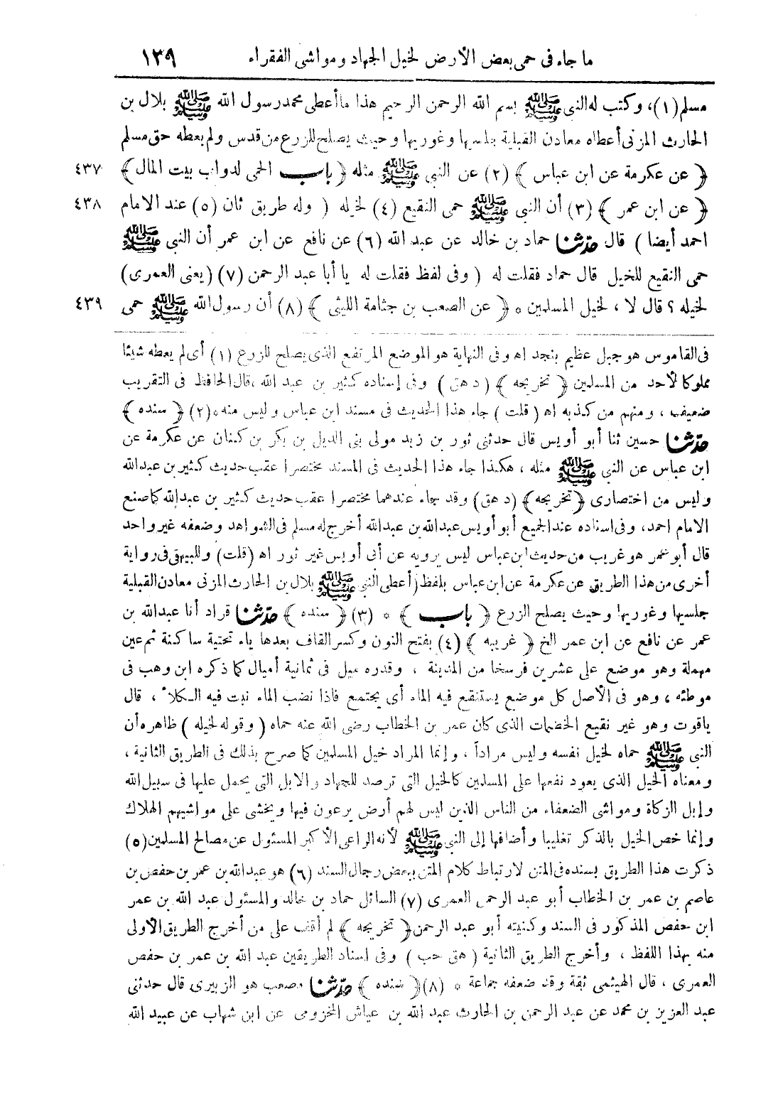 مسلم 01)، وكتب له النبى صلى الله عليه وسلم بسم الله الرحمن الرحيم هذا ما أعطى محمد رسول الله صلى الله عليه وسلم بلال بن الحارث المزنى أعطاه معادن القبلية جلبها وغوريها وحيث يصلح للزرع من قدس ولم يعطه حق مسلم (عن عكرمة عن ابن عباس) (2) عن النبى صلى الله عليه وسلم مثله (باب الحمى لدواب بيت المال) (عن ابن عمر) (3) أن النبى صلى الله عليه وسلم حمى النقيع (4) لخيله (وله طريق ثان (5) عند الإمام أحمد أيضاً) قال حدّثنا حماد بن خالد عن عبد الله (6) عن نافع عن ابن عمر أن النبى صلى الله عليه وسلم حمى النقيع للخيل قال حماد فقلت له (وفى لفظ فقلت له يا أبا عبد الرحمن (7) (يعنى العمرى) لخيله؟ قال لا، لخيل المسلمين * (عن الصعب بن جثامة الليثى) (8) أن رسول الله صلى الله عليه وسلم حمى