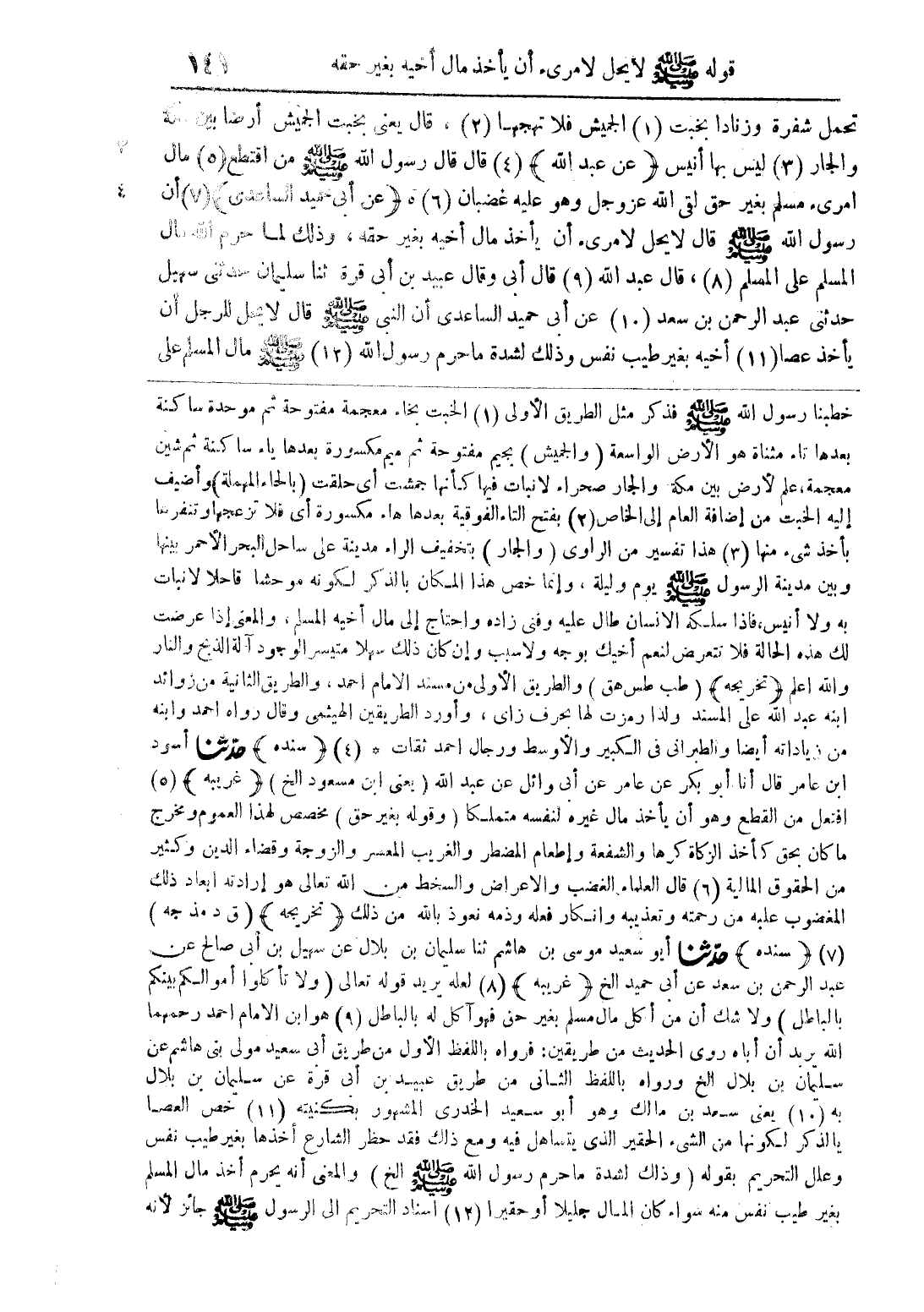 خطبنا رسول الله صلى الله عليه وسلم فذكر مثل الطريق الأولى (1) الخبت بخاء معجمة مفتوحة ثم موحدة ساكنة بعدها تاء مثناة هو الأرض الواسعة (والجميش) بجيم مفتوحة ثم ميم مكسورة بعدها ياء ساكنة ثم شين معجمة , علم لأرض بين مكة والجار صحراء لا نبات فيها كأنها جمشت أي حلقت (بالحاء المهملة) وأضيف إليه الخبت من إضافة العام إلى الخاص (2) بفتح التاء الفوقية بعدها هاء مكسورة أي فلا تزعجها وتنفر ما بأخذ شيء منها (3) هذا تفسير الراوي (والجار) بتخفيف الراء مدينة على ساحل البحر الأحمر بينها وبين مدينة رسول الله صلى الله عليه وسلم يوم وليلة , وإنما خص هذا المكان بالذكر لكونه موحشا قاحلا لا نبات به ولا أنيس , فإذا سلكه الإنسان طال عليه وفنى واحتاج إلى مال أخيه المسلم , والمعنى إذا عرضت لك هذه الحالة فلا تتعرض لنعم أخيك بوجه ولا سبب وإن كان ذلك سهلا متيسر الوجود آلة الذبح والنار والله أعلم {تخريجه} (طب طس هق) والطريق الأولى من مسند الإمام أحمد , والطريق الثانية من زوائد ابنه عبد الله على المسند ولذا رمزت لها بحرف زاي , وأورد الطريقين الهيثمي وقال رواه أحمد وابنه من زياداته أيضا والطبراني في الكبير والأوسط ورجال أحمد ثقات * (4) {سنده} حدثنا أسود ابن عامر قال ابن عامر قال أنا أبو بكر عن عامر عن أبي وائل عن عبد الله (يعني ابن مسعود الخ) {غريبه} (5) افتعل من القطع وهو أن يأخذ مال غيره لنفسه متملكا (وقوله بغير حق) مخصص لهذا العموم ومخرج ما كان بحق كأخذ الزكاة كرها والشفعة وإطعام المضطر والغريب المعسر والزوجة وقضاء الدين وكثير من الحقوق المالية (6) قال العلماء الغضب والإعراض والسخط من الله تعالى هو إرادته إبعاد ذلك المغضوب عليه من رحمته وتعذيبه وإنكار فعله وذمه نعوذ بالله من ذلك {تخريجه} (ق د مذ جه) (7) {سنده} حدثنا أبو سعيد موسى بن هاشم ثنا سليمان بن بلال عن سهيل بن أبي صالح عن عبد الرحمن بن سعد عن أبي حميد الخ {غريبه} (8) لعله يريد قوله تعالى (ولا تأكلوا أموالكم بينكم بالباطل) ولا شك أن من أكل مال مسلم بغير حف فهو آكل له بالباطل (9) هو ابن الإمام أحمد رحمهما الله يريد أن أباه روى الحديث من طريقين: فرواه باللفظ الأول من طريق أبي سعيد مولى بني هاشم عن سليمان بن بلال الخ ورواه باللفظ الثاني من طريق عبيد بن أبي قرة عن سليمان بن بلال عن سهيل بن بلال به (10) يعني سعد بن مالك وهو أبو سعيد الخدري المشهور بكنيته (11) خص العصا بالذكر لكونها من الشيء الحقير الذي يتساهل فيه ومع ذلك فقد حظر الشارع أخذها بغير طيب نفس وعلل التحريم بقوله (وذلك لشدة ما حرم رسول الله صلى الله عليه وسلم الخ) والمعنى أنه يحرم أخذ مال المسلم بغير طيب نفس منه سواء كان المال جليلا أو حقيرا (12) إسناد التحريم إلى الرسول صلى الله عليه وسلم جائز لأنه