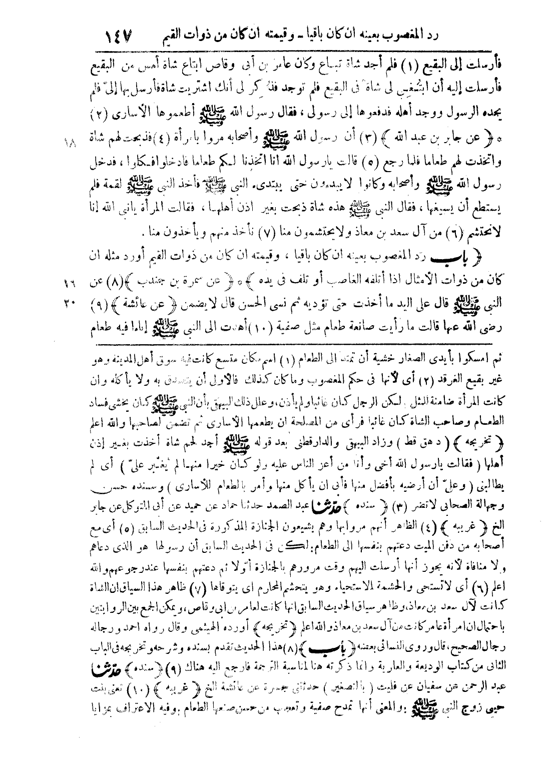 فأرسلت إلى البقيع (1) فلم أجد شاة تباع وكان عامر بن أبى وقاص ابتاع شاة أمس من البقيع فأرسلت إليه أن ابتُغِي لى شاة في البقيع فلم توجد فذُكِر لى أنك اشتريت شاة فأرسل بها إلىّ فلم يجده الرسول ووجد أهله فدفعوها إلى رسولى، فقال رسول الله صلى الله عليه وسلم أطعموها الأسارى (2) * (عن جابر بن عبد الله) (3) أن رسول الله صلى الله عليه وسلم وأصحابه مروا بامرأة (4) فذبحت لهم شاة واتخذت لهم طعاماً فلما رجع (5) قالت يا رسول الله إنا اتخذنا لكم طعاماً فادخلوا فكلوا، فدخل رسول الله صلى الله عليه وسلم وأصحابه وكانوا لا يبدون حتى يبتدئ النبى صلى الله عليه وسلم فأخذ النبى صلى الله عليه وسلم لقمة فلم يستطع أن يسيغها، فقال النبى صلى الله عليه وسلم هذه شاة ذبحت بغير إذن أهلها، فقالت المرأة يا نبى الله إنا لا نحتشم (6) من آل سعد بن معاذ ولا يحتشمون منا (7) نأخذ منهم ويأخذون منا.
