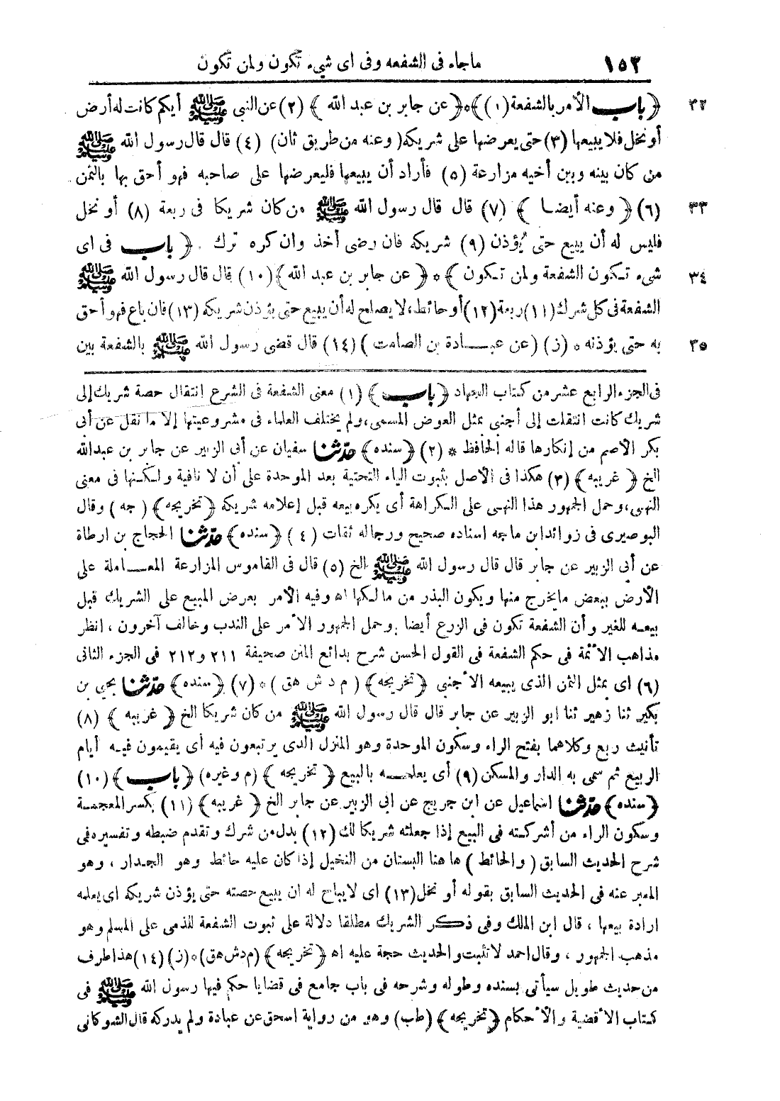 (باب الأمر بالشفعة) (1). (عن جابر بن عبد الله) (2) عن النبى صلى الله عليه وسلم أيكم كانت له أرض أو نخل فلا يبيعها (3) حتى يعرضها على شريكه (وعنه من طريق ثان) (4) قال قال رسول الله صلى الله عليه وسلم من كان بينه وبين أخيه مزارعة (5) فأراد أن يبيعها فليعرضها على صاحبه فهو أحق بها بالثمن (6) (وعنه أيضًا) (7) قال قال رسول الله صلى الله عليه وسلم من كان شريكًا فى ربعة (8) أو نخل فليس له أن يبيع حتى يؤذن (9) شريكه فان رضى أخذ وان كره ترك. (باب فى اى شئ تكون الشفعة ولمن تكون). (عن جابر بن عبد الله) (10) قال قال رسول الله صلى الله عليه وسلم الشفعة فى كل شرك (11) ربعة (12) أو حائط، لا يصلح له أن يبيع حتى يؤذن شريكه (13) فان باع فهو أحق به حتى يؤذنه. (ز) (عن عبادة بن الصامت) (14) قال قضى رسول الله صلى الله عليه وسلم بالشفعة بين