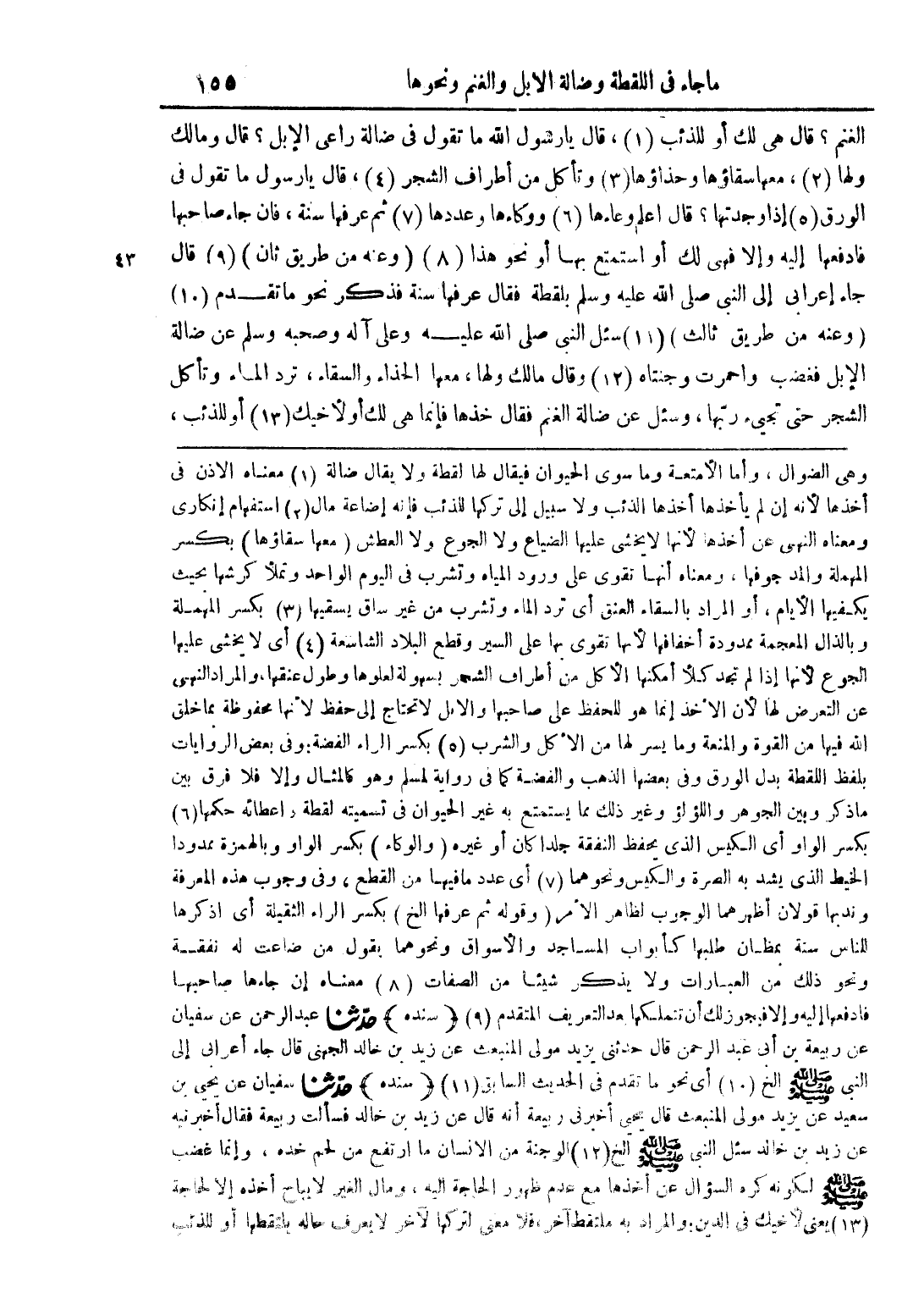 وهي الضوال، وأما الأمتعة وما سوى الحيوان فيقال لها لقطة ولا يقال ضالة (1) معناه الاذن فى أخذها لأنه إن لم يأخذها أخذها الذئب ولا سبيل إلى تركها للذئب فإنه إضاعة مال (2) استفهام إنكارى ومعناه النهى عن أخذها لأنها لا يخشى عليها الضياع ولا الجوع ولا العطش (معها سقاؤها) بكسر المهملة والمد جوفها، ومعناه أنها تقوى على ورود المياه وتشرب فى اليوم الواحد وتملأ كرشها بحيث يكفيها الأيام، أو المراد بالسقاء العنق أى ترد الماء وتشرب من غير ساق يسقيها (3) بكسر المهملة وبالذال المعجمة ممدودة أخفافها لأنها تقوى بها على السير وقطع البلاد الشاسعة (4) أى لا يخشى عليها الجوع لأنها إذا لم تجد كلأ أمكنها الأكل من أطراف الشجر بسهولة لعلوها وطول عنقها، والمراد النهى عن التعرض لها لأن الأخذ إنما هو للحفظ على صاحبها والابل لا تحتاج إلى حفظ لأنها محفوظة بما خلق الله فيها من القوة والمنعة وما يسر لها من الأكل والشرب (5) بكسر الراء الفضة: وفى بعض الروايات بلفظ اللقطة بدل الورق وفى بعضها الذهب والفضة كما فى رواية لمسلم وهو كالمثال وإلا فلا فرق بين ما ذكر وبين الجوهر واللؤلؤ وغير ذلك مما يستمتع به غير الحيوان فى تسميته لقطة واعطائه حكمها (6) بكسر الواو أى الكيس الذى يحفظ النفقة جلدًا كان أو غيره (والوكاء) بكسر الواو وبالهمزة ممدودًا الخيط الذى يشد به الصرة والكيس ونحوهما (7) أى عدد ما فيها من القطع، وفى وجوب هذه المعرفة وندبها قولان أظهرهما الوجوب لظاهر الأمر (وقوله ثم عرفها الخ) بكسر الراء الثقيلة أى اذكرها للناس سنة بمظان طلبها كأبواب المساجد والأسواق ونحوهما بقول من ضاعت له نفقة ونحو ذلك من العبارات ولا يذكر شيئًا من الصفات (8) معناه إن جاءها صاحبها فادفعها إليه وإلا فيجوز لك أن تتملكها بعد التعريف المتقدم (9) (سنده) حدّثنا عبد الرحمن عن سفيان عن ربيعة بن أبى عبد الرحمن قال حدثنى يزيد مولى المنبعث عن زيد بن خالد الجهنى قال جاء أعرابى إلى النبى صلى الله عليه وسلم الخ (10) أى نحو ما تقدم فى الحديث السابق (11) (سنده) حدّثنا سفيان عن يحيى بن سعيد عن يزيد مولى المنبعث قال يحيى أخبرنى ربيعة أنه قال عن زيد بن خالد فسألت ربيعة فقال أخبرنيه عن زيد بن خالد سئل النبى صلى الله عليه وسلم الخ (12) الوجنة من الانسان ما ارتفع من لحكم خده، وإنما غضب صلى الله عليه وسلم لكونه كره السؤال عن أخذها مع عدم ظهور الحاجة اليه، ومال للغير لا يباح أخذه إلا لحاجة (13) يعنى لأخيك فى الدين: والمراد به ملتقط آخر، فلا معنى لتركها لآخر لا يعرف حاله يلتقطها أو للذئب