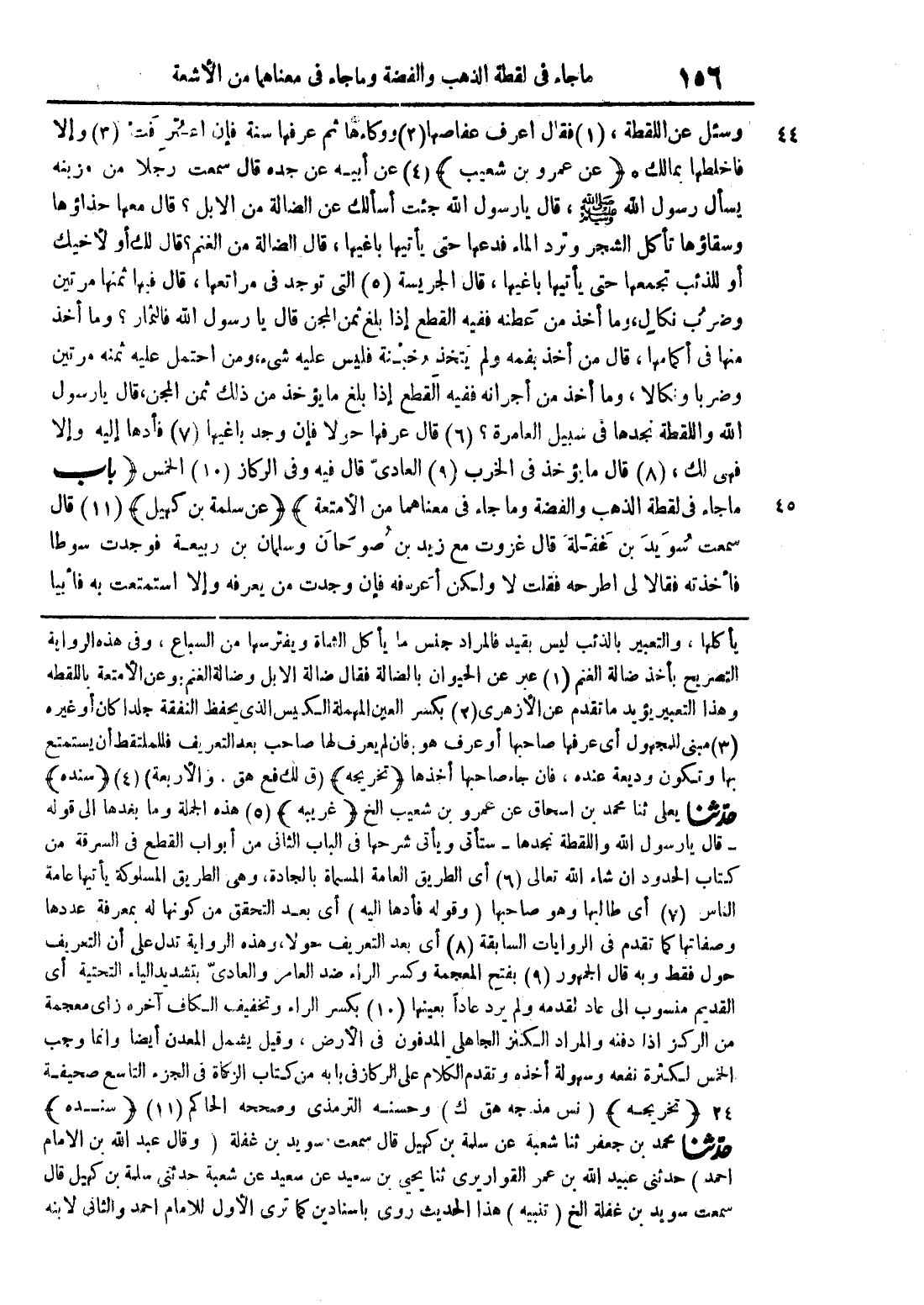 وسئل عن اللقطة، (1) فقال اعرف عفاصها (2) ووكاءها ثم عرفها سنة فإن اعرفت (3) وإلا فاخلطها بمالك. (عن عمرو بن شعيب) (4) عن أبيه عن جده قال سمعت رجلًا من مزينه يسأل رسول الله صلى الله عليه وسلم، قال يا رسول الله جئت أسألك عن الضالة من الابل؟ قال معها حذاؤها وسقاؤها تأكل الشجر وترد الماء فدعها حتى يأتيها باغيها، قال الضالة من الغنم؟ قال لك أو لأخيك أو للذئب تجمعها حتى يأتيها باغسها، قال الجريسة (5) التى توجد فى مراتعها، قال فيها ثمنها مرتين وضرب نكالٍ، وما أخذ من عطنه ففيه القطع إذا بلغ ثمن المجن قال يا رسول الله فالثمار؟ وما أخذ منها فى أكمامها، قال من أخذ بفمه ولم يتخذ وخبنة فليس عليه شئ، ومن احتمل عليه ثمنه مرتين وضربًا ونكالًا، وما أخذ من أجرانه ففيه القطع إذا بلغ ما يؤخذ من ذلك ثمن المجن، قال يا رسول الله واللقطة نجدها فى سبيل العامر؟ (6) قال عرفها حولًا فإن وجد باغيها (7) فأدها إليه وإلا فهى لك، (8) قال ما يؤخذ فى الخرب (9) العادىّ قال فيه وفى الركاز (10) الخمس (باب ما جاء لقطة الذهب والفضة وما جاء فى معناهما من الأمتعة) (عن سلمة بن كهيل) (11) قال سمعت سويد بن غفلة قال غزوت مع زيد بن صوحان وسلمان بن ربيعة فوجدت سوطًا فأخذته فقالا لى أطرحه فقلت لا ولكن أعرسفه فإن وجدت من يعرفه وإلا استمتعت به فأبيا