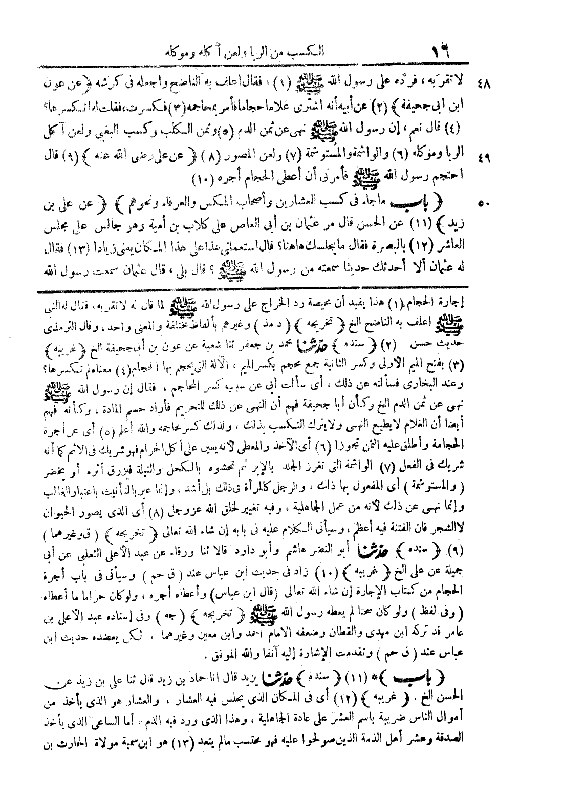 لا تقربه، فردَّه على رسول الله صلَّى الله عليه وسلم (1)، فقال اعلف به الناضح واجعله في كرشه (عن عون ابن ابي جحيفة) (2) عن أبيه أنه اشترى غلاما حجاما فأمر بمحاجمه (3) فكسرت، فقلت له اتكسرها؟ (4) قال نعم، إن سول الله صلَّى الله عليه وسلم نهى عن ثمن الدم (5) وثمن الكلب وكسب البغي ولعن آكل الربا وموكله (6) والواشمة والمستوشمة (7) ولعن المصور (8) (عن على رضى الله عنه) (9) قال احتجم رسول الله صلَّى الله عليه وسلم فأمرني أن أعطي الحجام أجره (10)