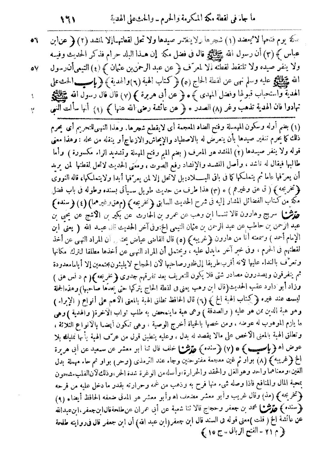 (1) بضم أوله وسكون المهملة وفتح الضاد المعجمة أى لا يقطع شجرها. وهذا النهى للتحريم أى يحرم ذلك كما يحرم تنفير صيدها (2) المنشد هو المعرف (بضم الميم وفتح المهملة وتشديد الراء المكسورة) وأما طالبها فيقال له ناشد، وأصل النشد والإنشاد رفع الصوت، ومعنى الحديث لا تحل لقطتها لمن يريد أن يعرّفها عامًا ثم يتملكها كما فى باقى البلاد: بل لا تحل إلا لمن يعرّفها أبدًا ولا يتملكها، قاله النووى (تخريجه) (ق هق وغيرهم). (3) هذا طرف من حديث طويل سيأتى بسنده وطوله فى بابا فضل مكة من كتاب الفضال المشار إليه فى شرح الحديث السابق (تخريجه) (م هق وغيرهما) (4) (سنده) حدّثنا سريج وهارون قالا ثنا ابن وهب عن عمرو بن الحارث عن بكير بن الأشج عن يحيى بن عبد الرحمن بن حاطب بن عبد الرحمن بن عثمان التيمى الخ. وفى آخر الحديث قال عبد الله (يعنى ابن الإمام أحمد) وسمعته أنا من هارون (غريبه) (5) قال القاضى عياض يحتمل أن المراد النهى عن أخذ لقطتهم فى الحرم، وفى خبر آخر ما يدل عليه، ويحتمل أن المراد النهى عن أخذها مطلقًا لنترك مكانها وتعرَّف بالنداء عليها لأنه أقرب طريقًا إلى ظهور صاحبها لأن الحجاج لا يلبثون مجتمعين إلا أيامًا معدودة ثم يتفرقون ويصدرون مصادر شتى فلا يكون للتعريف بعد تفرقهم جدوى (تخريجه) (م د نس هق) وزاد أبو داود عقب الحديث (قال ابن وهب يعنى فى لقطة الحاج يتركها حتى يجدها صاحبها) وهذه الجملة ليست عند غيره (كتاب لالهبة الخ) (6) قال الحافظ تطلق الهبة بالمعنى الأهم على أنواع (الإبراء) وهوهبة الدين ممن هو عليه (والصدقة) وهى هبة ما يتمحص به طلب ثواب الآخرة (والهدية) وهى ما يلزم الموهوب له عوضه، ومن خصها بالحياة أخرج الوصية، وهى تكون أيضًا بالأنواع الثلاثة، وتطلق الهبة بالمعنى الأخص على ما لا يقصد له بدل، وعليه ينطبق قول من عرّف الهبة بأنها تمليك بلا عوض اهـ (باب). (7) (سنده) حدّثنا خلف قال ثنا أبو معشر عن سعيد عن أبى هريرة الخ (غريبه) (8) بواو ثم غين معجمة مفتوحين وجاء عند الترمذى (وحر) بواو ثم حاء مهملة بدل الغين، ومعناهما واحد وهو الغل والحقد والحرارة، وأصله من الوغرة شدة الحر، وذلك لأن القلب مشحون بمحبة المال والمنافع فاذا وصله شئ منها فرح به وذهب من غمه وحرارته بقدر ما دخل عليه من فرحه (تخريجه) (مذ) وقال غريب وأبو معشر مضعف اهـ وأبو معشر هو المدنى ضعفه الحافظ أيضًا. (9) (سنده) حدّثنا محمد بن جعفر وحجاج قالا ثنا شعبة عن أبى عمران عن طلحة قال ابن جعفر، ابن عبد الله عن عائشة الخ (قلت) معنى قوله فى السند قال ابن جعفر (ابن عبد الله) أن ابن جعفر قال في روايته طلحة