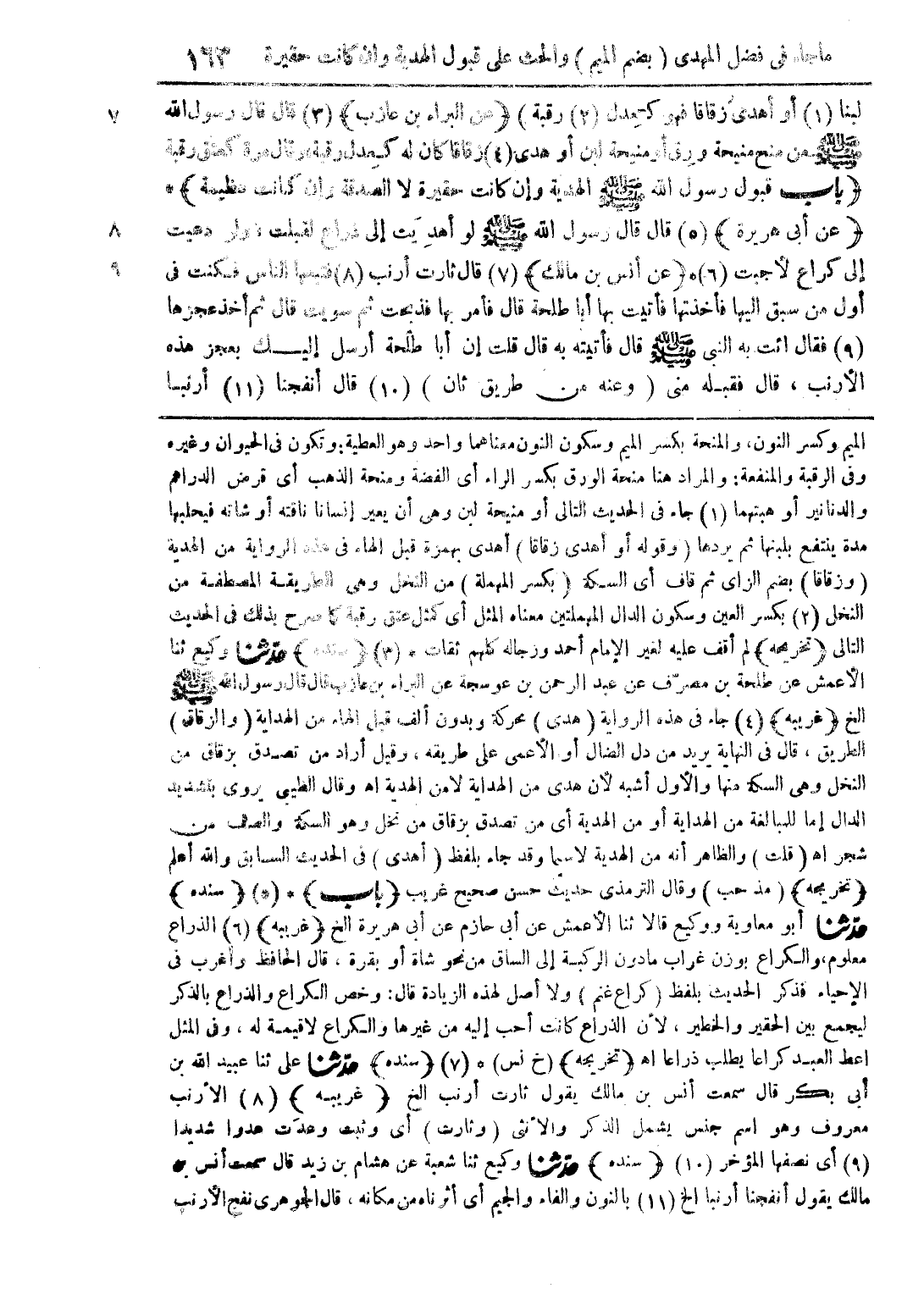 لبنا (1) أو أهدى زقاقًا فهو كعدل (2) رقبة) (عن البراء بن عازب) (3) قال قال رسول الله صلى الله عليه وسلم من منح منيحة ورق أو منيحة لبن أو هدى (4) زقاقًا كان له كعدل رقبة، وقال مرة كعتق رقبة (باب قبول رسول الله صلى الله عليه وسلم الهدية وإن كانت حقيرة لا الصدقة وان كانت عظيمة). (عن أبى هريرة) (5) قال قال رسول الله صلى الله عليه وسلم لو أهديت إلى شراع لقبلت ولو دعيت إلى كراع لأجبت (6). (عن أنس بن مالك) (7) قال ثارت أرنب (8) فتبعها الناس فكنت فى أول من سبق اليها فأخذتها فأتيت بها أبا طلحة قال فأمر بها فذبحت ثم سويت قال ثم أخذ عجزها (9) فقال أئت به النبى صلى الله عليه وسلم قال فأتيته به قال قلت إن أبا طلحة أرسل إليك بعجز هذه الأرنب، قال فقبله منى (وعنه من طريق ثان) (10) قال أنفجنا (11) أرنبًا