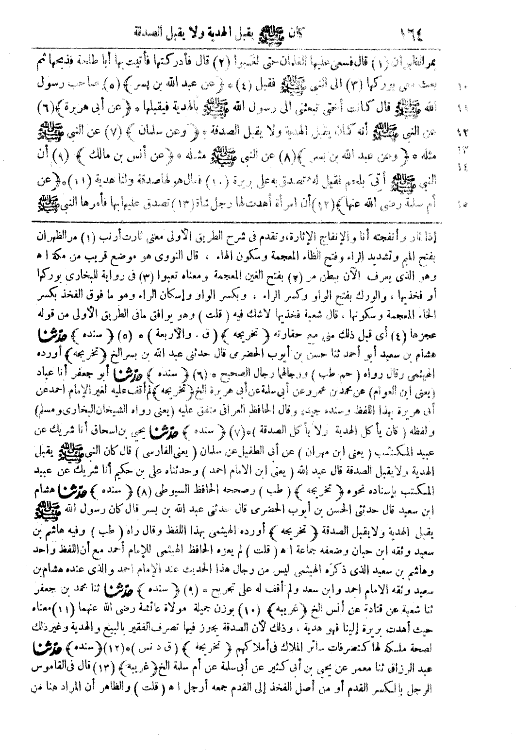 بمر الظهران (1) قال فسعى عليها الغلمان حتى لغبوا (2) قال فأدركتها فأتيت بها أبا طلحة فذبحها ثم بعث معى بوركها (3) الى النبى صلى الله عليه وسلم فقبل (4). (عن عبد الله بن يسر) (5) صاحب رسول الله صلى الله عليه وسلم قال كانت أختى تبعثنى إلى رسول الله صلى الله عليه وسلم بالهدية فيقبلها. (عن أبى هريرة) (6) عن النبى صلى الله عليه وسلم أنه كان يقبل الهدية ولا يقبل الصدقة. (وعن سلمان) (7) عن النبى صلى الله عليه وسلم مثله. (وعن عبد الله بن يس) (8) عن النبى صلى الله عليه وسلم مثله. (عن أنس بن مالك) (9) أن النبى صلى الله عليه وسلم أتر بلحم فقيل له تصدق به على بريرة (10) فمال هو لها صدقة ولنا هدية (11). (عن أم سلمة الله عنها) (12) أن امرأة أهدت لها رجل شاة (13) تصدق عليها بها فأمرها النبى صلى الله عليه وسلم