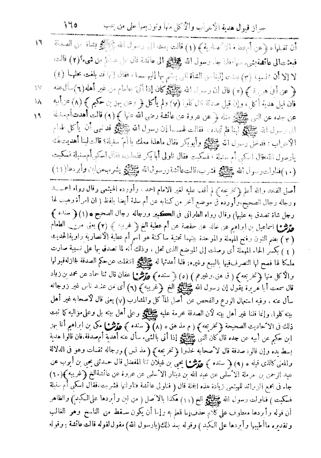 أصل الفخذ والله أعلم (تخريجه) لم أقف عليه لغير الامام احمد، وأورده الهيثمى وقال رواه احمد ورجاله رجال الصحيح، وأورده فى موضع آخر من كتابه عن أم سلمة أيضًا بلفظ (ان امرأة وهبت لها رجل شاة به عليها) وقال رواه الطبرانى فى الكبر ورجاله رجال الصحيح. (1) (سنده) حدّثنا اسماعيل بن ابراهيم عن خالد عن حفصة عن أم عطية الخ (غريبه) (2) يعنى من الطعام (3) بضم النون وفتح المهملة والموحدة بينهما تحتية ساكنة هو اسم أم عطية الأنصارية رواية الحديث (4) بكسر الحاء المهملة أى وصلت إلى الموضع الذى تحل، وذلك أنه لما تصدق بها على نسبية صارت ملكًا لها فصح لها التصرففيها بالبيع وغيره: فلما أهدتها له صلى الله عليه وسلم انتقلت عن حكم الصدقة فجاز له قبولها والأكل منها (تخريجه) (ق هق. وغيرهم) (5) (سنده) حدّثنا عفان قال ثنا حماد عن محمد بن زياد قال سمعت أبا هريرة يقول إن رسول الله صلى الله عليه وسلم الخ (غريبه) (6) أى من عند ناس غير زوجاته سأل عنه، وفيه استعمال الورع والفحص عن أصل المآكل والمشارب (7) يعنى قال لأصحابه غير أهل بيته كلوا، وإنما قتلنا غير أهل بيته لأن الصدقة محرمة عليه صلى الله عليه وسلم وعلى أهل بيته بل وعلى مواليه كما ثبت ذلك فى الأحاديث الصحيحة (تخريجه) (م مذ هق. (8) (سنده) حدّثنا مكى بن ابراهيم أنا بهز ابن حكيم ان أبيه عن جده قال كان النبى صلى الله عليه وسلم إذا أتى بالشئ سأل عنه أهدية أم صدقة، فان قالوا هدية بسط يده وإن قالوا قال لأصحابه خذوا (تخريجه) (مذ نس) ورجاله ثقات وهو فى الدلالة والمعنى كالذى قبله. (9) (سنده) حدّثنا يحيى بن غيلان ثنا المفضل قال حدثنى يحيى بن أيوب عن عبد الرحمن بن حرملة الأسلمى عن عبد الله بن دينار الأسلمى عن عروة عن عائشة الخ (غريبه) (10) جاء فى مجمع الزوائد للهيثمى زيادة هذه الجملة قال (فناولى عائشة فناولتها فشربت، فقال اسكبى أم حنبلة فسكبت) فناولت رسول الله صلى الله عليه وسلم الخ (11) هكذا بالأصل (من لبن وأبردها على الكبد) والظاهر أن قوله وأربردها معطوف على كلام حذف إما للعلم به وإما أن يكون سقط من الناسخ وهو الغالب وتقديره ما أطيبها وأبردها على الكبد) وقوله بعد ذلك (يا رسول الله) مقول لقوله قالت عائشة: وقوله