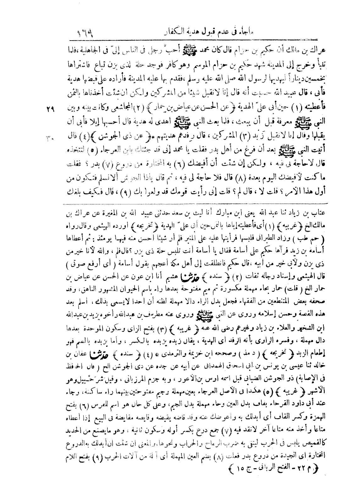 عراك بن مالك أن حكيم بن حرام قال كان محمد صلى الله عليه وسلم أحبَّ رجل فى الناس إلىّ فى الجاهلية، فلما تنبأ وخرج إلى المدينة شهد حكيم بن حزام الموسم وهو كافر فوجد حلة لذى يزن تباع فاشتراها بخمسين دينارًا ليهديها لرسول الله صلى الله عليه وسلم، فقدم بها عليه المدينة فأراده على قبضها هدية فأبى، قال عبيد الله حسبت أنه قال إنا لا نقبل شيئًا من المشركين ولكن ان شئت أخذناها بالثمن فأعطيته (1) حين أبى علىّ الهدية (عن الحسن عن عياض بن جمار) (2) المجاشعى وكان بينه وبين النبى صلى الله عليه وسلم معرفة قبل أن يبعث، فلما بعث النبى صلى الله عليه وسلم اهدى له هدية قال أحسبها إبلًا فأبى أن يقبلها وقال إنا لا نقبل زيد (3) المشركين، قال رفدهم هديتهم. (عن ذى الجوشن) (4) قال أتيت النبى صلى الله عليه وسلم بعد أن فرغ من أهل بدر فقلت يا محمد إنى قد جئتك بابن العرجاء (5) لتتخذه قال لا حاجة لى فيه، ولكن إن شئت أن أفيضك (6) به المختارة من دروع (7) بدر؟ فقلت ما كنت لأفيضك اليوم بعدة (8) قال فلا حاجة لى فيه، ثم ثال يا ذا الجوش ألا نسلم فتكون من أول هذا الأمر؟ قلت لا، قال لم؟ قلت إنى رأيت قومك قد ولعوا بك (9)، قال فكيف بلغك