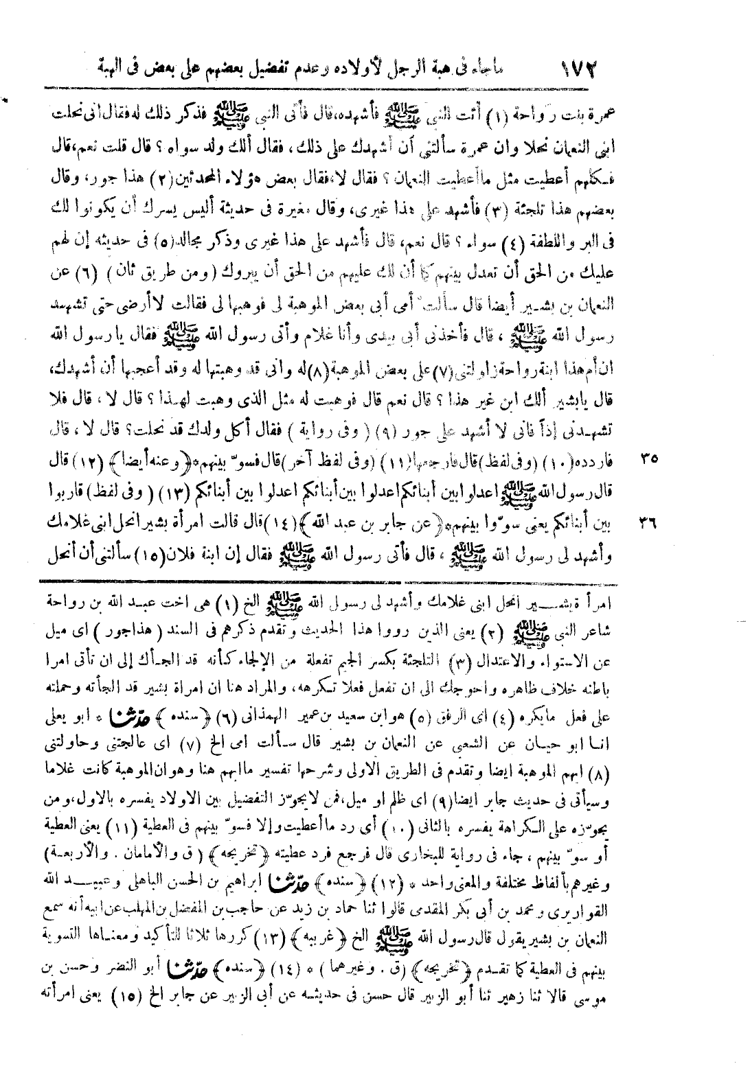 عمرة بنت رواحة (1) أئت النبى صلى الله عليه وسلم فأشهده، قال فأتى النبى صلى الله عليه وسلم فذكر ذلك له فقال انى نحلت ابنى النعمان نحلًا وان عمرة سألتنى أن أشهدك على ذلك، فقال ألك ولد سواه؟ قال قلت نعم، قال فكلهم أعطيت مثل ما أعطيت النعمان؟ فقال لا، فقال بعض هؤلاء المحدثين (2) هذا جوز، وقال بعضهم هذا تلجئة (3) فأشهد على هذا غيرى، وقال مغيرة فى حديثة أليس يسرك أن يكونوا لك فى البر واللطفة (4) سواء؟ قال نعم، قال فأشهد على هذا غيرى وذكر مجالد (5) فى حديثه إن لهم عليك من الحق أن تعدل بينهم كما أن لك عليهم من الحق أن يبروك (ومن طريق ثان) (6) عن النعمان بن بشير أيضًا قال سألت أمى أبى بعض الموهبة لى فقالت لا أرضى حتى تشهد رسول الله صلى الله عليه وسلم، قال فأخذنى أبى بيدى وأنا غلام وأتى رسول الله صلى الله عليه وسلم فقال يا رسول الله أن أم هذا ابنة رواحة زاولتنى (7) على بعض الموهبة (8) له وانى قد وهبتها له وقد أعجبها أن أشهدك، قال يثير ألك ابن غير هذا؟ قال نعم قال فوهبت له مثل الذى وهبت لهذا؟ قال لا، قال فلا تشهدنى إذا فانى لا أشهد على جور (9) (وفى رواية) فقال أكل ولدك قد نحلت؟ قال لا، قال فأورده (10) (وفى لفظ) قال فارجعها (11) وفى لفظ آخر) قال فسوّ بينهم. (وعنه أيضًا) (12) قال قال رسول الله صلى الله عليه وسلم اعدلوا بين أبنائكم (13) (وفى لفظ) قاربوا بين أبنائكم يعنى سوّوا بينهم. (عن جابر بن عبد الله) (14) قال قالت امرأة بشير انحل ابنى غلامك وأشهد لى رسول الله صلى الله عليه وسلم، قال فأتى رسول الله صلى الله عليه وسلم فقال إن ابنة فلان (15) سألتني أن أنحل