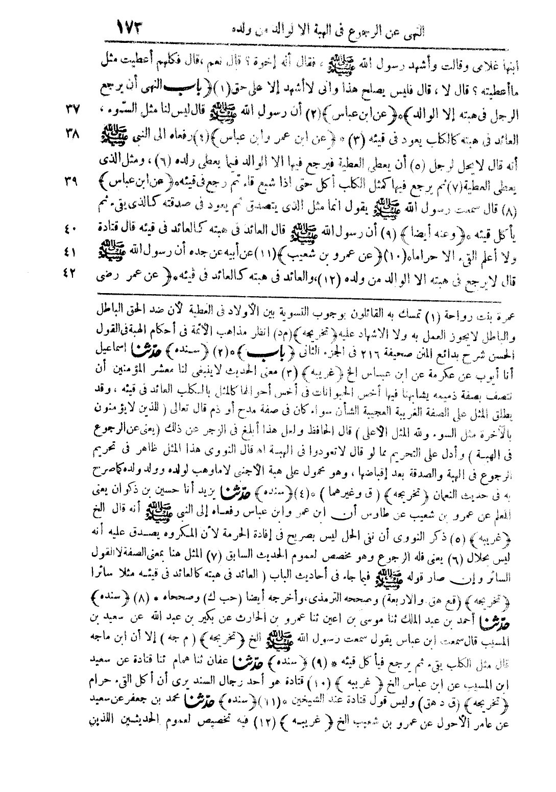 ابنها غلامي وقالت وأشهد رسول الله صلى الله عليه وسلم، فقال أنه إخوة؟ قال نعم، فكلهم أعطيت مثل ما أعطيته؟ قال لا، قال فليس يصلح هذا وانى لا أشهد إلا على حق (1) (باب النهى أن يرجع الرجل فى هبته إلا الوالد). (عن ابن عباس) (2) أن رسول الله صلى الله عليه وسلم قال ليس لنا مثل السّوء، العائد فى هبته كالكلب يعود فى قيئه (3). (عن ابن عمر وابن عباس) (4) رفعاه الى النبى صلى الله عليه وسلم أنه قال لا يحل لرجل (5) أن يعطى العطية فيرجع فيها الا الوالد فيما يعطى ولده (6)، ومثل الذى يعطى العطية (7) ثم يرجع كمثل الكلب أكل حتى إذا شبع قاء ثم رجع فى قيئه. (عن ابن عباس) (8) قال سمعت رسول الله صلى الله عليه وسلم يقول انما مثل الذى يتصدق ثم يعود فى صدقته كما الذى يقىّ ثم يأكل قيئه. وعنه أيضًا) (9) أن رسول الله صلى الله عليه وسلم قال العائد فى هبته كالعائد فى قيئه قال قتادة ولا أعلم القئ الا حرامًا. (10) (عن عمرو بن شعيب) (11) عن أبيه عن جده أن رسول الله صلى الله عليه وسلم قال لا يرجع فى هبته الا الوالد من ولده (12)، والعائد فى هبته كالعائد فى قيئه. (عن عمر رضي