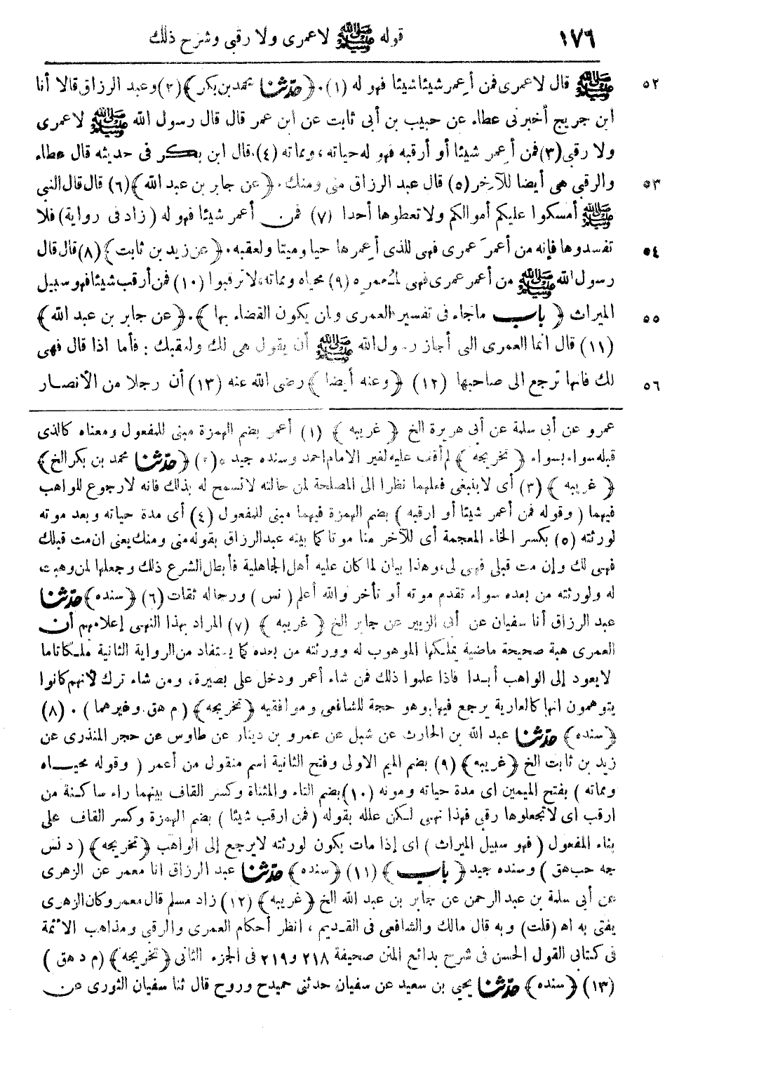 عمرو عن أبي سلمة عن أبى هريرة الخ (غريبه) (1) أعمر بضم الهمزة مبنى للمفعول ومعناه كالذى قبله سواء بسواء (تخريجه) لم أقف عليه لغير الامام احمد وسنده جيد. (2) حدّثنا محمد بن بكر الخ) (غريبه) (3) اى لا ينبغى فعلهما نظرًا الى المصلحة لمن حالته لا تسمح له بذلك فانه لا رجوع للواهب فيهما (وقوله فمن أعمر شيئًا أو ارقبه) بضم الهمزة فيهما مبنى للمفعول (4) أى مدة حياته وبعد موته لورثته (5) بكسر الخاء المعجمة أى للآخر منا موتًا كما بينه عبد الرازق بقوله منى ومنك يعنى ان مت قبلك فهى لك وان مت قبلى فهى لى، وهذا بيان لما كان عليه أهل الجاهلية فأبطل الشرع ذلك وجعلها لمن وهبت له ولورثته من بعده سواء تقدم موته أو تأخر والله أعلم (نس) ورجاله ثقات (6) (سنده) حدّثنا عبد الرازق أنا سفيان عن أبى الزبير عن جابر الخ (غريبه) (7) المراد بهذا النهى إعلامهم أن العمرى هبة صحيحة ماضية يملكها الموهوب له وورثته من بعده كما يستفاد من الرواية الثانية ملكًا تامًا لا يعود ألى الواهب أبدًا فذا علموا ذلك فمن شاء أعمر ودخل على بصيرة، ومن شاء ترك لأنهم كانوا يتوهمون انها كالعارية يرجع فيها: وهو حجة للشافعى وموافقيه (تخريجه) (م هق. وغيرهما). (8) (سنده) حدّثنا عبد الله بن الحارث عن شبل عن عمرو بن دينار عن طاوس عن حجر المنذرى عن زيد بن ثابت الخ (غريبه) (9) بضم الميم الاولى وفتح الثانية اسم منقول من أعمر (وقوله محياه ومماته) بفتح الميمين اى مدة حياته وموته (10) بضم التاء والمثناة وكسر القاف بينهما راء ساكنة من ارقب اى لا تجعلوها رقبى فهذا نهى لكن علله بقوله (فمن ارقب شيئًا) بضم الهمزة وكسر القاف على بناء المفعول (فهو سبيل الميراث) اى إذا مات إذا مات يكون لورثته لا يرجع إلى الواهب (تخريجه) (د نس جه حب هق) وسنده جيد (باب) (11) (سنده) حدّثنا عبد الرازق انا معمر عن الزهرى عن أبى سلمة بن عبد الرحمن عن جابر بن عبد الله الخ (غريبه) (12) زاد مسلم قال معمر وكان الزهرى يفتى به اهـ (قلت) وبه قال مالك والشافعى فى القديم، انظر أحكام العمرى والرقى ومذاهب الأئمة فى كتابى القول الحسن فى شرح بدائع المنن صحيفة 218 و 219 الجزء الثانى (تخريجه) (م د هق) (13) (سنده) حدّثنا يحيى بن سعيد عن سفيان حدثنى حميدح وروح قال ثنا سفيان الثوري عن