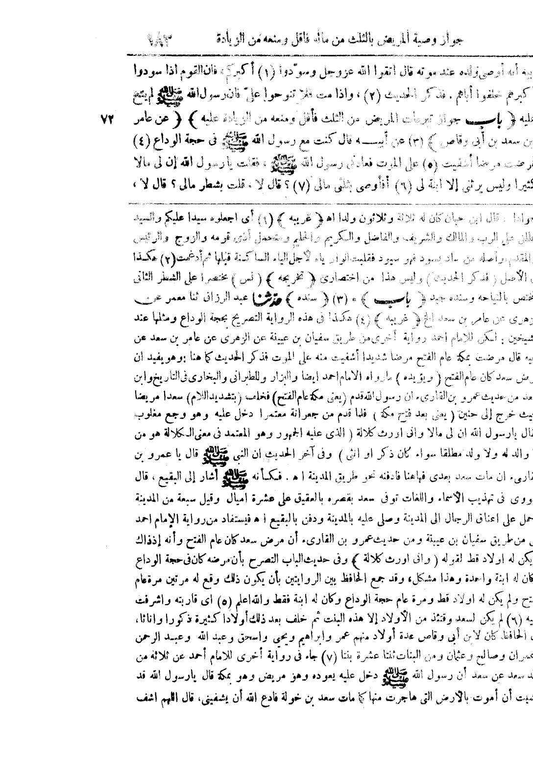 جوادًا: قال ابن حبان كان له ثلاثة وثلاثون ولدًا أهـ (غريبة) (1) أي أجعلوه سيدًا عليكم والسيد انطلق على الرب والمالك والشريف والفاضل والكريم والحليم ومتحمل أذي قومه والزوج والرئيس المقدم وأصله نم ساد يسود فهو سيود فقلبت الولد ياه لأجل الياء الساكنة قبلها ثم أدغمت (2) هكذا في الأصل (فذكر الحديث) وليس هذا من اختصاري (تخريجه) نس) مختصرًا على الشطر الثاني مختص بالنياحة وسنده جيد (باب) (3) (سنده) حدّثنا عبد الرازق ثنا معمر عن أزهري عن عامر بن سعد الخ (غريبة) (4) هكذا في هذا الرواية التصريح بحجة الوداع ومثلها عند الشيخين: لكن للإمام أحمد رواية أخرى من طريق سفيان بن عيينه عن الزهري عن عامر بن سعد عن قال مرضت بمكة عام الفتح مرضًا شديدًا أشفيت منه على الموت فذكر الحديث كما هنا: وهو يفيد أن مرض سعد كان عام الفتح (ويؤيده) ورواه الإمام أحمد أيضًا والبزار وللطبراني والبخاري في التاريخ وابن بعد نم حديث عمرو بن القارئ أن رسول الله قدم (يعني مكة عام الفتح) فخلف (بتشديد اللام) سعدًا مريضًا حيث خرج إلى حنين (يعني بعد فتح مكة) فلما قدم من جعوانة معتمرًا دخل عليه وهو وجع مغلوب قال يا رسول الله إن لي مالاً وإني أورث كلالة (الذي عليه الجمهور وهو المعتمد في معني الكلالة هو من والد له ولا ولد مطلقًا سواء كان ذكر أو أنثى) وفي آخر الحديث أن النبي (صلى الله عليه وسلم) قال يا عمرو بن القاري إن مات سعد بعدي فهاهنا فادفنه نحو طريق المدينة أهـ فكأنه (صلى الله عليه وسلم) أشار إلى البقيع، قال النووي في تذهب الأسماء واللغات توفي سعد بقصره بالعقيق على عشرة أميال وقيل سبعة من المدينة حمل على أعناق الرجال إلى المدينة وصلى عليه بالمدينة ودفن بالبقيع أهـ فيستفاد من رواية الإمام أحمد من طريق سفيان بن عيينة ومن حديث عمرو بن القارئ أن مرض سعد كان عام الفتح وأنه إذا ذاك يكن له أولاد قط لقوله (وإني أورث كلالة) وفي حديث الباب التصريح بأن مرضه كان في حجة الوداع كان له أبنه واحدة وهذا مشكل، وقد جمع الحافظ بين الروايتين بأن يكون ذلك وقع له مرتين مرة عام الفتح ولم يكن له أولاد قطورة عام حجة الوداع وكان له أبنه فقط والله أعلم (5) أي قاربته وأشرفت عليه (6) لم يكن لسعد وقتئذ من الأولاد إلا هذه البنت ثم خلف بعد ذلك أولادًا كثيرة ذكورًا وإناثًا، قال الحافظ كان لابن أبي وقاص عدة أولاد منهم عمر وإبراهيم ويحيي وإسحاق وعبد الله وعبد الرحمن عمران وصالح وعثمان ومن البنات ثنتا عشرة بنتاً (7) جاء في رواية أخرى للإمام أحمد عن ثلاثة من ولد سعد عن سعد أن رسول الله (صلى الله عليه وسلم) دخل عليه يعوده وهو مريض وهو بمكة قال يا رسول الله قد نسيت أن أموت بالأرض التي هاجرت منها كما مات سعد بن خولة فأدع الله أن يشفيني، قال اللهم اشف