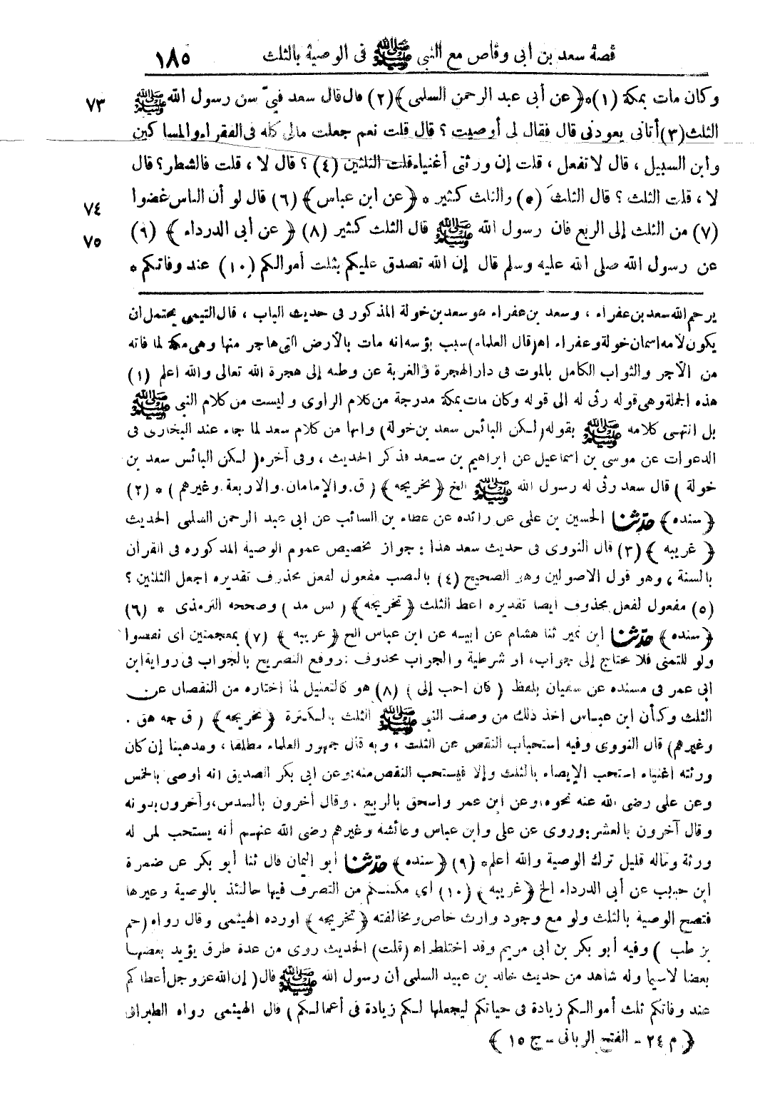 وكان مات بمكة (1) (عن أبي عبد الرحمن السلمي) (2) قال سعد فيّ سن رسول الله (صلى الله عليه وسلم) (3) أتاني يعودني قال فقال لي أوصيت؟ قال قلت نعم جعلت مالي كله في الفقراء أو المساكين وابن السبيل، قال لا تفعل، قلت إن ورثتني أغنياء قلت الثلثين (4)؟ قال لا، قلت فالشطر؟ قال لا، قلت الثلث؟ قال الثلث (5) والثلث كثيرة (عن ابن عباس) (6) قال لو أن الناس غضوا (7) من الثلث إلى الربع فإن رسول الله (صلى الله عليه وسلم) قال الثلث كثير (8) (عن أبي الدرداء) (9) عن رسول الله (صلى الله عليه وسلم) قال إن الله تصدق عليكم بثلث أموالكم (10) عند وفاتكم