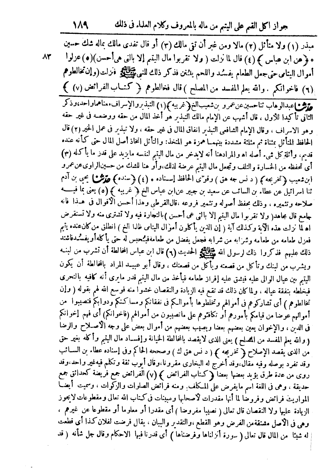 حدّثنا عبد الوهاب ثنا حسين عن عمرو بن شعيب الخ (غريبة) (1) التبذير والإسراف معناهما واحد، وذكر الثاني تأكيدًا للأول، قال أشهب عن الإمام مالك التبذير هو أخذ المال من حقه ووضعه في غير حقه وهو الإسراف، وقال الإمام الشافعي التبذير إنفاق المال في غير حقه، ولا تبذير في عمل الخير (2) قال الحافظ المتأثر بمثناه ثم مثلثة مشددة بينهما همزة من المتخذ: والتأثل اتخاذ أصل المال حتى كأنه عنده قديم، واثله كل شيء أصله أهـ والمراد هنا أنه لا يدخل من مال اليتيم لنفسه ما يزيد على قدر ما يأله (3) أي تحفظه من الخسارة والتلف وتجعل مال اليتيم عرضه لذلك، وأو هنا لشك من حسين الراوي عن عمرو ابن شعيب (تخريجه) (د نس جه هق) وقويّ الحافظ إسناده (4) (سنده) حدّثنا يحيي بن آدم ثنا إسرائيل عن عطاء بن السائب عن سعيد بن جبير عن ابن عباس الخ (غريبة) (5) يعني بما فيه صلاحه وتثميره، وذلك بحفظ أصوله وتثمير فروعه، قال القرطبي وهذا أحسن الأقوال في هذا فإنه جامع قال مجاهد (ولا تقربوا مال اليتيم إلا بالتلي هي أحسن) بالتجارة فيه ولا تشتري منه ولا تستقرض أهـ لما نزلت هذه الآية وكذلك آية (إن الذين يأكلون أموال اليتامي ظلمًا الخ) انطلق من كان عنده يتيم فعزل طعامه من طعامه وشرابه من شرابه فجعل يفضل من طعامه فيحبس له حتى يأكله أو يفسد فاشتد ذلك عليهم فذكروا ذلك لرسول الله (صلى الله عليه وسلم) الحديث (6) قال ابن عباس المخالطة أن تشرب من لبنه ويشرب من لبنك وتأكل من قصعته ويأكل من قصعتك، وقال أبو عبيد المراد بالمخالطة أن يكون اليتيم بين عيال الوالي عليه فيشق عليه إفراز طعامه فيأخذ من مال اليتيم قدر ما يري أنه كافية بالتحري فيخلطه بنفقه عياله، ولما كان قد تقع فيه الزيادة والنقصان خشوا منه فوسع الله لهم بقوله (وإن تخالطوهم) أي تشاركوهم في أموالهم وتخلطوها بأموالكم في نفقاتكم ومساكنكم ودوابكم فتصيبوا من أموالهم عوضًا من قيامكم بأمورهم أو تكافئوهم على ما تصيبون من أموال (فأخوانكم) أي فهم إخوانكم في الدين، والإخوان يعين بعضهم بعضًا ويصيب بعضهم من أموال بعض على وجه الإصلاح والرضا (والله يعلم المفسد من المصلح) يعني الذي لا يقصد بالمخالطة الخيانة وإفساد مال اليتيم وأكله بغير حق من الذي يقصد الإصلاح (تخريجه) (د نس هق ك) وصححه الحاكم وفي إسناده عطاء بن السائب وقد تفرد بوصلة وفيه مقال، وقد أخرج له البخاري مقرونًا، وقال أيوب ثقة وتكلم فيه غير واحد، وقد روي من عدة طرق يؤيد بعضها بعضًا (كتاب الفرائض) (7) الفرائض جمع فريضة كحدائق جمع حديقة، وهي في اللغة اسم ما يفرض على المكلف، ومنه فرائض الصلوات والزكوات، وسميت أيضًا المواريث فرائض وفروضًا لماأنها مقدرات لأصحابها ومبينات في كتاب الله تعالى ومقطوعات لا يجوز الزيادة عليها ولا النقصان قال تعالى (نصيبًا مفروضًا) أي مقدراً أو معلومًا أو مقطوعًا عن غيرهم، وهي في الأصل مشتقة من الفرض وهو القطع والتقدير والبيان، يقال فرضت لفان كذا أي قطعت له شيئًا من المال قال تعالى (سورة أنزلناها وفرضناها) أي قدرنا فيها الأحكام وقل جل شأنه (قد