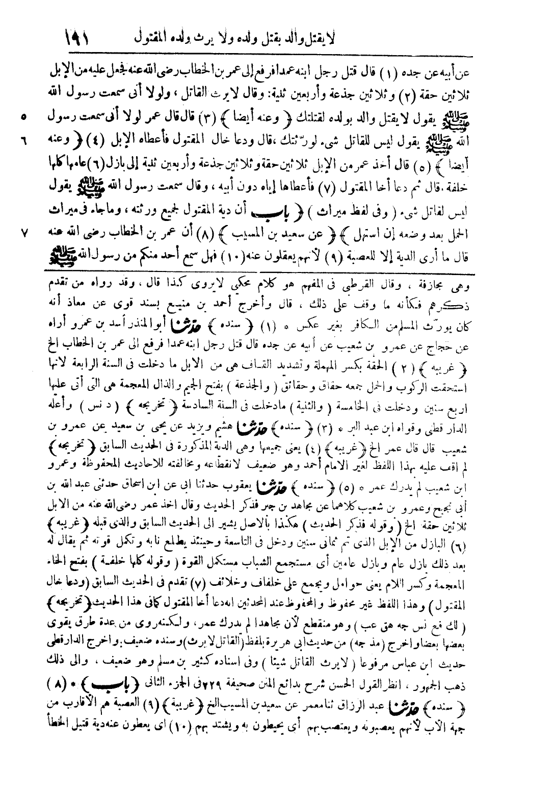 وهي مجازفة، وقال القرطبي في المفهم هو كلام محي لا يروي كذا قال، وقد رواه من تقدم ذكرهم فكأنه ما وقف على ذلك، قال وأخرج أحمد بن منيع بسند قوي عن معاذ أنه كان يورث المسلم من الكافر بغير عكس (1) (سنده) حدّثنا أبو المنذر أسد بن عمرو أراه عن حجاج عن عمرو بن شعيب عن أبيه عن جده قال قتل رجل ابنه عمدًا فرفع إلى عمر بن الخطاب الخ (غريبة) (2) الحقة بكسر المهملة وتشديد القاف هي من الإبل ما دخلت في السنة الرابعة لأنها استحقت الركوب والحمل جمعة حقاق وحقائق (والجذعة) بفتح الجيم والذال المعجمة هي التي أتي عليها أربع سنين ودخلت في الخامسة (والثنية) ما دخلت في السنة السادسة (تخريجه) (د نس) وأعله الدارقطني وقواه أبن عبد البر (3) (سنده) حدّثنا هشيم ويزيد عن يحيي بن سعيد عن عمرو بن شعيب قال قال عمر الخ (غريبة) (4) يعني جميعها وهي الدية المذكورة في الحديث لسابق (تخريجه) لم أقف عليه بهذا اللفظ لغير الإمام أحمد وهو ضعيف لانقطاعه ومخالفته للأحاديث المحفوظة وعمرو ابن شعيب لم يدرك عمر (5) (سنده) حدّثنا يعقوب حدثنا أبي عن أبن إسحاق حدثني عبد الله بن أبي نجيح وعمرو بن شعيب كلاهما عن مجاهد بن جبر فذكر الحديث وقال أخذ عمر رضي الله عنه من الإبل ثلاثين حقه الخ (وقوله فذكر الحديث) هكذا بالأصل يشير إلى الحديث السابق والذي قبله (غريبة) (6) البازل من الإبل الذي تم ثماني سنين ودخل في التاسعة وحينئذ يطلع نابه وتكمل قوته ثم يقال له بعد ذلك بازل عام وبازل عامين أي مستجمع الشباب مستكمل القوة (وقوله كلها خلفه) بفتح الخاء المعجمة وكسر اللام يعني حوامل ويجمع على خلفاف وخلائف (7) تقدم في الحديث السابق (ودعا خال المقتول) وهذا اللفظ غير محفوظ والمحفوظ عند المحدثين أنه دعا أخا المقتول كما في هذا الحديث (تخريجه) (لك فع نس جه هق عب) وهو منقطع لأن مجاهدًا لم يدرك عمر، ولكنه روي من عدة طرق يقوي بعضها بعضًا وأخرج (مذجه) من حديث أبي هريرة بلفظ (القاتل لا يرث) وسنده ضعيف، وإخراج الدارقطني حديث ابن عباس مرفوعًا (لا يرث القاتل شيئًا) وفي إسناده كثير بن مسلم وهو ضعيف، وإلى ذلك هذب الجمهور، أنظر القول الحسن شرح بدائع المتن صحيفة 229 في الجزء الثاني (باب) (8) (سنده) حدّثنا عبد الرازق ثنا معمر عن سعيد بن المسيب الخ (غريبة) (9) العصبة هم الأقارب من جهة الأب لأنهم يعصبونه ويعتصب بهم أي يحيطون به ويشتد بهم (10) أي يعطون عن دية قتيل الخطأ