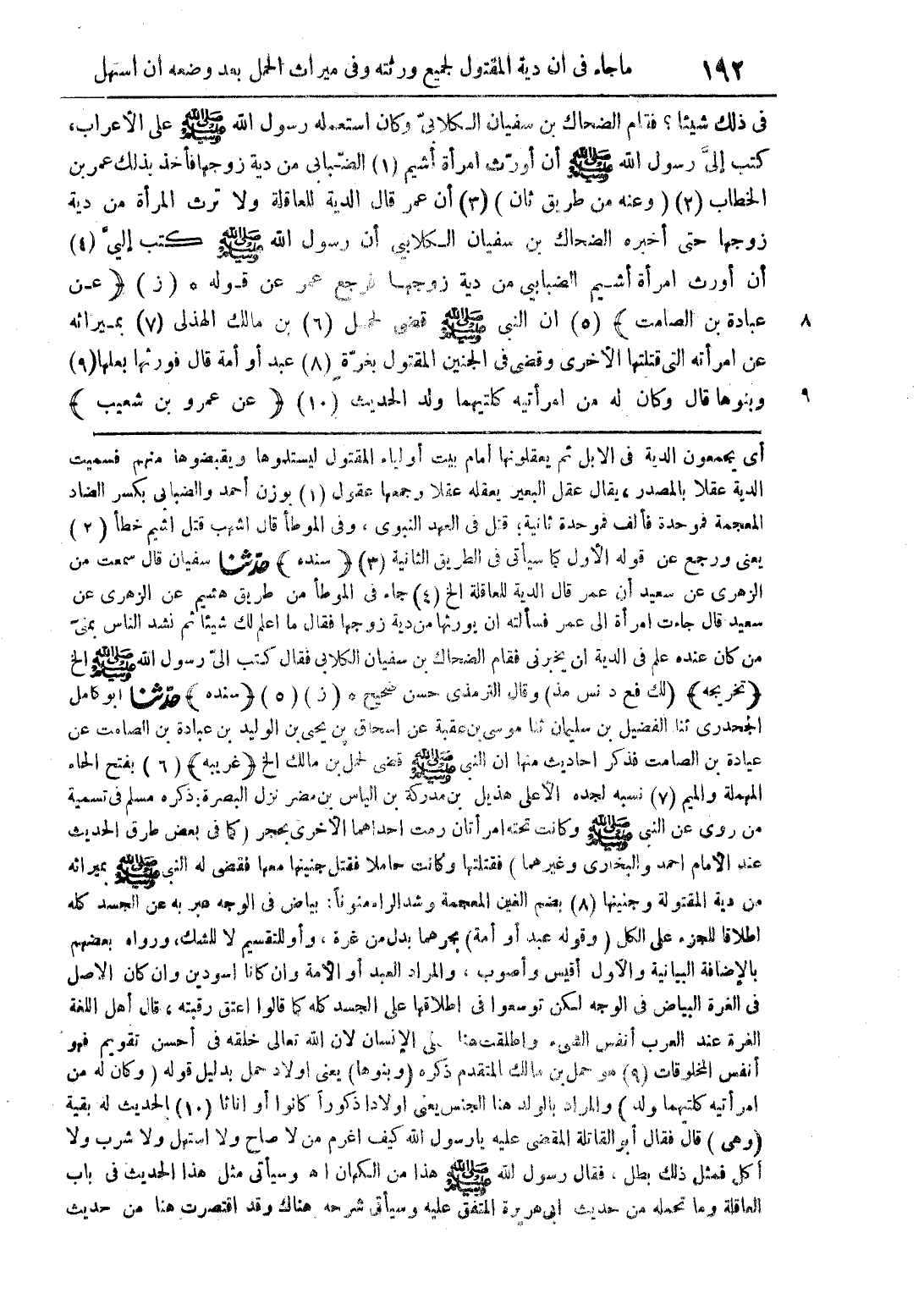 في ذلك شيئًا؟ فقام الضحاك بن سفيان الكلابيّ وكان استعمله رسول الله (صلى الله عليه وسلم) على الأعراب، كتب إلىَّ رسول الله (صلى لله عليه وسلم) أن أورّث امرأة أشيم (1) الضّبابي من دية زوجها فأخذ بذلك عمر بن الخطاب (2) (وعنه من طريق ثان) (3) أن عمر قال الدية للعاقلة ولا ترث المرأة من دية زوجها حتى أخبره الضحاك بن سفيان الكلابي أن رسول الله (صلى الله عليه وسلم) كتب إلىّ (4) أن أورث امرأة أشيم الضبابي من دية زوجها رجع عمر عن قوله (ز) (عن عبادة بن الصامت) (5) أن النبي (صلى الله عليه وسلم) قضي لحمل (6) بن مالك الهذلي (7) بميراثه عن امرأته التي قتلتها الأخرى وقضي في الجنين المقتول بغرّة (8) عبد أو أمة قال فورثها بعلها (9) وبنوها قال وكان له من امرأتيه كلتيهما ولد الحديث (10) (عن عمرو بن شعيب)