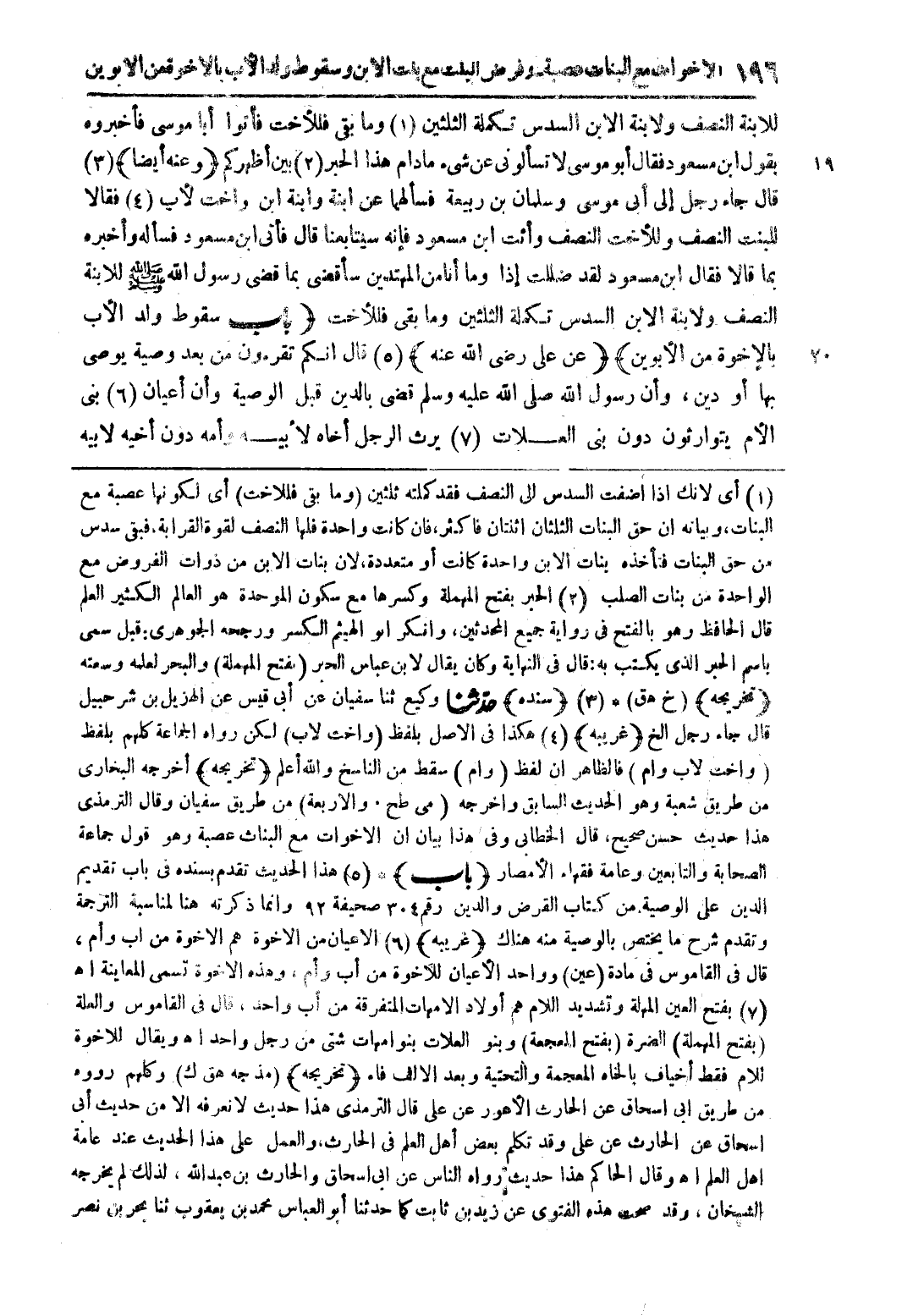 (1) أي لأنك إذا أضفت السدس إلى النصف فقد كملته ثلثين (وما بقي فللأخت) أي لكونها عصبة مع البنات، وبيانه أن حق البنات الثلثان اثنتان فأكثر، فإن كانت واحدة فلها النصف لقوة القرابة، فبقي سدس من حق البنات فتأخذه بنات الصلب (2) الحبر بفتح المهملة وكسرها مع سكون الموحدة هو العالم الكثير العلم قال الحافظ وهو بالفتح وفي رواية جميع المحدثين، وأنكر أبو الهيثم الكسر ورجحه الجوهري، قبل سمي باسم الحبر الذي يكتب به: قال في النهاية وكان يقال لابن عباس الحبر (بفتح المهملة) والبحر لعلمه وسعته (تخريجه) (خ عق* (3) (سنده) حدّثنا وكيع ثنا سفيان عن أبي قيس عن الهزيل بن شرحبيل قال جاء رجل الخ (غريبة) (4) هكذا في الأصل بلفظ وأخت لأب) لكن رواه الجماعة كلهم بلفظ (وأخت لأب وأم) فالظاهر أن لفظ (وام) سقط من الناسخ والله أعلم (تخريجه) أخرجه البخاري من طريق شعبة وهو الحديث السابق وأخرجه (مي طح، والأربعة) من طريق سفيان وقال الترمذي هذا حديث حسن صحيح، قال الخطابي وفي هذا بيان أن الأخوات مع البنات عصبة وهو ول جماعة الصحابة والتابعين وعامة فقهاء الأمصار (باب) (5) هذا الحديث قدم بسنده في باب تقديم الدين على الوصية من كتاب القرض والدين رقم 304 صحيفة 92 وإنما ذكرته هنا لمناسبة الترجمة وتقدم شرح ما يختص بالوصية منه هناك (غريبة) (6) الأعيان من الأخوة هم الأخوة من أب وأم، قال في القاموس في مادة (عين) وواحد الأعيان للأخوة من أب وأم، وهذه الأخوة تسمي المعاينة أهـ (7) بفتح العين المهلة وتشديد اللام هم أولاد الأمهات المتفرقة من أب واحد، قال في القاموس والعلة (بفتح المهملة) الضرة (بفتح المعجمة) وبنو العلات بنو أمهات شتى من رجل واحد أهـ ويقال للأخوة للأم فقط أخياف بالخاء المعجمة والتحتية وبعد الألف فاء (تخريجه) (مذجه هق ك) وكلهم رووه من طريق أبي إسحاق عن الحارث الأعور عن على قال الترمذي هذا حديث لا نعرفه إلا من حديث أبى إسحاق عن الحارث عن على وقد تكلم بعض أهل العلم في الحارث، والعمل على هذا الحديث عند عامة أهل العلم أهـ وقال الحاكم هذا حديث رواه الناس عن أبي إسحاق والحارث الأعور عن على قال الترمذي هذا حديث لا نعرفه إلا من حديث أبي إسحاق عن الحارث عن على وقد تكلم بعض أهل العلم في الحارث، والعمل على هذا الحديث عند عامة أهل العلم أهـ وقال الحاكم هذا حديث رواه الناس عن أبي إسحاق والحارث بن عبد الله، لذلك لم يخرجه الشيخان، وقد صحت هذه الفتوي عن زيد بن ثابت كما حدثنا أبو العباس محمد بن يعقوب ثنا بحر بن نصر