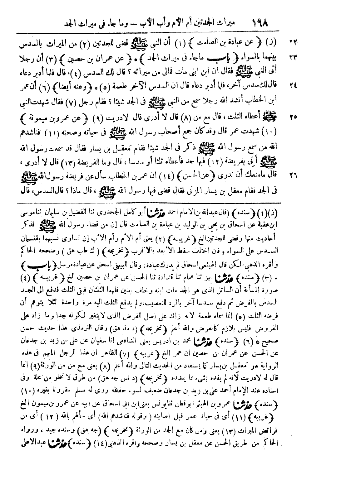 (ز) (1) (سنده) (قال عبدا لله بن الإمام أحمد حدّثنا أبو كامل الجحدري ثنا الفضيل بن سليمان ثنا موسى أبن عقبة عن إسحاق بن يحيي بن الوليد بن عبادة بن الصامت قال إن نم قضاء رسول الله (صلى الله عليه وسلم) فذكر أحاديث منها وقضي للجدتين الخ (غريبة) (2) يعني أم الأم وأم الأب إن تساوي نسبهما يقتسمان السدس على السواء وفان اختلف سقط الأبعد بالأقرب (تخريجه) (ك ط هق) وصححه الحاكم وأقرها لذهبي، لكن قال الهيثمي إسحاق لم يدرك عبادة مرسل (باب) (3) (سنده) حدّثنا بهز ثنا همام ثنا قتادة ثنا الحسن عن عمران بن حصين الخ (غريبة) (4) صورة المسألة أن السائل الذي هو الجد مات أبنه وخلف بنتين فلهما الثلثان فبقي الثلث فدفع إلى الجد السدس بالفرض ثم دفع سدسًا أخر بالرد للتعصيب، ولم يدفع الثلث إليه مرة واحدة لئلا يتوهم أن فرضه الثلث (5) إنما سماه طعمه لأنه زائد على أصل الفرض الذي لا يتغير لكونه جدًا وما زاد على الفروض فليس بلازم كالفرض والله أعلم (تخريجه) (د مذهق) وقال الترمذي هذا حديث حسن صحيح (6) (سنده) حدّثنا محمد بن إدريس يعني الشافعي أنا سفيان عن علي بنزيد بن جدعان عن الحسن عن عمران بن حصين أن عمر الخ (غريبة) (7) الظاهر أن هذا الرجل المهم في هذه الرواية هو معقل بن يسار كما يستفاد من الحديث التالي والله أعلم (8) يعني مع من من الورثة (9) إنما قال له لادريت لأنه لم يفده بشيء ما ينشده (تخريجه) (د نس جه هق) من طرق لا تخلو من علة وفي إسناده عند الإمام أحمد على بن زيد بن جدعان ضعيف لسوء حفظه روي له مسلم مقرونًا بغيره (10) (سنده) حدّثنا عمرو بن الهيثم أبو قطن ثنا يونس يعني ابن أبي إسحاق عن أبيه عن عمر بن ميمون الخ (عربية) (11) أي في حياة عمر قبل إصابته (وقوله فناشدهم الله) أي سألهم بالله (12) أي من فرائض الميراث (13) يعني ومن كان مع الجد من الورثة (تخريجه) (جه هق) وسنده جيد، ورواه الحاكم من طريق الحسن عن معقل بن يسار وصححه وأقره الذهبي (14) (سنده) حدّثنا عبد الأعلى