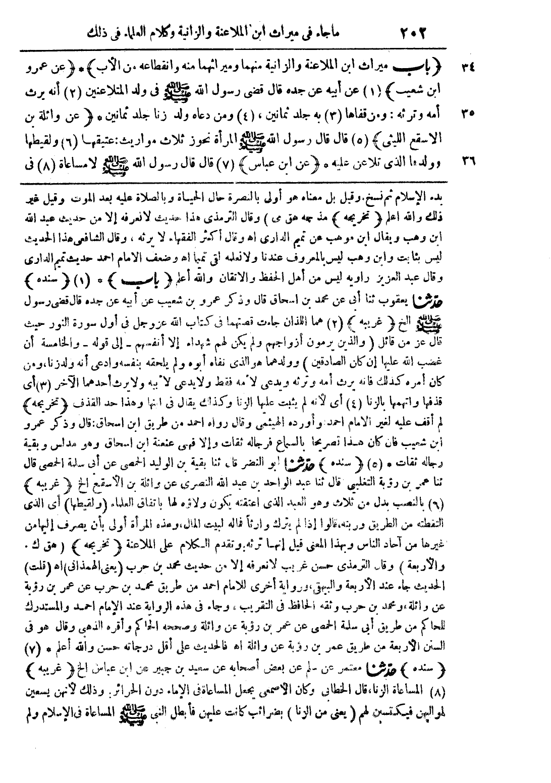 بدء الإسلام ثم نسخ، وقبل بل معناه هو أولى بالنصرة حال الحياة وبالصلاة عليه بعد الموت وقيل غير ذلك والله أعلم (تخريجه) مذجه هق ي) وقال الترمذي هذا حديث لا نعرفه إلا من حديث عبد الله ابن وهب ويقال ابن موهب عن تميم الداري أهـ وقال أكثر الفقهاء لا يرثه، وقال الشافعي هذا الحديث ليس بثابت وأبن وهب ليس بالمعروف عندنا ولا نعلمه لقي تميمًاأ هـ وضعف الإمام أحمد حديث تميم الداري وقال عبد العزيز راوية ليس من أهل الحفظ والإتقان والله أعلم (باب) (1) (سنده) حدّثنا يعقوب ثنا أبي محمد بن إسحاق قال وذكر عمرو بن شعيب عن أبيه عن جده قال قضي رسول الله (صلى الله عليه وسلم) الخ (غريبة) (2) هما اللذان جاءت قصتهما في كتاب الله عز وجل في أول سورة النور حيث قال عز من قائل (والذين يرمون أزواجهم ولم يكن لهم شهداء إلى أنفسهم - إلى قوله - والخامسة أن غضب الله عليها إن كان الصادقين) وولدهما هو الذي نفاه أبوه ولم يلحقه بنفسه وأدعي أنه ولد زنا، ومن كان أمره كذلك فإنه يرث أمه وترثه ويدعي لأمه فقط ولا يدعي لأبيه ولا يرث أحدهما الآخر (3) أي قذفها واتهمهما بالزنا (4) أي لأنه لم يثبت عليها الزنا وكذلك يقال في أبنها وهذا حد القذف (تخريجه) لم أقف عليه لغير الإمام أحمد وأورده الهيثمي وقال رواه أحمد من طريق ابن إسحاق: قال وذكر عمر ابن شعيب فإن كان هذا تصريحًا بالسماع فرجاله ثقات وغلا فهي عنعنة اب إسحاق وهو مدلس وبقية رجاله ثقات (5) (سنده) حدّثنا أبو النضر قال ثنا بقية بن الوليد الحمصي عن أبي سلمة الحمصي قال ثنا عمر بن رؤية التغلبي قال ثنا عبد الواحد بن عبد الله النصري عن وائلة بن الأسقع الخ (غريبة) (6) بالنصب بدل من ثلاث وهو العبد الذي أعتقته يكون ولاءه لها باتفاق العلماء (ولقيطها) أي الذي التقطته من الطيرق وربته، قالوا إذا لم يترك وارثأ فماله لبيت المال، وهذه المرأة أولى بأن يصرف إليها من غيرها من آحاد الناس وبهذا المعني قيل إنها ترثه وتقدم الكلام على الملاعنة (تخريجه) (هق ك، والأربعة) وقال الترمذي حسن غريب لا نعرفه إلا من حديث محمد بن حرب (يعني الهمذاني) أهـ (قلت) الحديث جاء عند الأربعة والبيهقي، ورواية أخرى للإمام أحمد من طريق محمد بن حرب عن عمر بن رؤية عن وائلة، ومحمد بن حرب وثقة الحافظ في التقريب، وجاء في هذه الرواية عند الإمام أحمد والمستدرك للحاكم من طريق أبي سلمه الحمصي عن عمر بن رؤية عن وائلة وصححه الحاكم وأقره الذهبي وقال هو في السنن الأربعة من طريق عمر بن رؤية عن وائلة أهـ فالحديث على اقل درجاته حسن والله أعلم (7) (سنده) حدّثنا معتمر عن سلم عن بعض أصحابه عن سعيد بن جبير عن ابن عباس الخ (غريبة) (8) المساعاة الزنا، قال الخطابي وكان الأصمعي يجعل المساعاة في الإماء دون الحرائر، وذلك لأنهن يسعين لمواليهن فيكتسبن لهم (يعني من الزنا) بضرائب كان عليهن فأبطل النبي (صلى الله عليه وسلم) المساعاة في الإسلام ولم