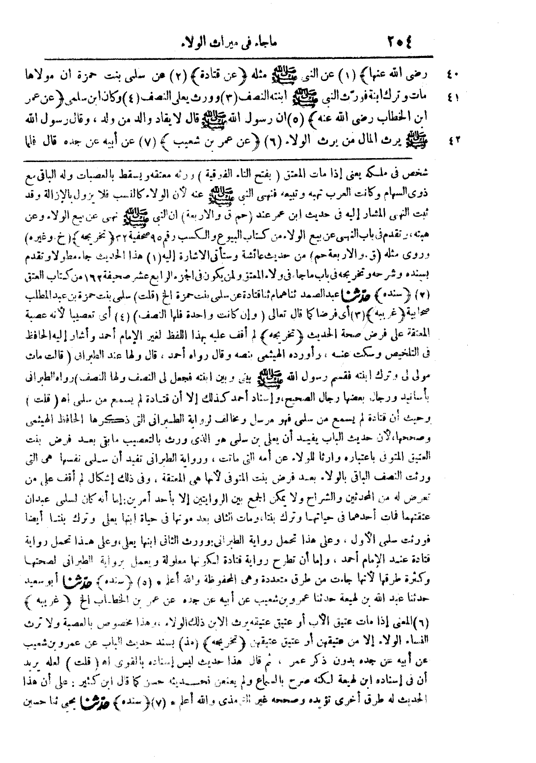 شخص في ملكه يعني إذا مات المعتق (بفتح التاء الفوقية) ورثه معتقه ويسقط بالعصيات وله الباقي مع ذوي السهام وكانت العرب تهبه وتبيعه فنهى النبي (صلى الله عليه وسلم) عنه لأن الولاء كالنسب فلا يزول بالإزالة، قد ثبت النهي المشار غليه في حديث ابن عمر عند (حم ق والأربعة) أن النبي (صلى الله عليه وسلم) نهى عن بيع الولاء وعن هبته، وتقدم في باب النهي عن بيع الولاء من كتاب البيوع والكسب رقم 95 صحيفة 32 (تخريجه) (خ. وغيره) وروى مثله (ق. والأربعة حم) من حديث عائشة وستأتي الإشارة إليه (1) هذا الحديث جاء مطولاً وتقدم بسنده وشرحه وتخريجه في باب ما جاء في وراء المعتق ولمن يكون في الجزء الرابع عشر صحيفة (162) من كتاب العتق (3) (سنده) حدّثنا عبد الصمد ثناهما ما ثنا قتادة عن سلمى بنت حمزة الخ (قلت) سلمى بنت حمزة بن عبد المطلب صحابية (غريبة) (3) أي فرضًا كما قال تعالى (وإن كانت واحدة فلها النصف) (4) أي تعصيبًا لأنه عصبة المعتقة على فرض صحة الحديث (تخريجه) لم أقف عليه بهذا اللفظ لغير الإمام أحمد واشار إليه الحافظ في التلخيص وسكت عنه، وأورده الهيثمي بنصه وقال رواه أحمد، قال ولها عند الطبراني (قال مات مولى لي وترك ابنته فقسم رسول الله (صلى الله عليه وسلم) بيني وبين أبنته فجعل لي النصف ولها النصف) رواه الطبراني بأسانيد ورجال بعضها رجال الصحيح، وإسناد أحمد كذلك إلا أن قتادة لم يسمع من سلمي أهـ (قلت) وحيث أن قتادة لم يسمع من سلمي فهو مرسل ومخالف لرواية الطبراني التي ذكرها الحافظ الهيثمي وصححها، لأن حديث الباب يفيد أن يعلي بن سلمي هو الذي ورث بالتعصب ما بقي بعد فرض بنت العتيق المتوفى باعتباره وارثًا للولاء عن أمه التي ماتت، ورواية الطبراني تفيد أن سلمي نفسها هي التي ورثت النصف الباقي بالولاء بعد فرض بنت المتوفى لأنها هي المعتقة، وفي ذلك إشكال لما أقف على من تعرض له من المحدثين والشراح ولا يمكن الجمع بين الروايتين إلا بأحد أمرين إما أنه كان لسلمي عبدان عتقتهما فمات أحدهما في حياتها وترك بنتًا، ومات الثاني بعد موتها في حياة ايتها يعلي وترك بنتًا أيضًا فورثت سلمي الأول، وعلى هذا تحمل رواية الطبراني، وورث الثاني أبنها يعلي، وعلى هذا تحمل رواية قتادة عند الإمام أحمد، وإما أن تطرح رواية قتادة لكونها معلولة ويعمل برواية الطبراني لصحتها وكثرة طرقها لأنها جاءت من طرق متعددة وهي المحفوظة والله أعلم (5) (سنده) حدّثنا أبو سعيد حدثنًا عبدا لله بن لهيعة حدثنا عمرو بن شعيب عن أبيه عن جده عن عمر بن الخطاب الخ (غريبة) (6) المعني إذا مات عتيق الأب أو عتيق عتيقة يرث الابن ذلك الولاء، وهذا مخصوص بالعصبة ولا ترث النساء الولاء إلا من عتيقهن أو عتيق عتيقهن (تخريجه) (مذ) بسند حديث الباب عن عمرو بن شعيب عن أبيه عن جده بدون ذكر عمر، ثم قال هذا حديث ليس إسناده بالقوى أهـ (قلت) لعله يريد أن في إسناده ابن لهيعة لكنه صرح بالسماع ولم يعنعن فحديثه حسن كما قال ابن كثير: على أن هذا الحديث له طرق أخرى تؤيده وصححه غير الترمذي والله أعلم (7) (سنده) حدّثنا يحيي ثنا حسين