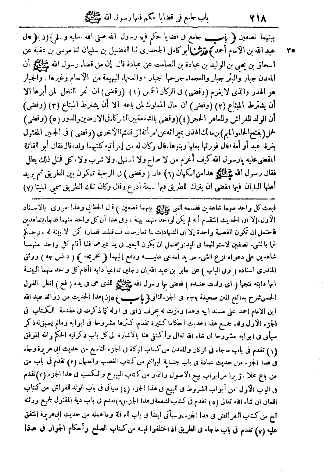 بينهما نصفين (باب جامع في قضايا حكم فيها رسول الله (صلى الله عليه وسلم) (ز) (قال عبد الله بن الإمام أحمد) حدّثنا أبو كامل الجحدري ثنا الفضيل بن سليمان ثنا موسى بن عقبة عن إسحاق بن يحيي بن الوليد بن عبادة بن الصامت عن عبادة قال إن من قضاء رسول الله (صلى الله عليه وسلم) أن المعدن جبار والبئر جبار والعجماء جرحها جبار، والعجماء البهيمة من الأنعام وغيرها، والجار هو الهدر والذي لا يغرم (وقضى) في الركائز الخمس (1) (وقضى) أن ثمر النخل لمن أبرها إلا أن يشترط المبتاع (2) (وقضى) أن مال المملوك لمن باع إلا أن يشترط المبتاع (3) (وقضى) أن الولد للفراش وللعاهر الحجر (4) (وقضى بالشفعة بين الشركاء في الأرضيين والدور (5) وقضي لحمل (بفتح الحاء والميم) بن مالك الهذلي بميراثه عن امرأته التي قتلتها الأخرى (وقضى) في الجنين المقتول بغره عبد أو أمة قال فورثها بعلها وبنوها قال وكان له من امرأتيه كلتيهما ولد، قال فقال أبو القاتلة المقضي عليه يا رسول الله كيف أغرم من لا صاح ولا استهل ولا شرب ولا أكل فمثل ذلك بطل فقال رسول الله (صلى الله عليه وسلم) هذا من الكهان (6) فإن (وقضى) في الرحبة تكون بين الطريق ثم يريد أهلها البنيان فيها فقضى أن يترك للطريق فيها سبعة أذرع وقال وكان تلك الطريق سمي الميتا (7)